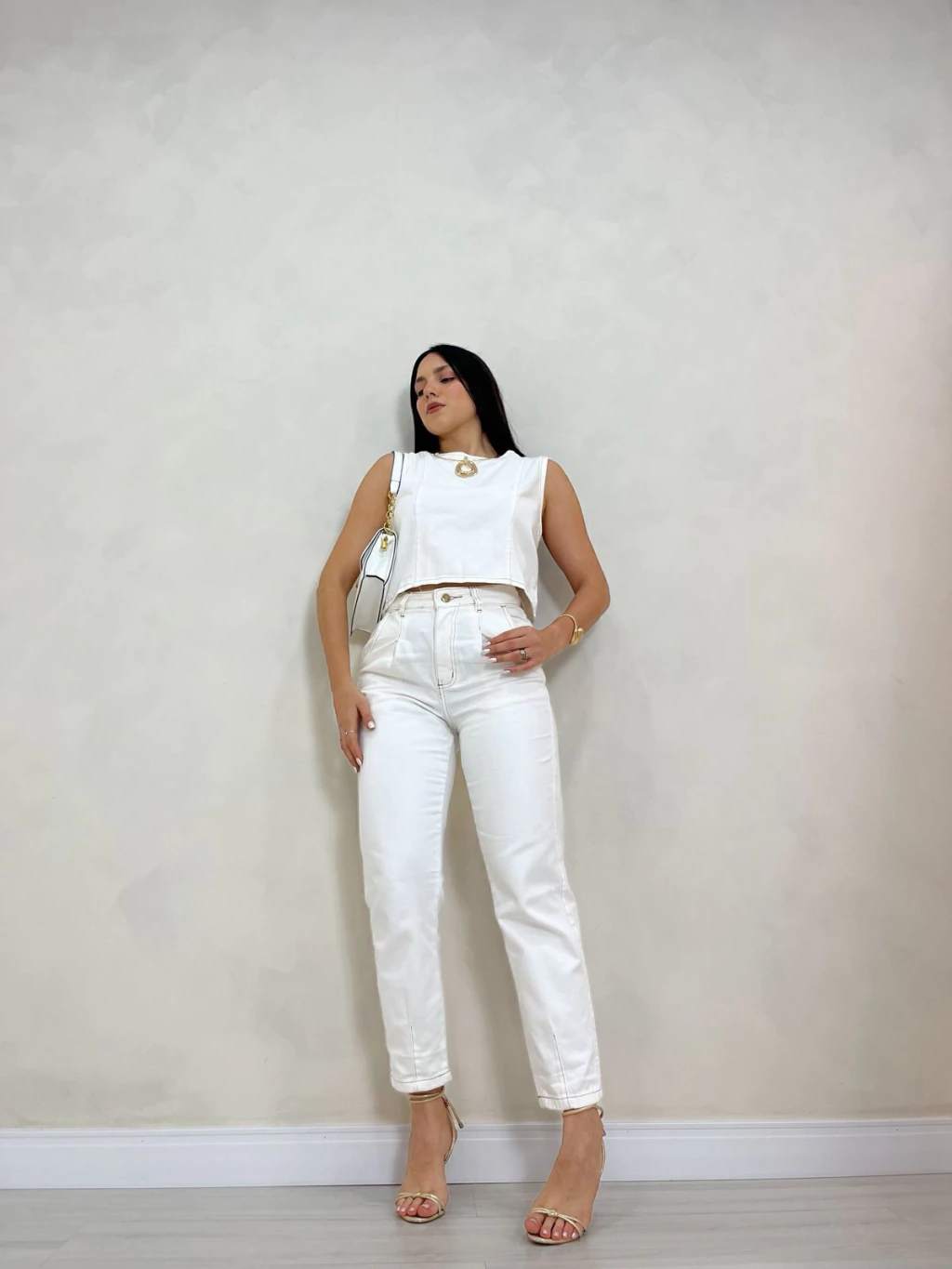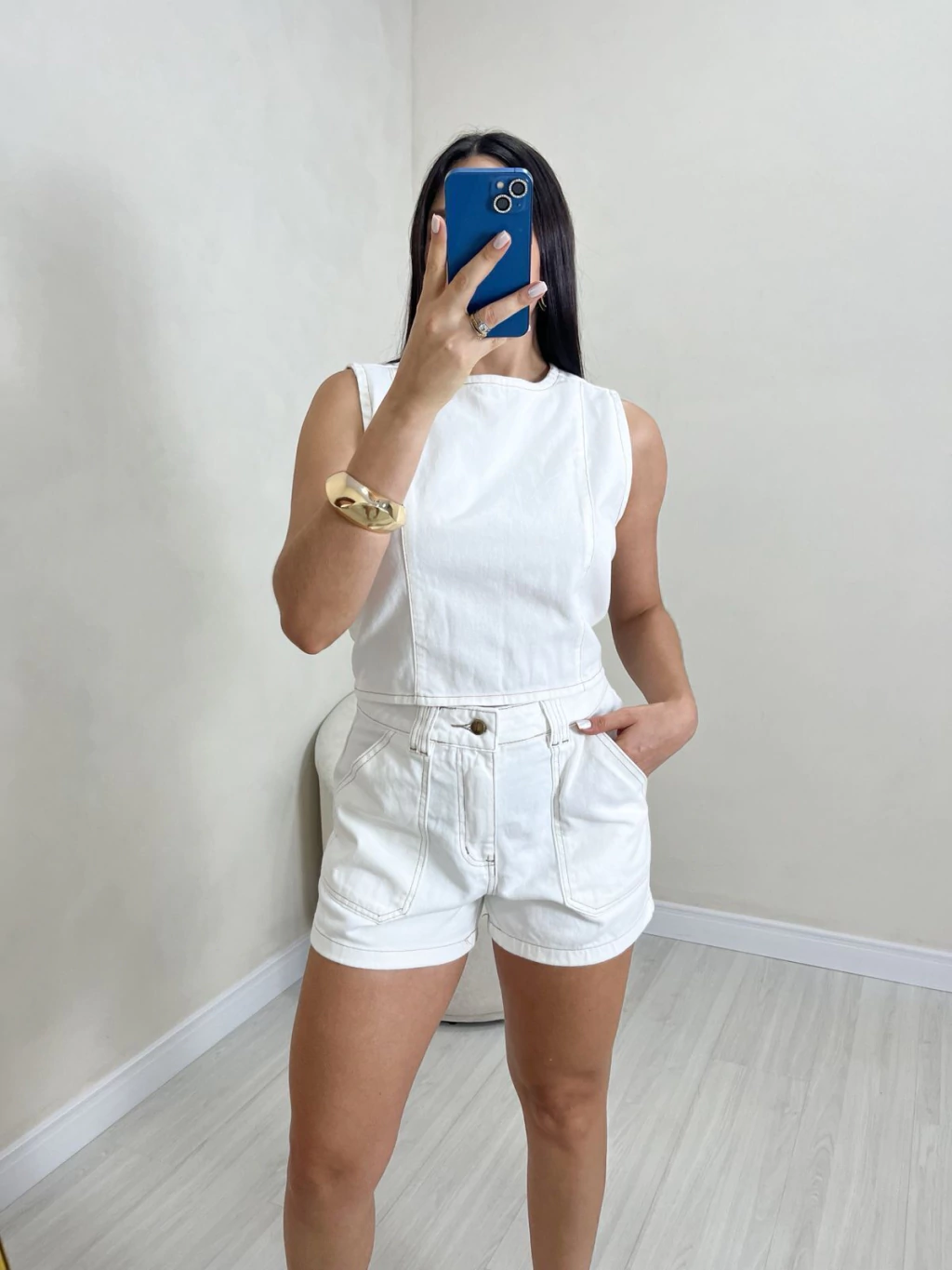 Blusa jeans em lavagem off white. Possui comprimento um pouco mais curto, pespostos em marrom pela peça, fechamento atrás por zíper e um abertura abaixo dele nas costas. Não marca e não fica transparente.