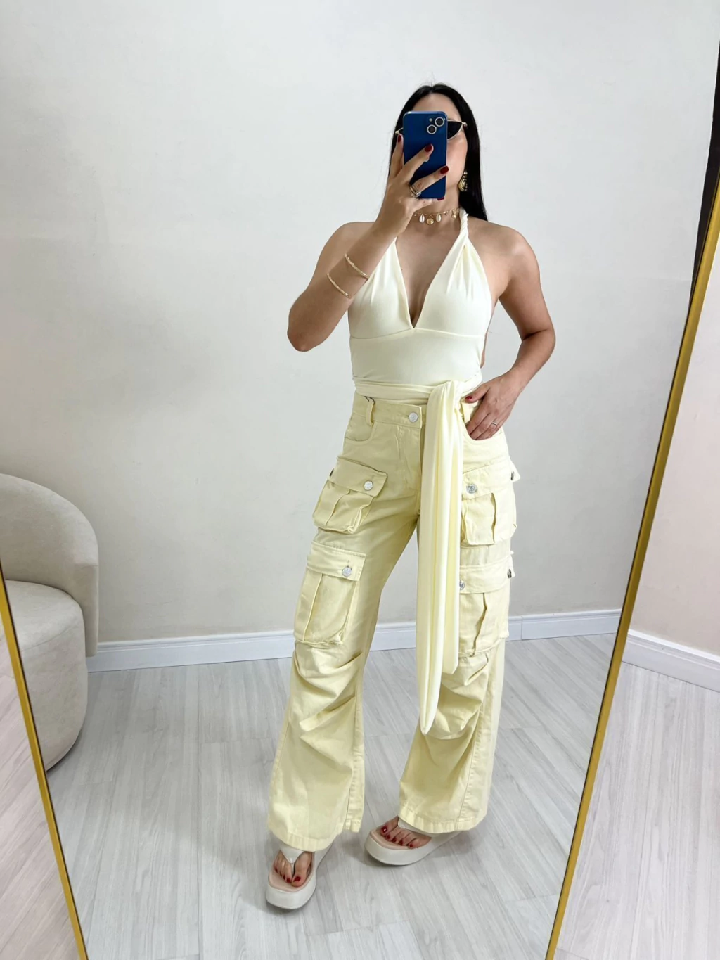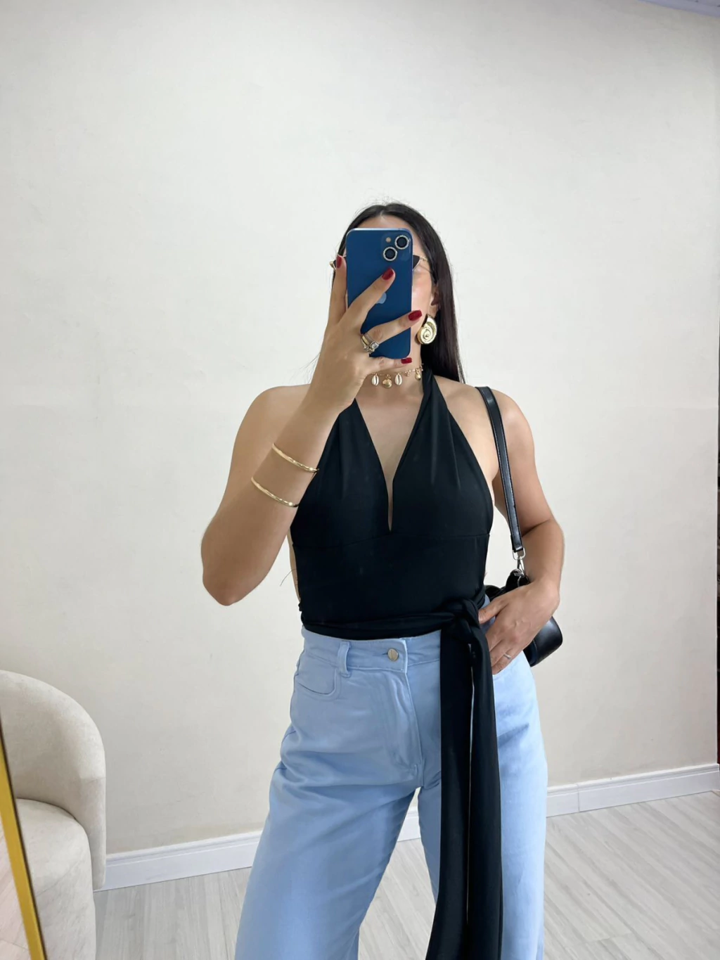 Blusa em poliamida, com decote V. Possui modelo frente única e amarração na cintura. As amarrações permitem você regular o comprimento da blusa e ajustar da maneira que preferir. Possui costas abertas. Não marca e não fica transparente.
