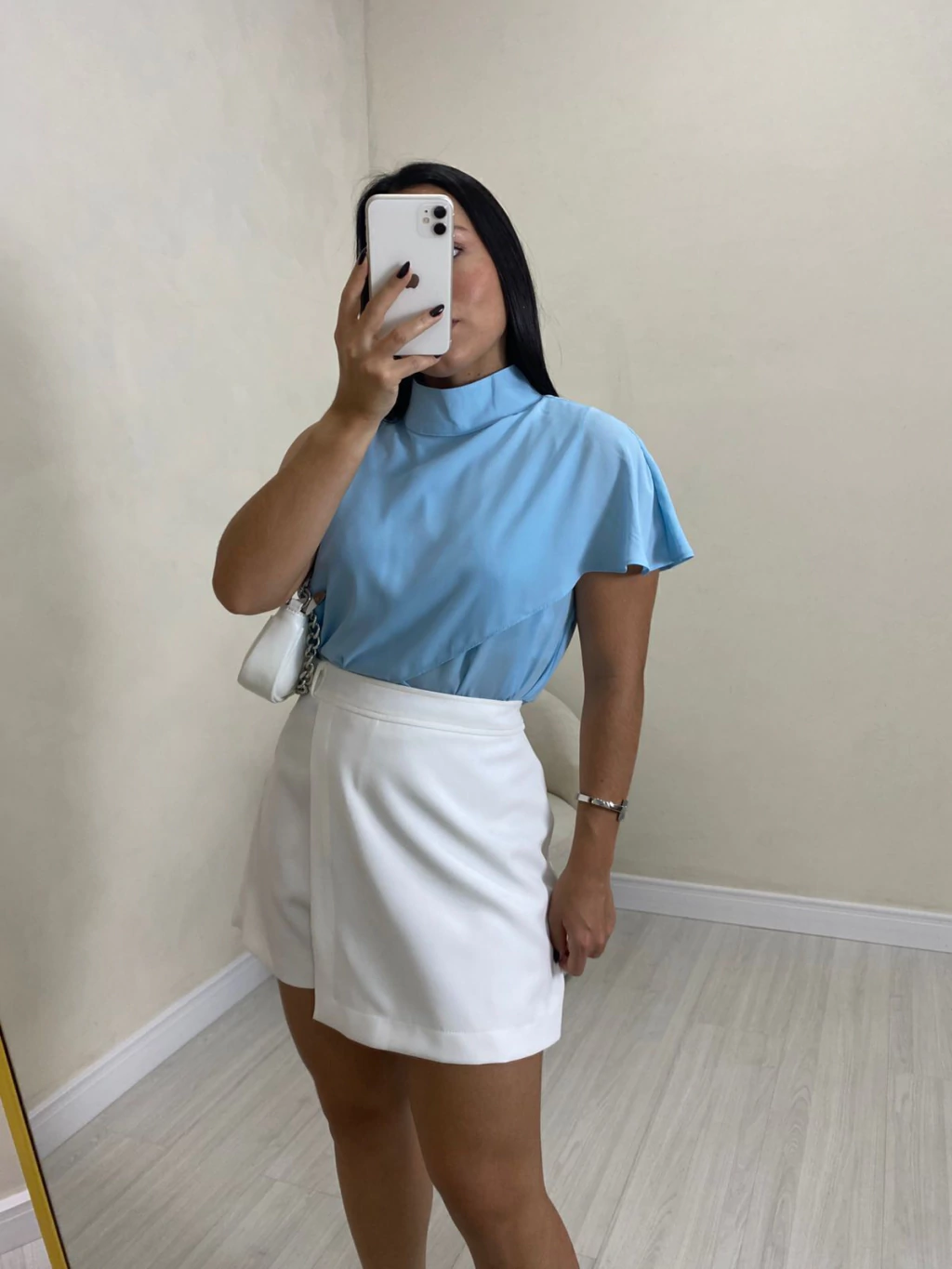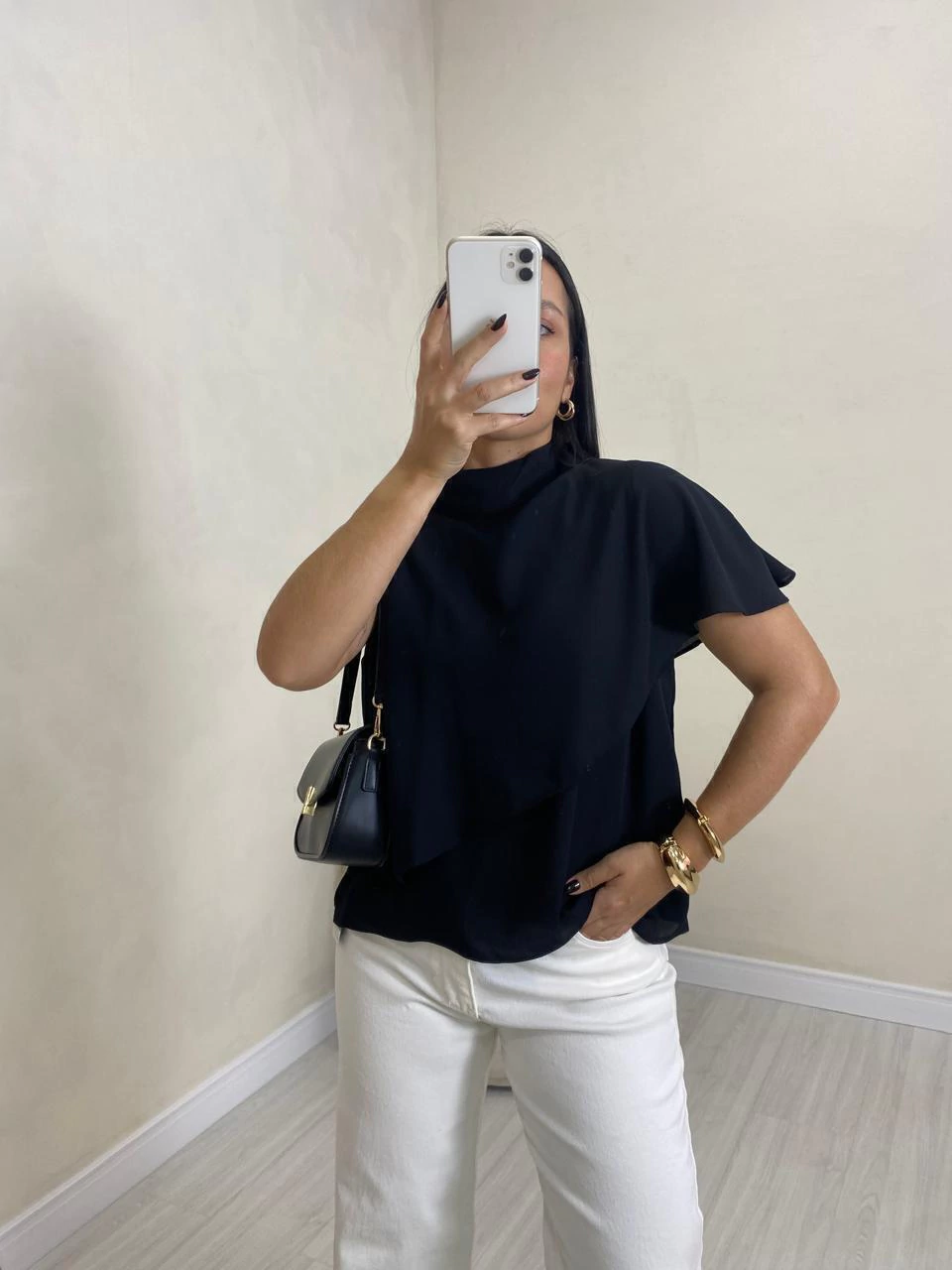 Blusa em chiffon. Possui gola alta com fechamento atrás por dois botões. Possui mangas assimétrica. Modelagem solta ao corpo. Pode ser usada por dentro ou por fora. Não marca e não fica transparente.
