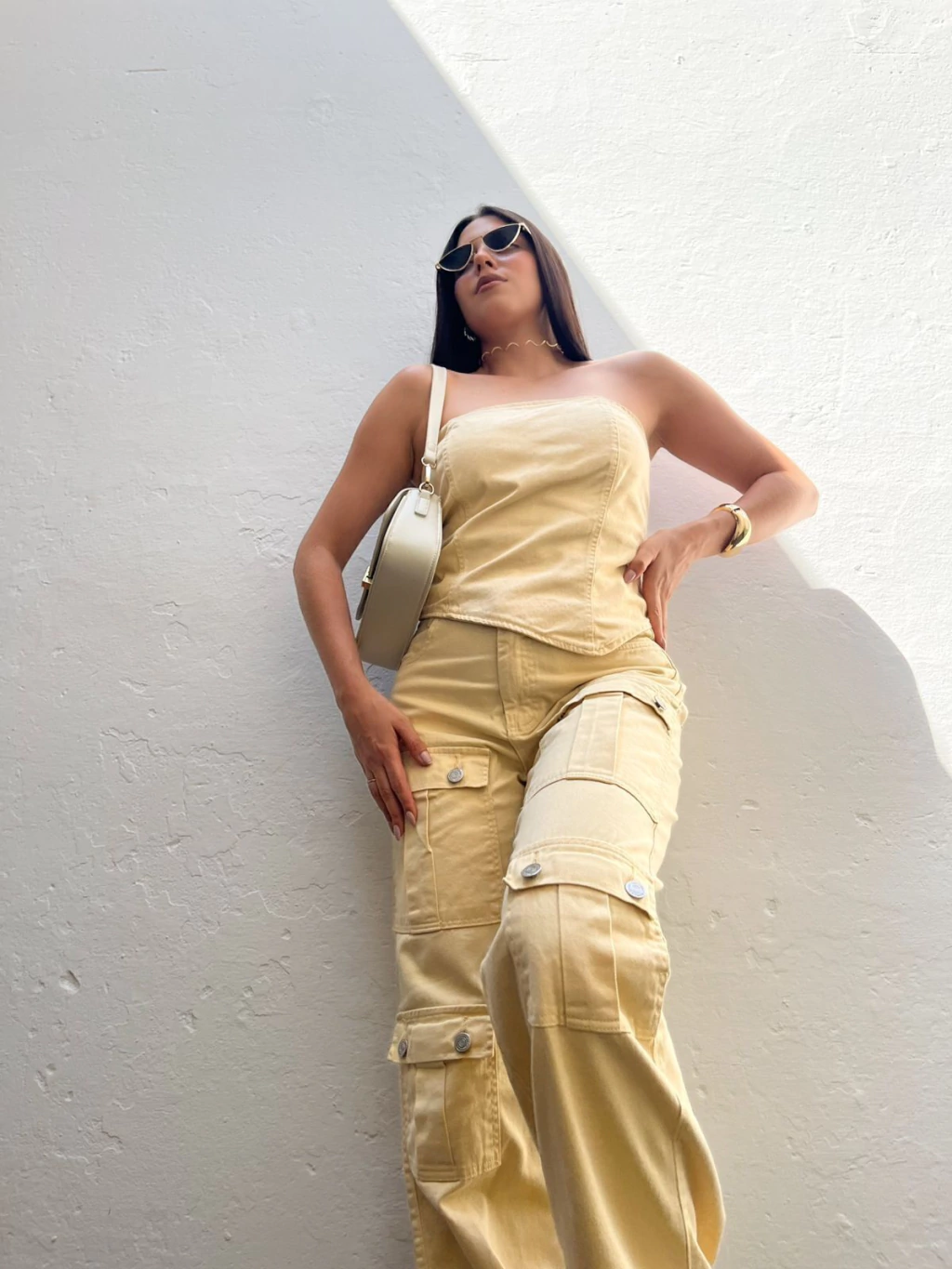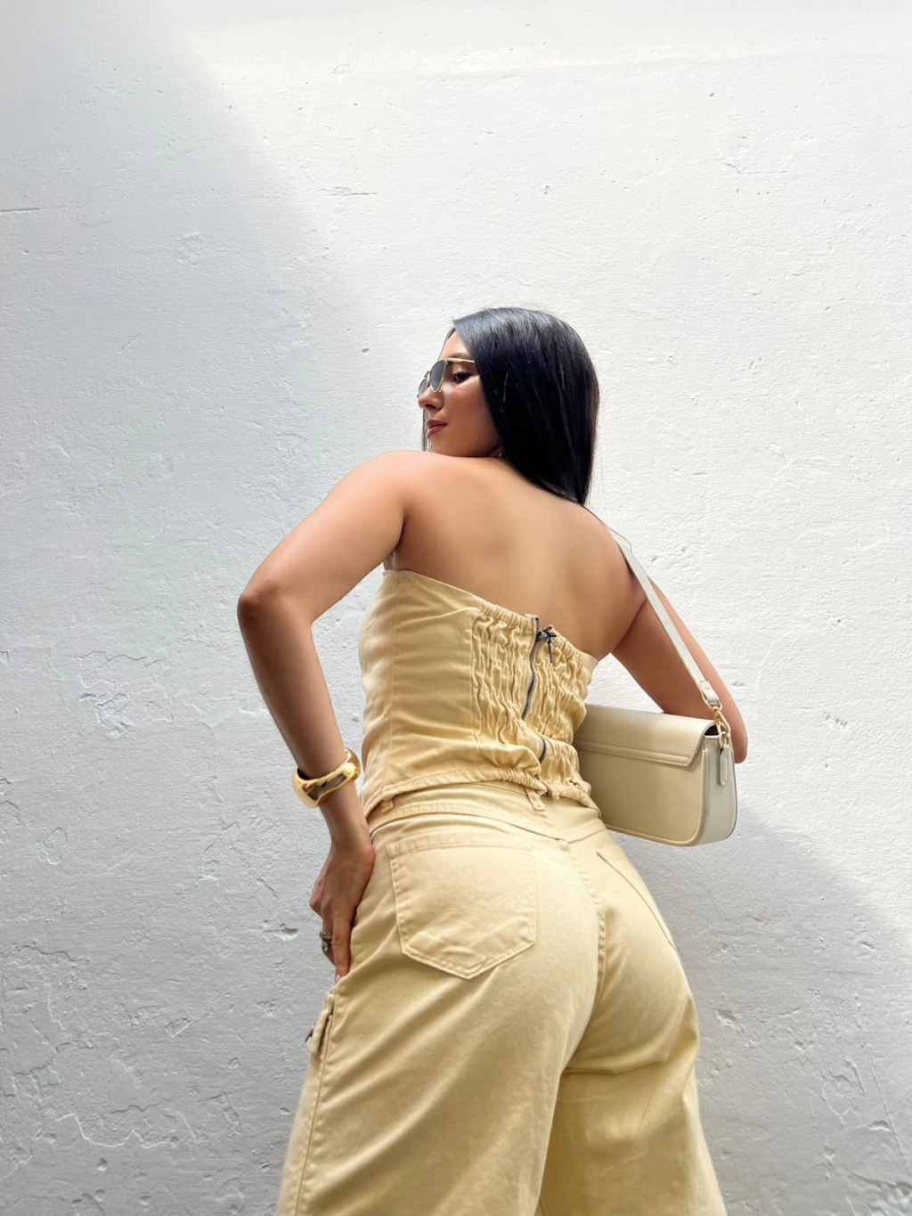 Blusa modelo tomara que caia em jeans. Possui uma lavagem no tom colorido. Possui barra assimétrica, fechamento atrás com zíper e lastex para melhor vestibilidade da peça. Não marca e não fica transparente.