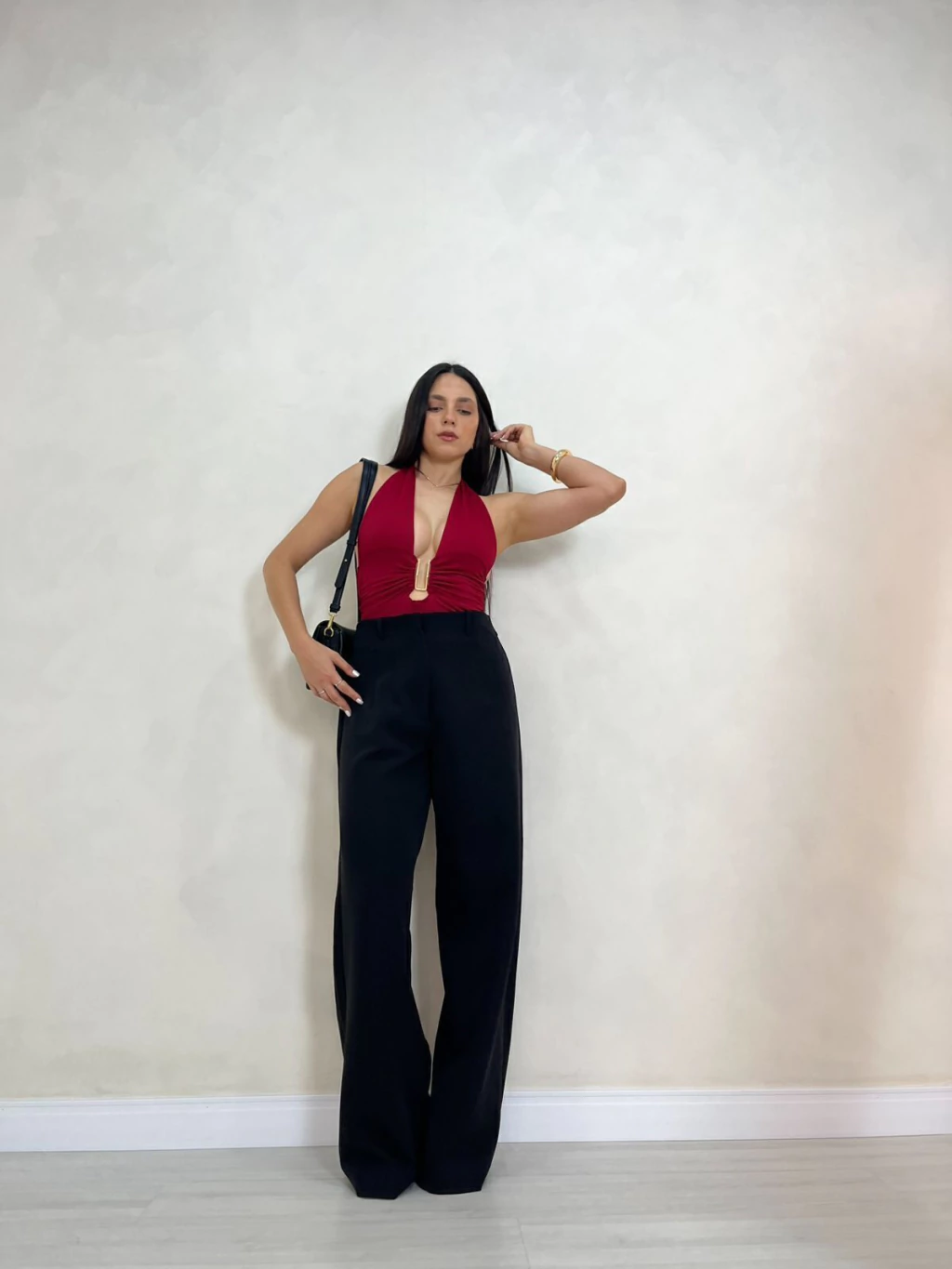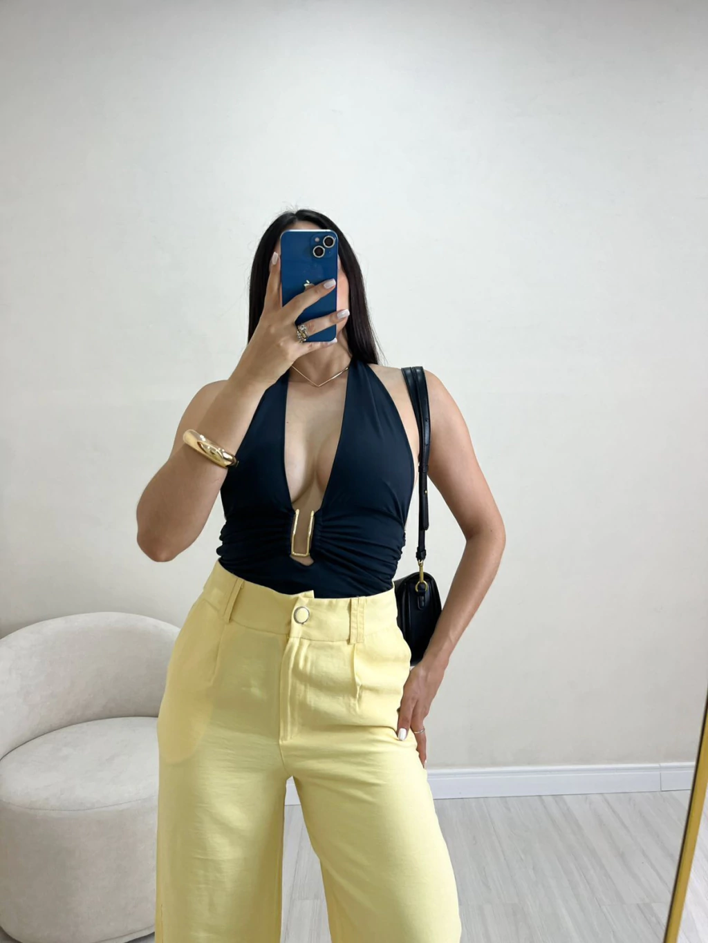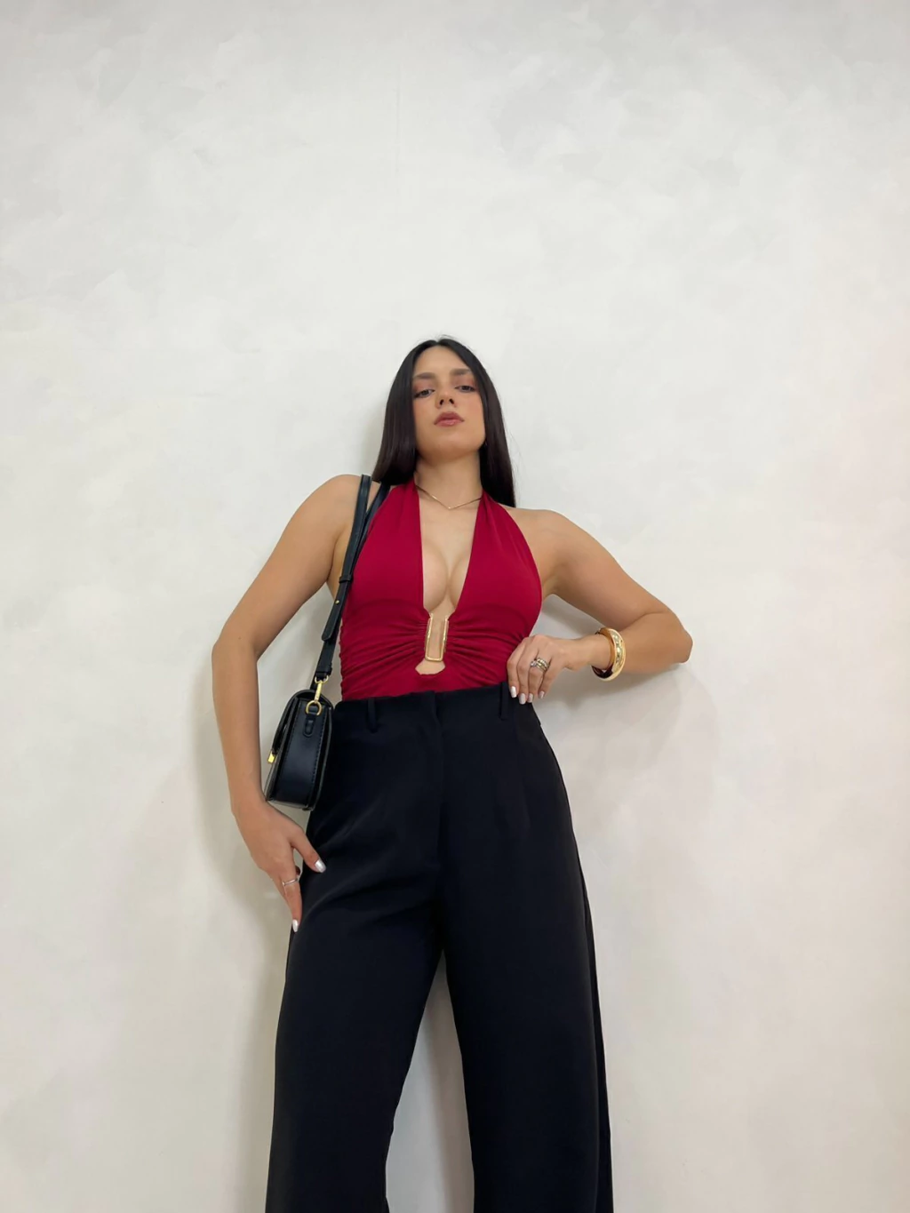 Body em poliamida, com decote frente única. Possui decote profundo com detalhe de um fivela na frente. Possui drapeado nas laterais. Fechamento tradicional por granchos. Modelage ajustada ao corpo, com elastano.