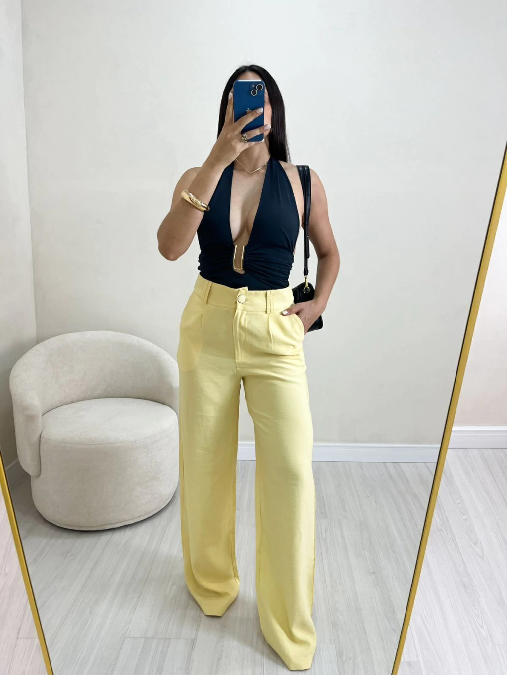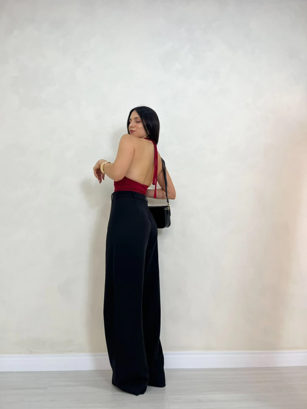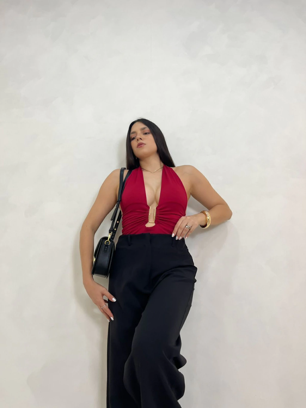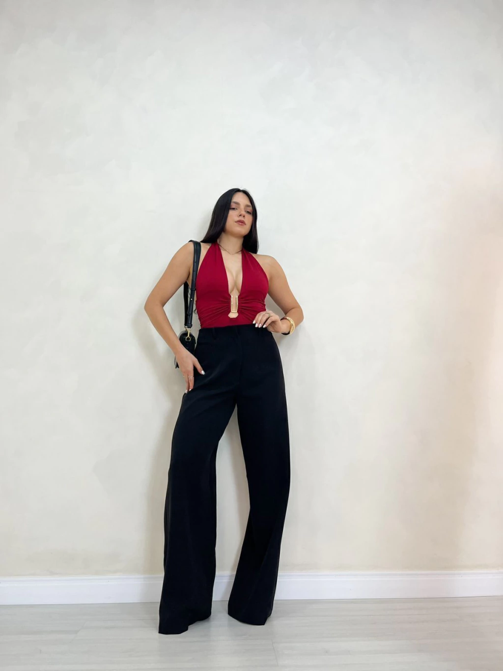 Body em poliamida, com decote frente única. Possui decote profundo com detalhe de um fivela na frente. Possui drapeado nas laterais. Fechamento tradicional por granchos. Modelage ajustada ao corpo, com elastano.