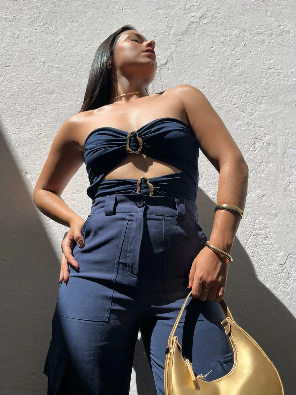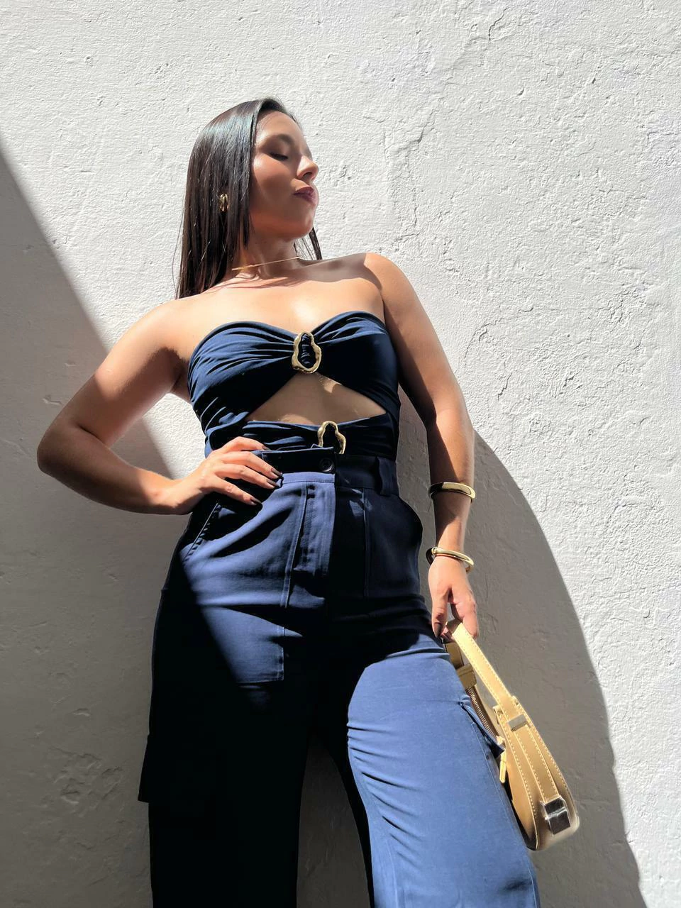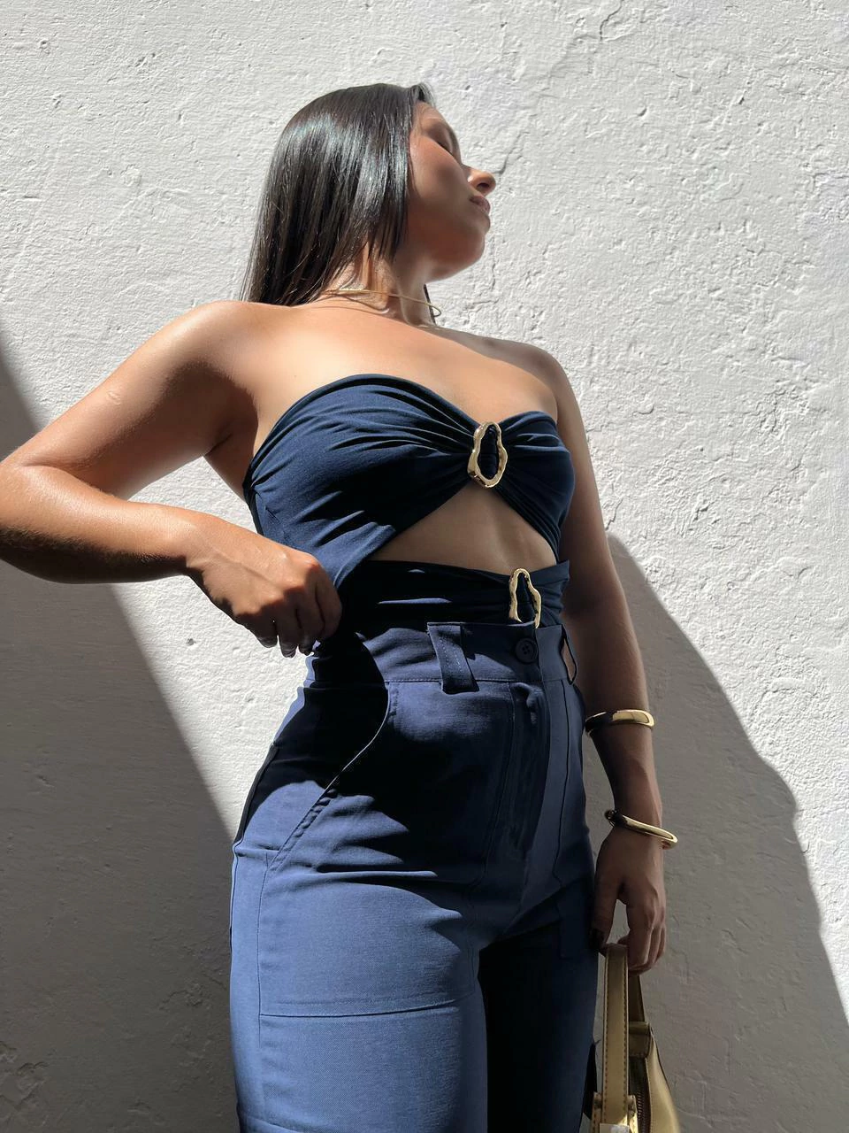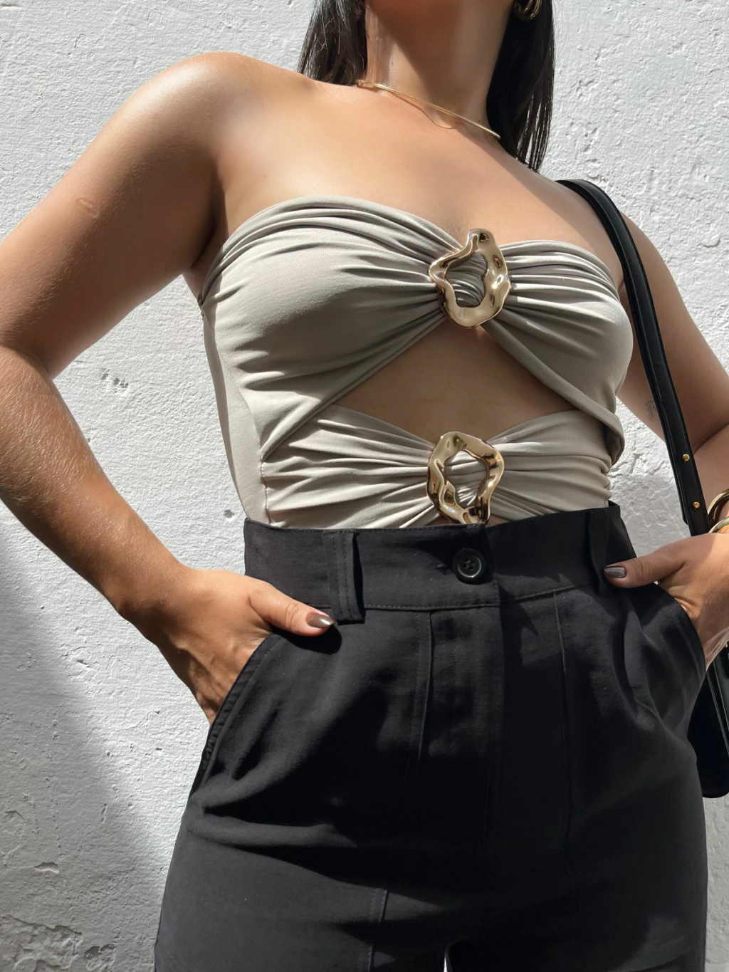 Body em poliamida, modelo tomara que caia. Possui decote mais aberto, recortes na cintura e fivelas métalicas no dourado. Não possui fecho embaixo. Modelagem ajustada ao corpo. Tecido duplo, não marca e não fica transparente.