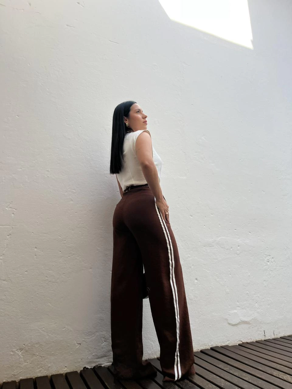 Calça em tecido encorpado, modelagem alfaiataria. Possui cintura alta, com fechamento por botão duplo e zíper. Possui passantes. Possui bolso faca e listras nas laterais. Modelo pantalona, solta ao corpo. Não marca e não fica transparente.