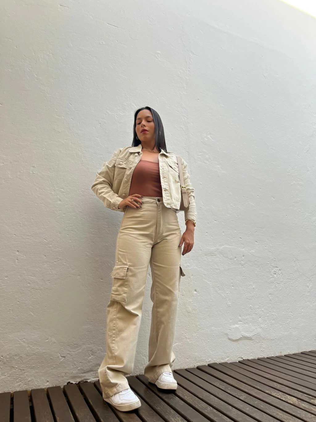 Calça cargo em jeans black. Possui modelo cintura alta e bolsos (frente, atrás e lateral da perna). Possui cós com passantes e fechamento frontal por um botão e zíper. Não possui elastano. Modelagem solta ao corpo e super estilosa.