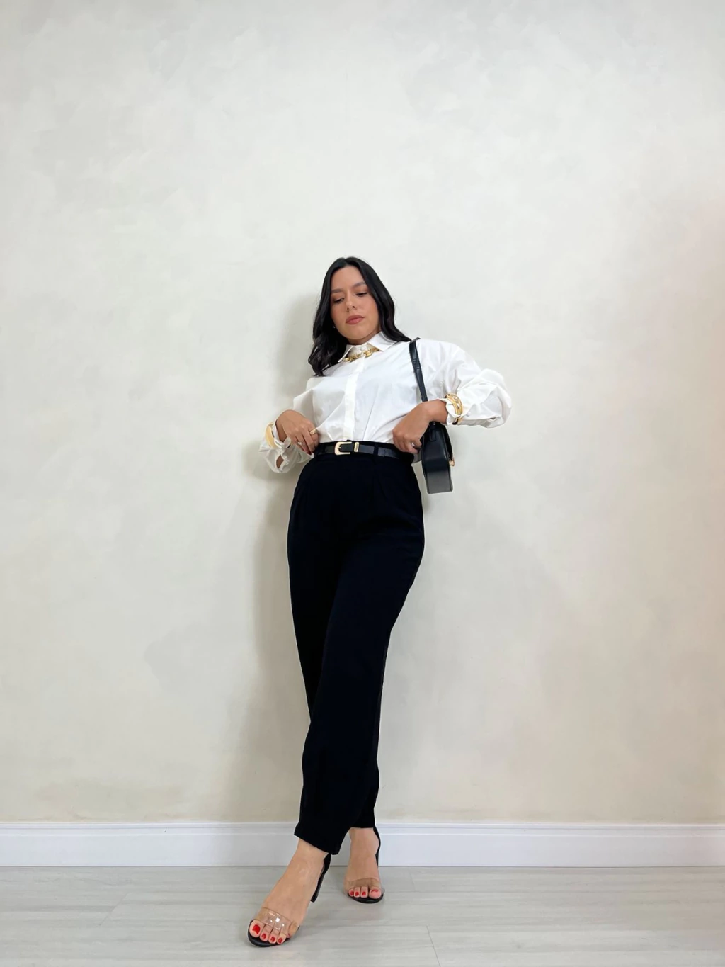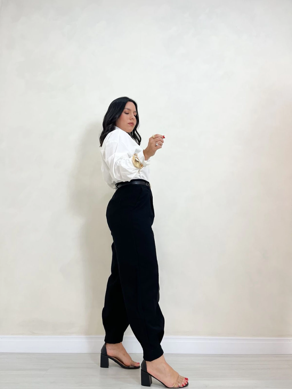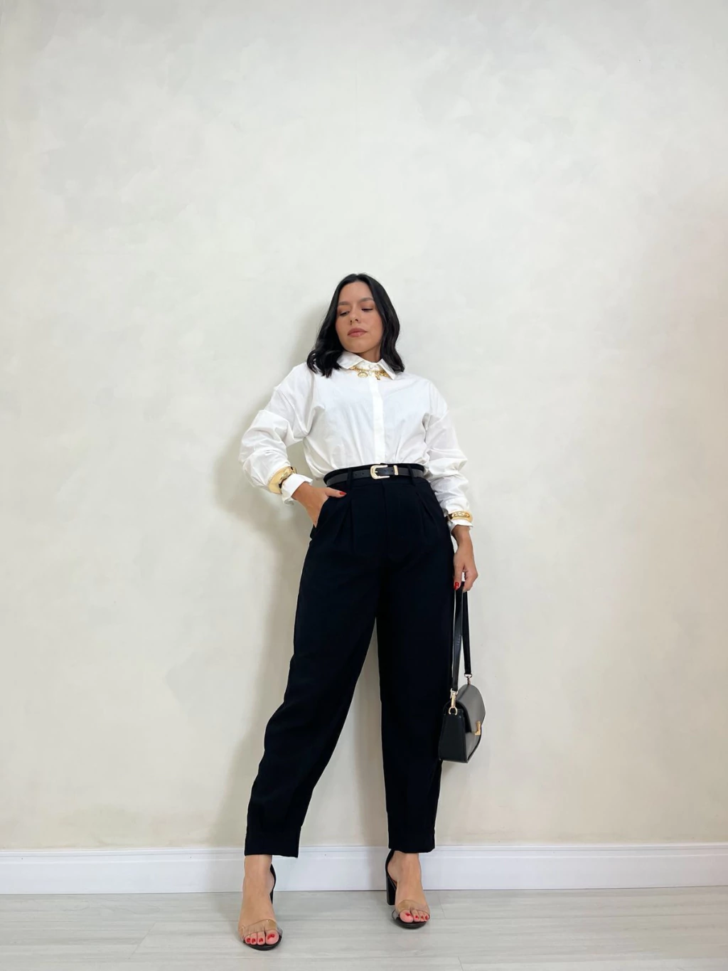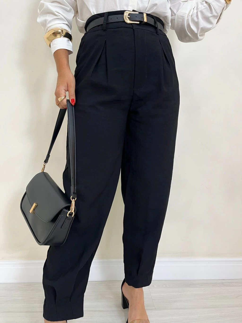 Calça modelo cenoura em tecido marrant. Possui pregas na frente, cós alto com passantes e bolso faca. Atrás possui bolsos também. Modelo com a barra mais justinha. Tecido fluído, não marca e não fica transparente.