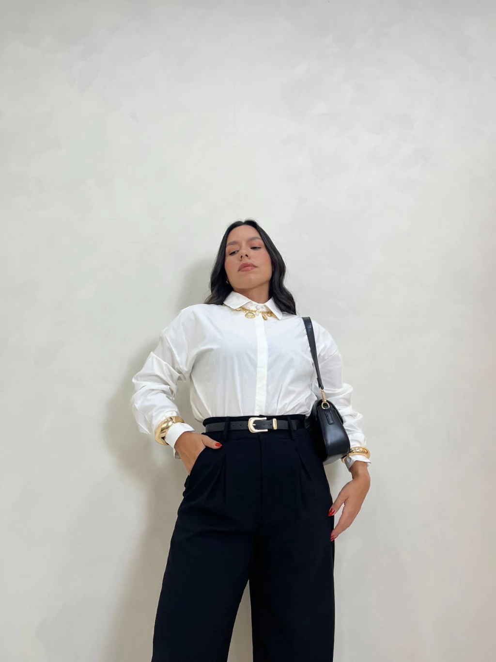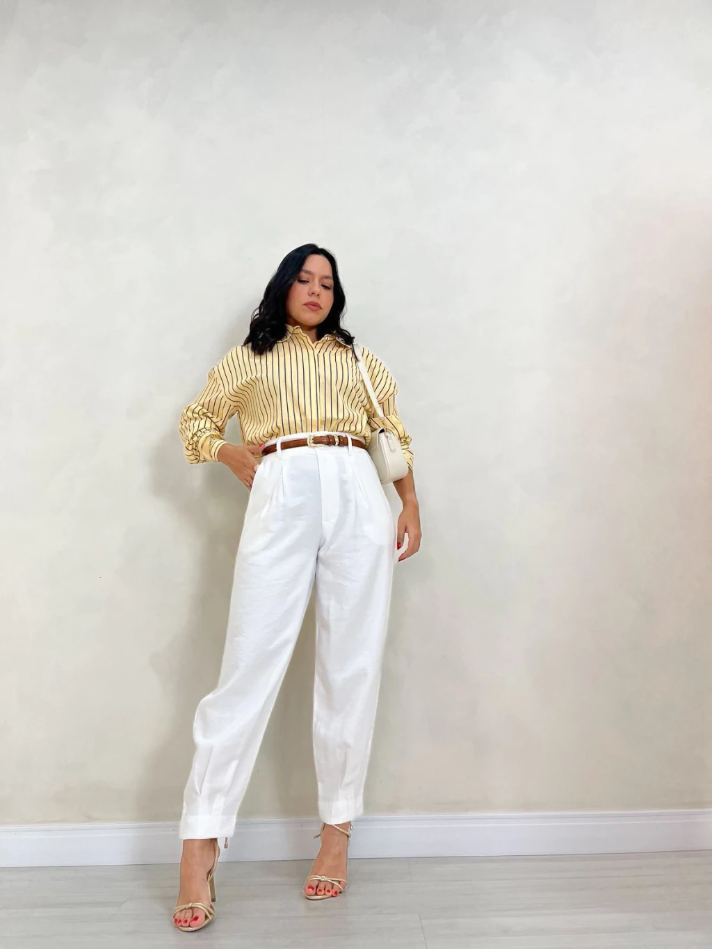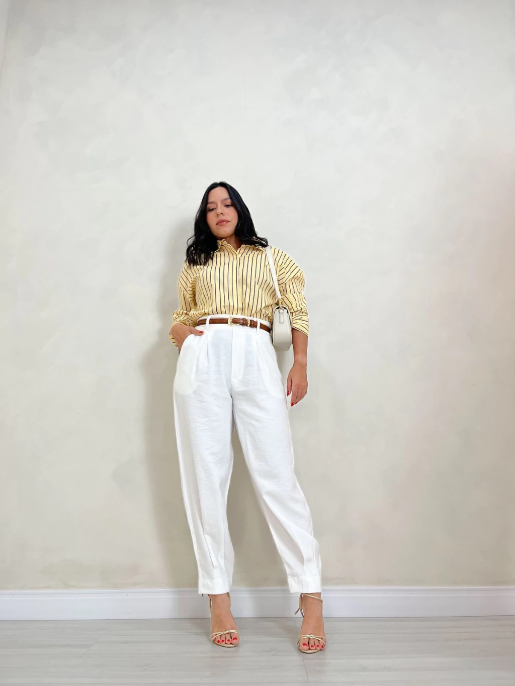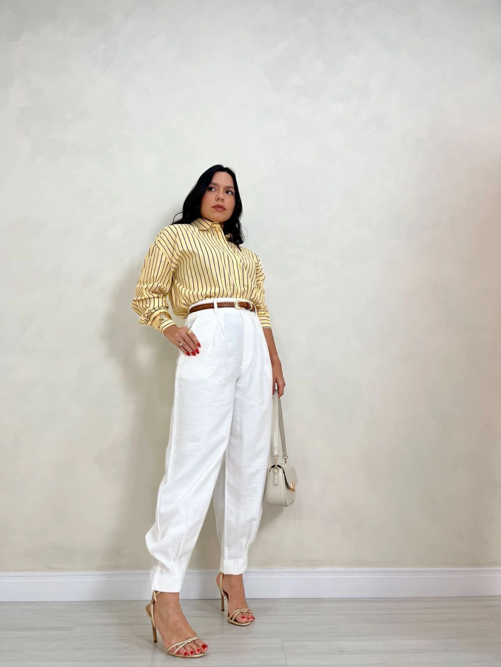 Calça modelo cenoura em tecido marrant. Possui pregas na frente, cós alto com passantes e bolso faca. Atrás possui bolsos também. Modelo com a barra mais justinha. Tecido fluído, não marca e não fica transparente.