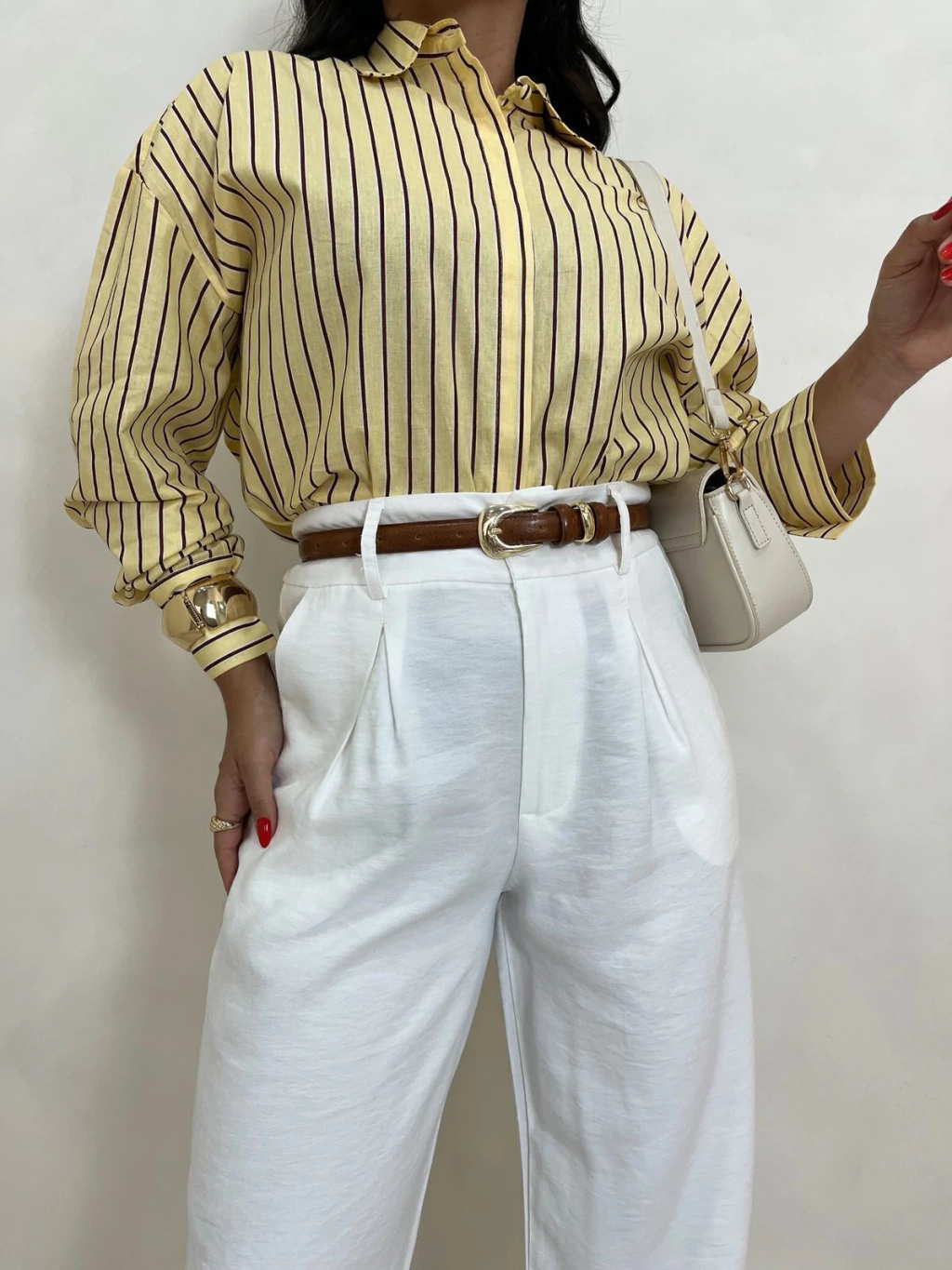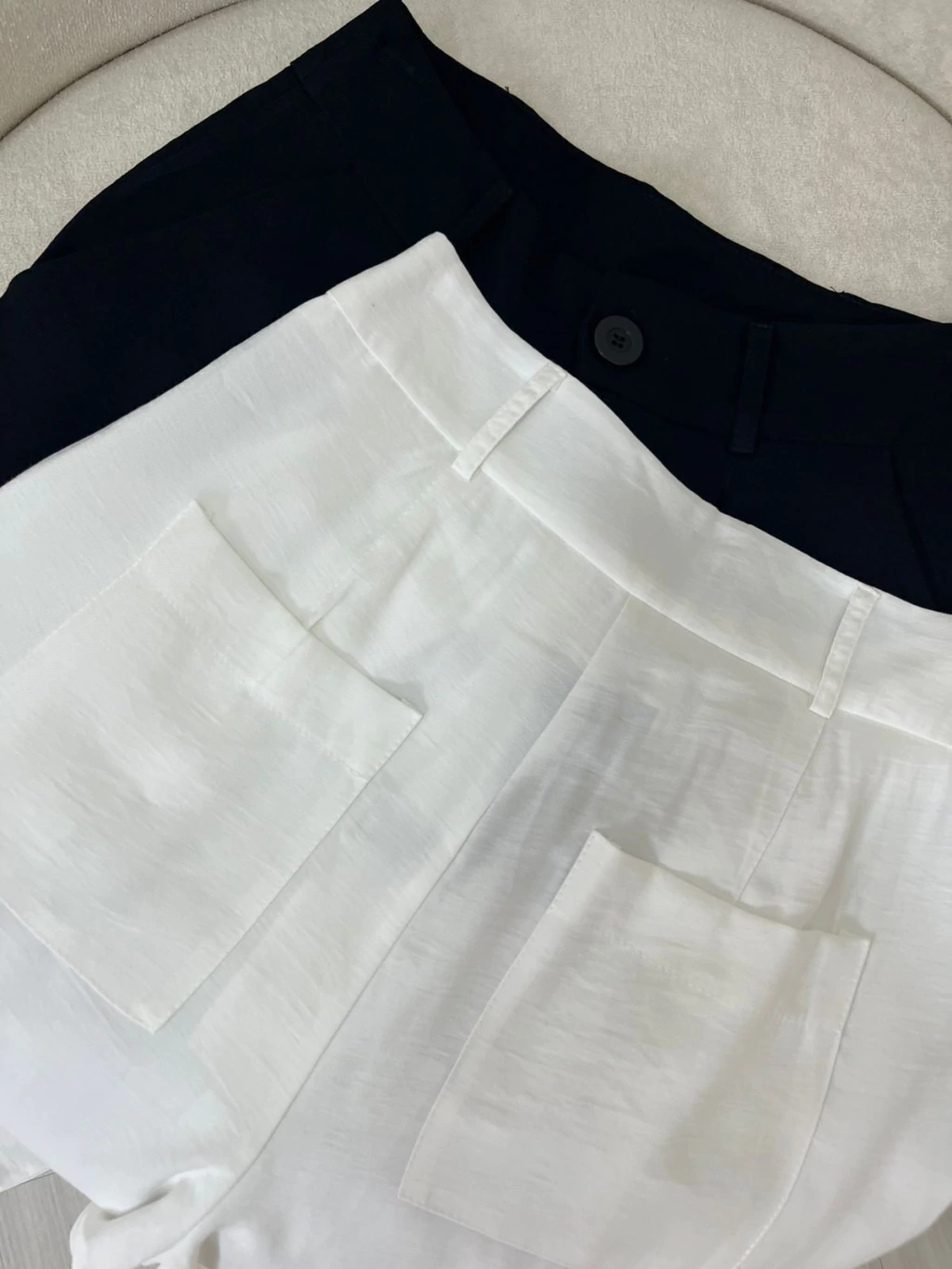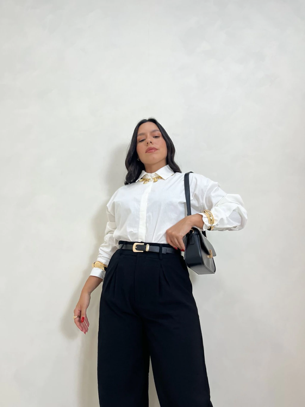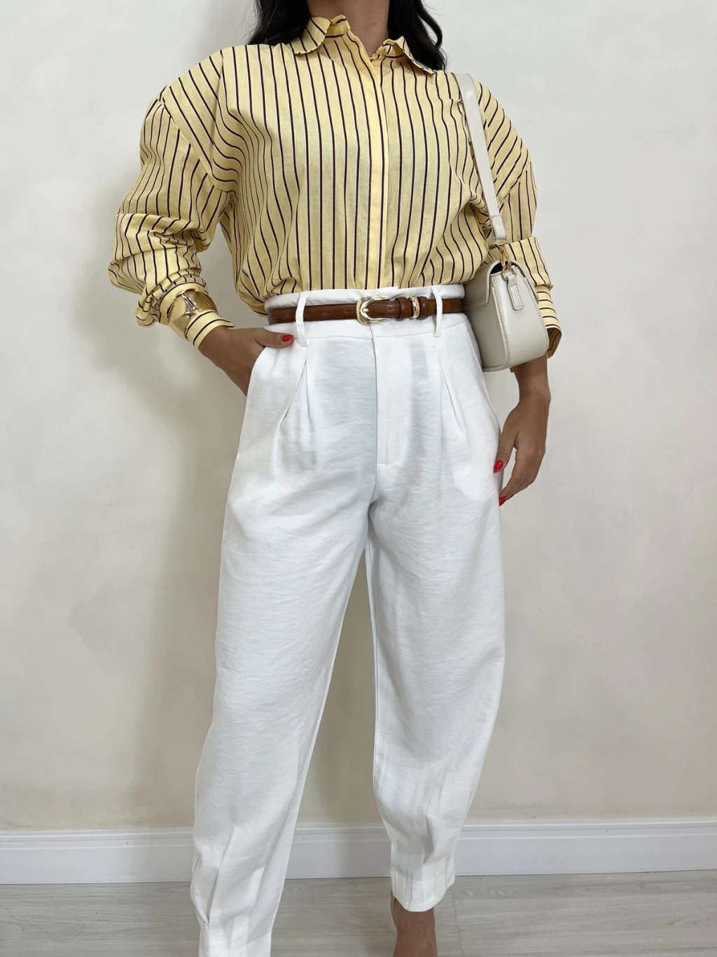 Calça modelo cenoura em tecido marrant. Possui pregas na frente, cós alto com passantes e bolso faca. Atrás possui bolsos também. Modelo com a barra mais justinha. Tecido fluído, não marca e não fica transparente.