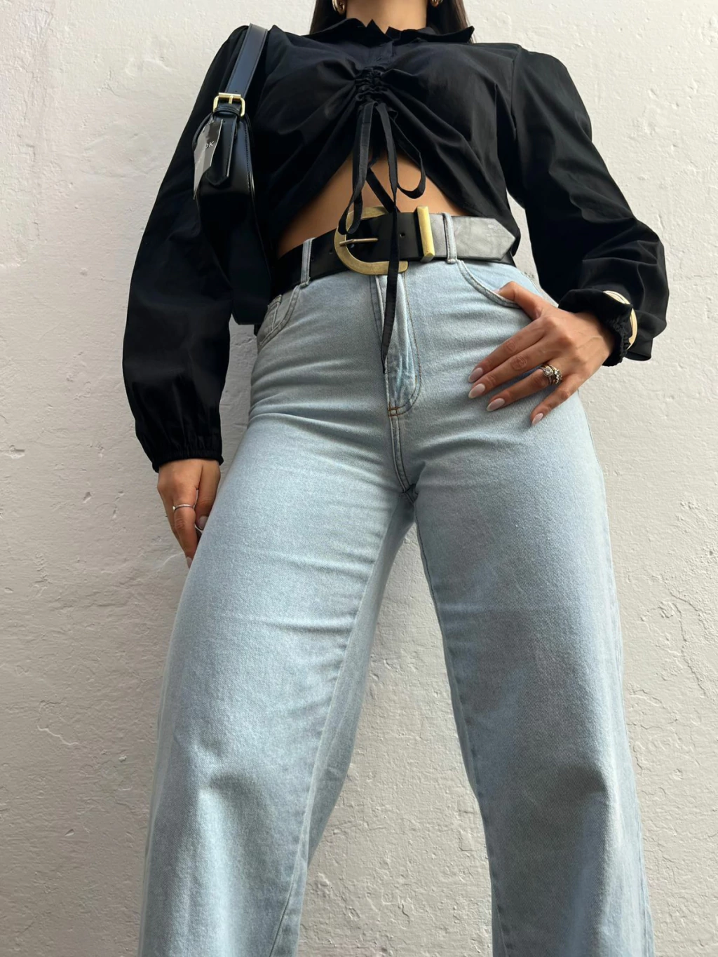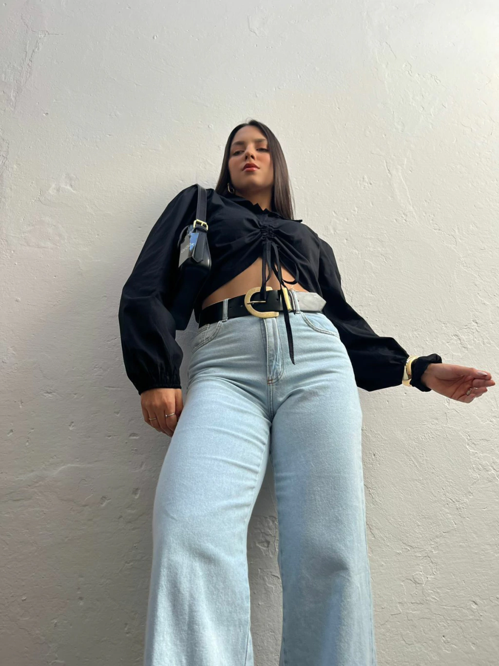 Camisa em tricoline, modelagem cropped. Possui fechamento por botões frontais e frazido na frente, podendo regular o comprimento da peça. Possui manga longa e punho marcado. Não marca e não fica transparente.