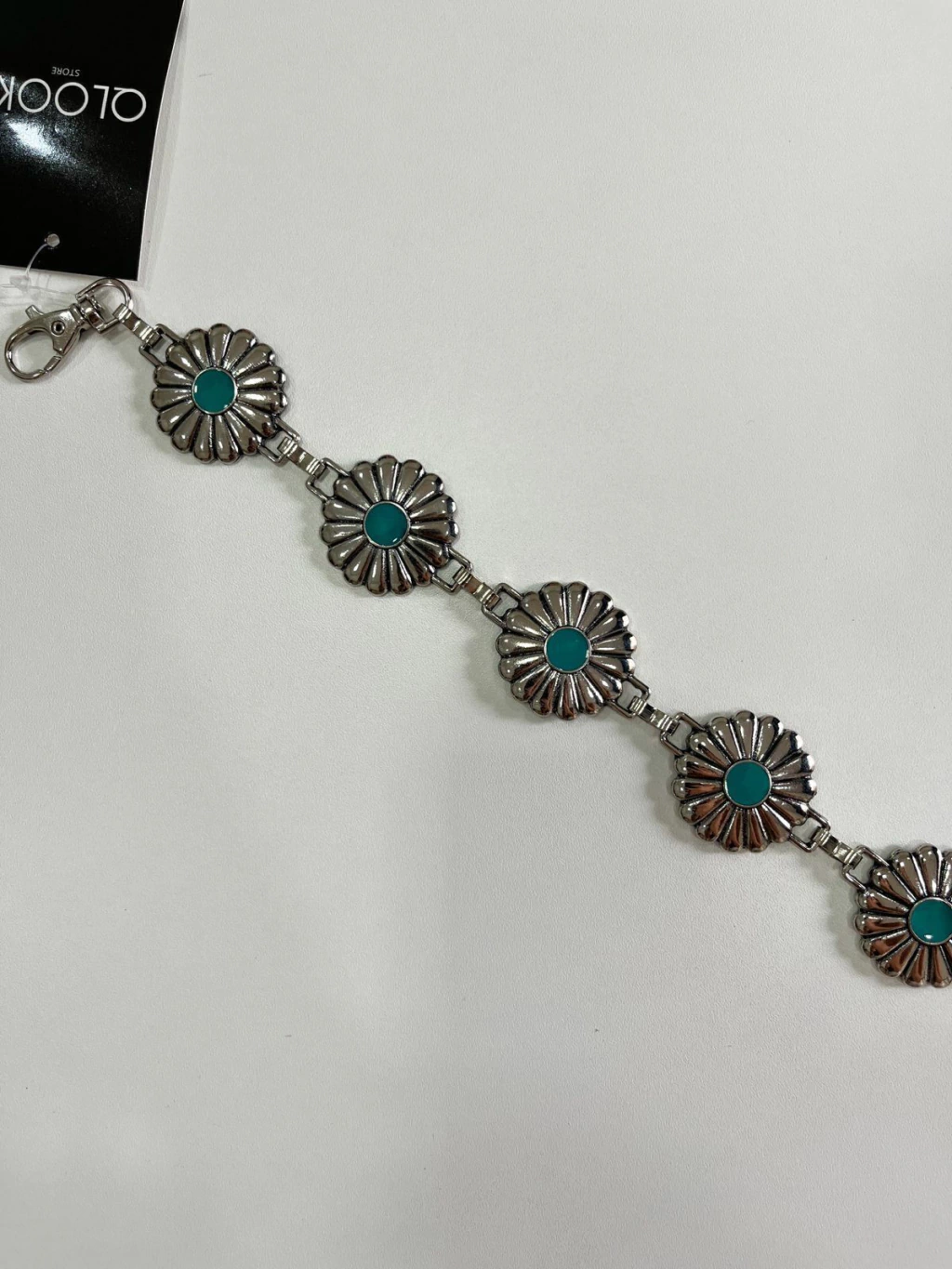 Cinto de corrente com formato de flores metalizados em prata envelhecido e pedras verde Tiffany pelo comprimento.