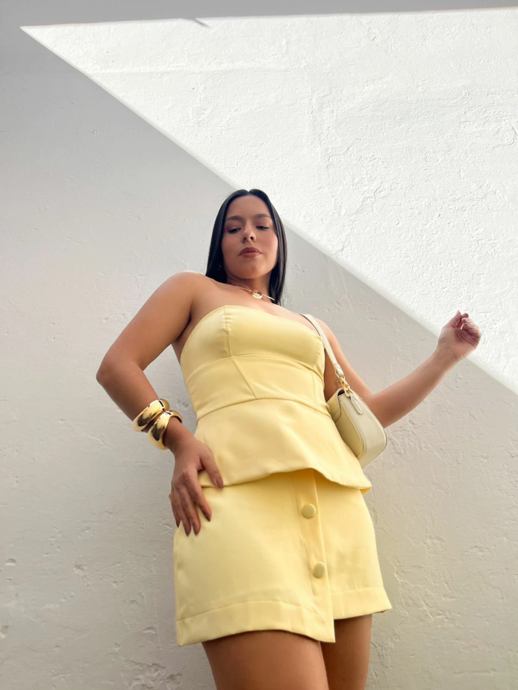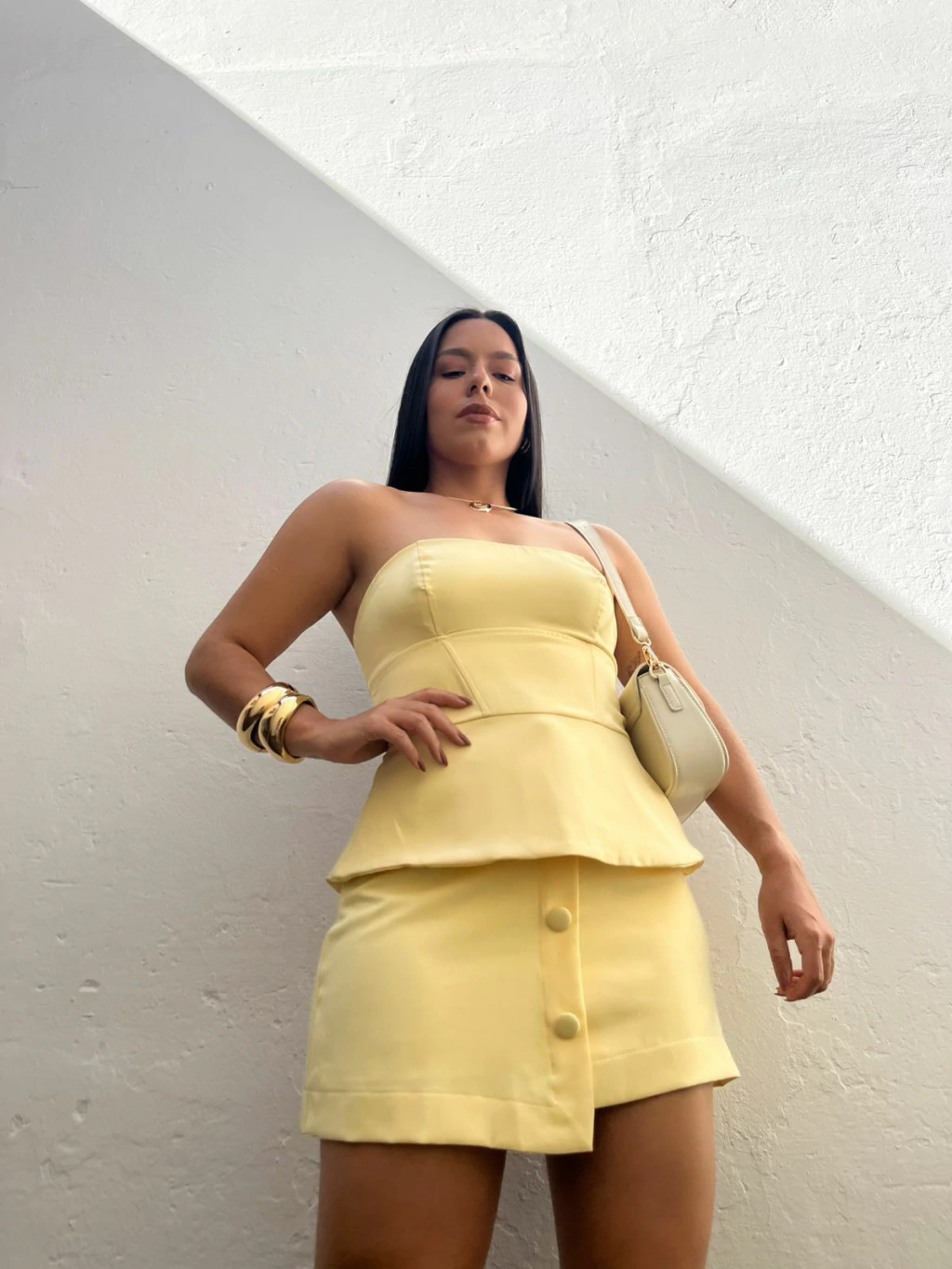 Cojunto em crepe de alfaiataria de blusa + saia. A blusa possui decote tomara que caia, mais estruturada no corpo e modelo peplum. Possui zíper atrás. A saia possui modelagem cintura alta, com cós liso e botões encapados na frente. Não marca e não fica transparente.