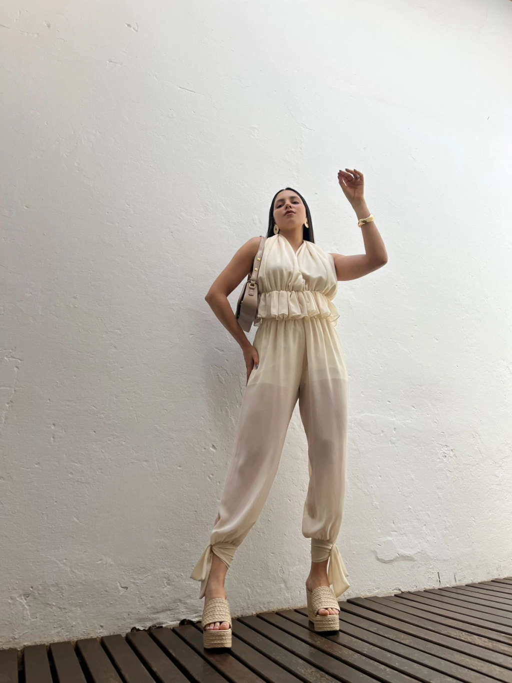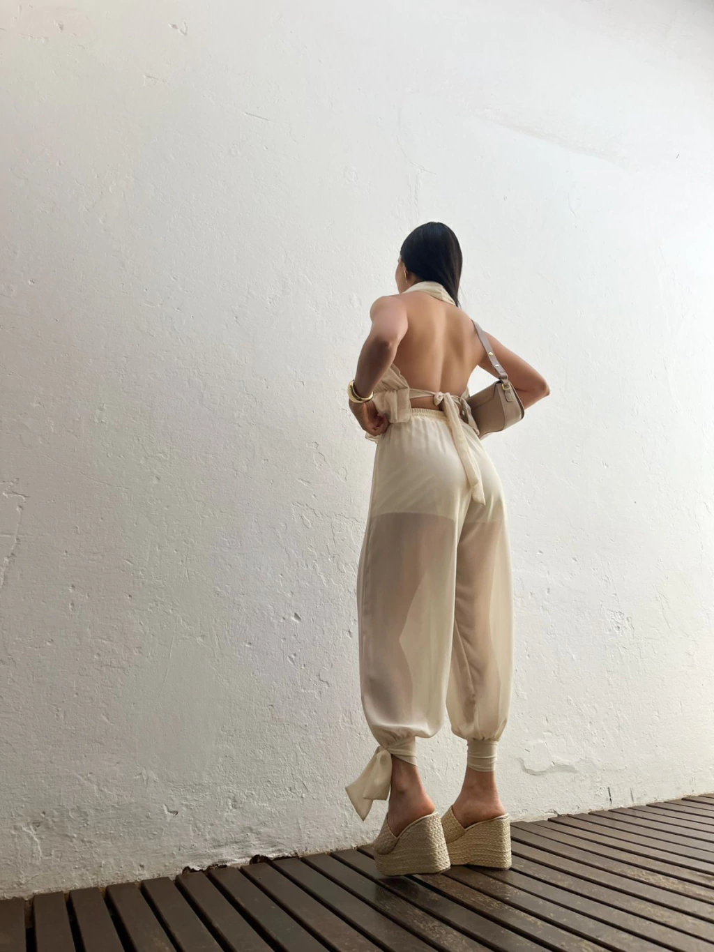 Conjunto de blusa + calça modelo aladin em chiffon. A blusa possui decote profundo, modelo frente única com amarração nas costas. Possui costas abertas e detalhe mais soltinho na barra. A calça possui caimento solto ao corpo, cós de elástico, forro de shorts e amarração na barra.