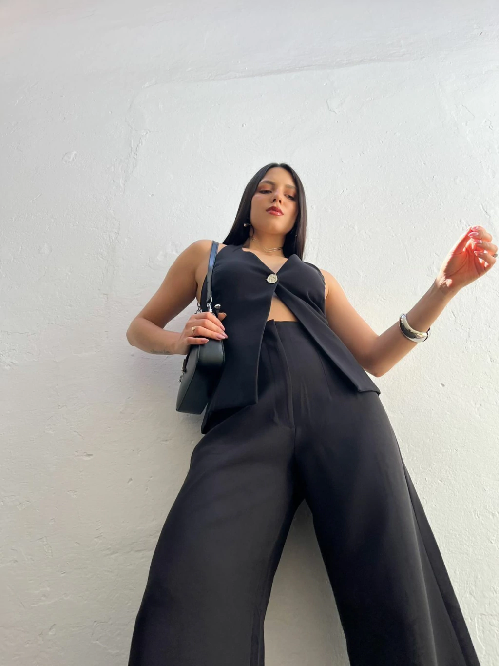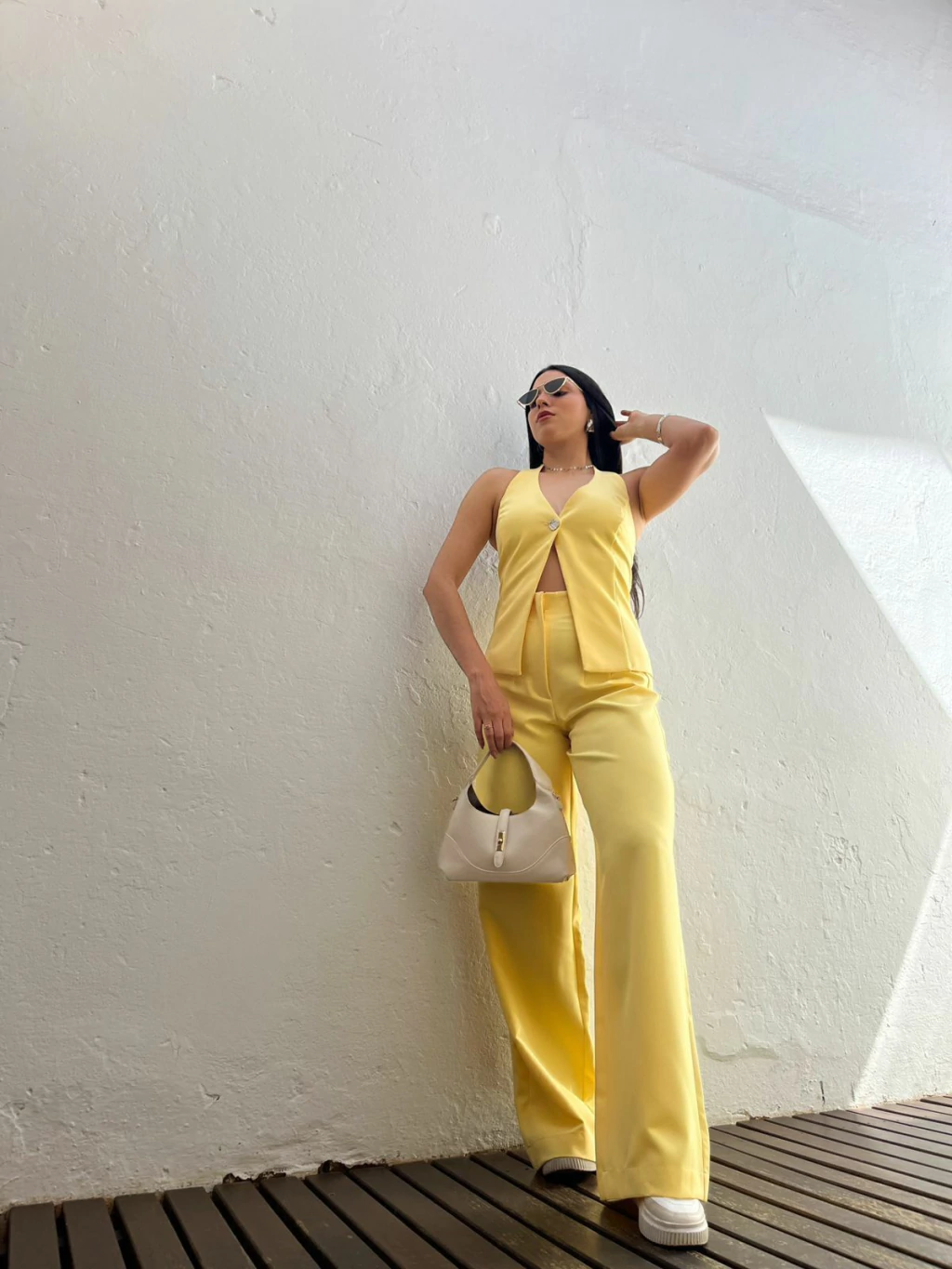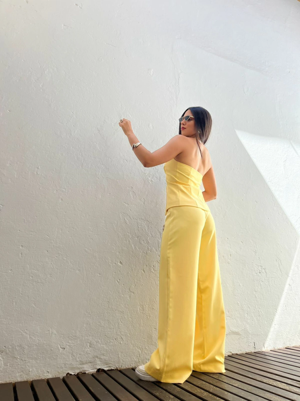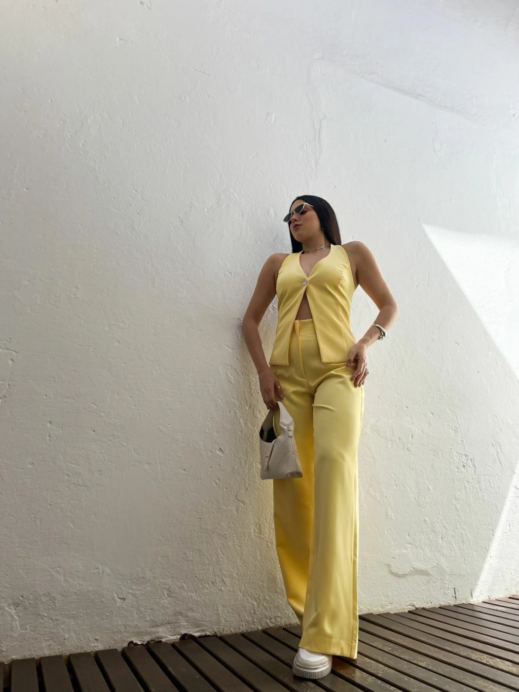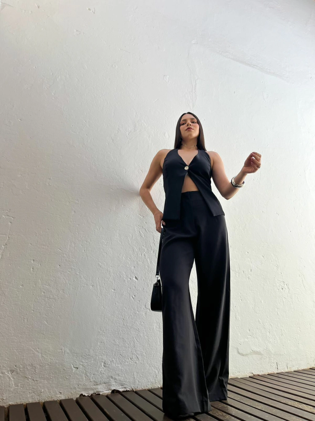 Conjunto em crepe de alfaiataria. A blusa possui modelo frente única, fechamento frontal por um botão metálico e mais ajustada ao corpo. Possui abertura abaixo do busto. A calça modelo pantalona, possui cós liso com passantes, fechamento por um botão interno e zíper. Possui bolso faca. Não marca e não fica transparente.