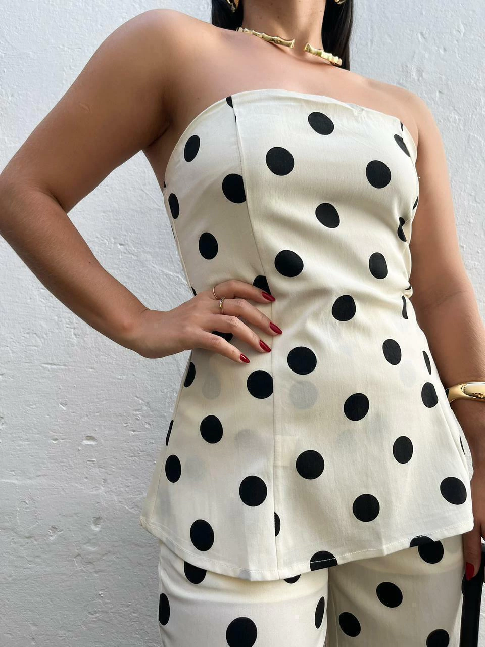 Conjunto em algodão de blusa + calça pantalona em estampa de poá. A blusa possui modelagem alongada, modelo tomara que caia e mais alongada. Possui fechamento atrás por zíper. A calça possui cós liso, modelagem solta ao corpo e não marca e não fica transparente.