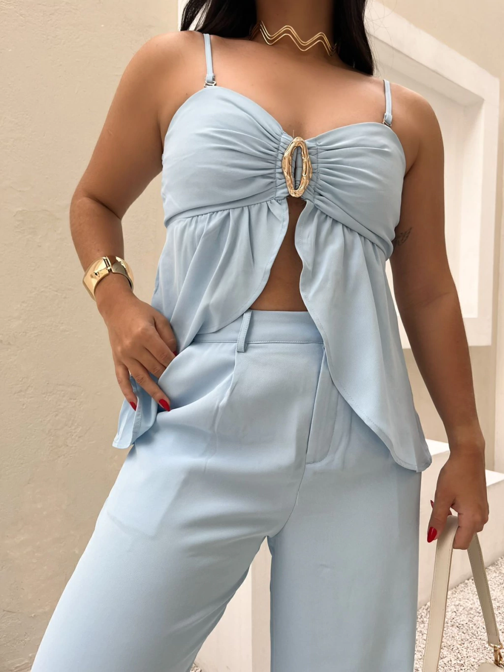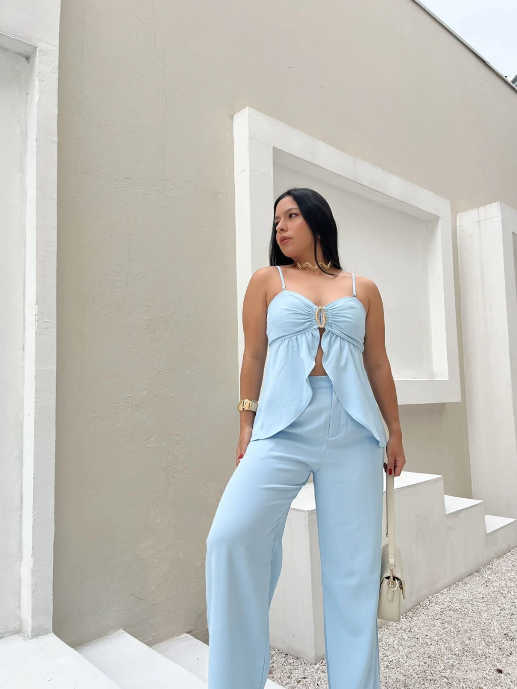 Conjunto em crepe de alfaiataria. A blusa possui alças finas com regulagem, modelo assimétrico com a frente mais curta e detalhe de uma fivela metálica no centro do decote. Possui abertura abaixo do busto. A calça modelo pantalona, possui cós liso com passantes, fechamento por um botão interno e zíper. Possui bolso faca. Não marca e não fica transparente.