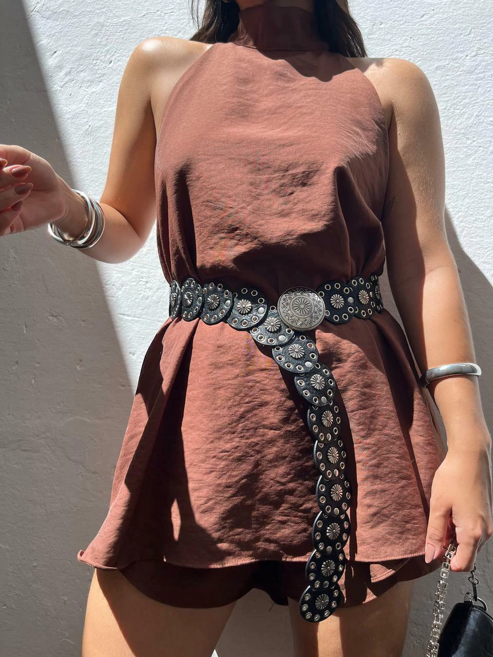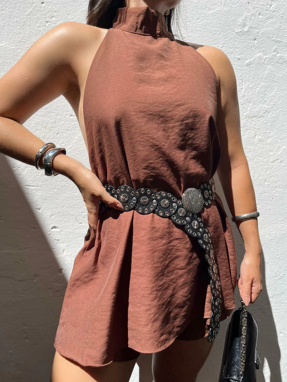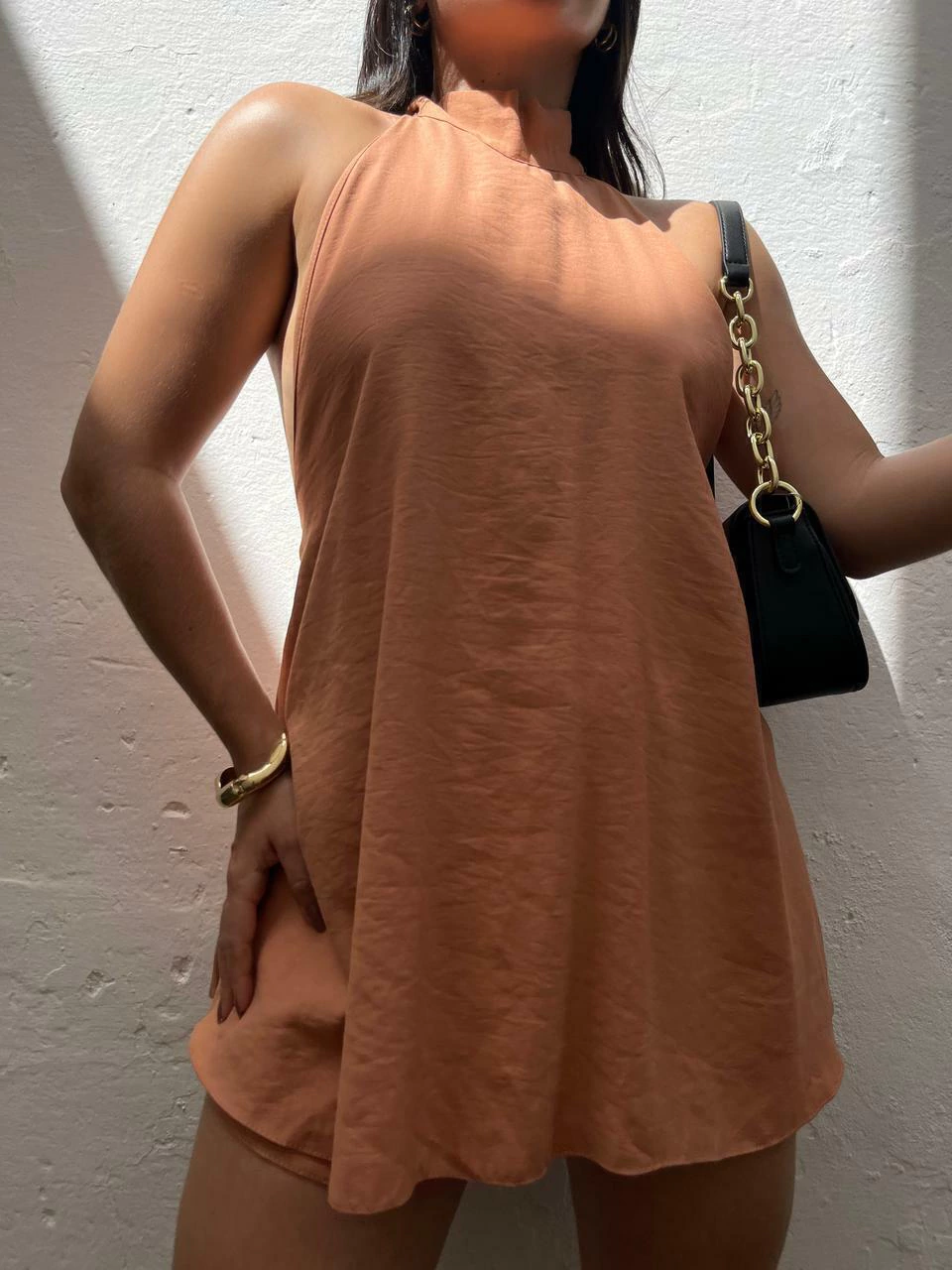 Conjunto em viscose. Possui blusa modelo bata alongada com gola alta e amarração no pescoço. Possui costas abertas e comprimento assimétrico (atrás mais longa). O shorts possui cós com elástico e laterais mais curtas. Não marca e não fica transparente.