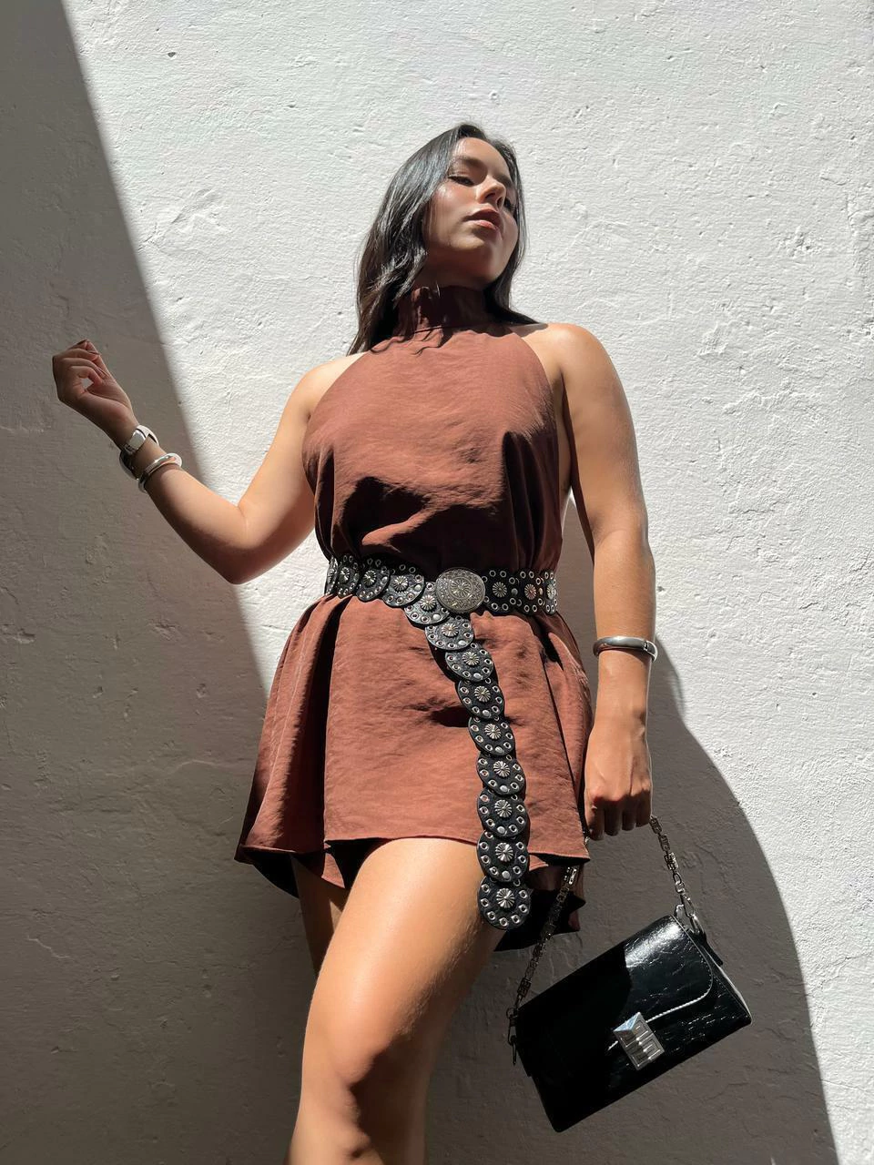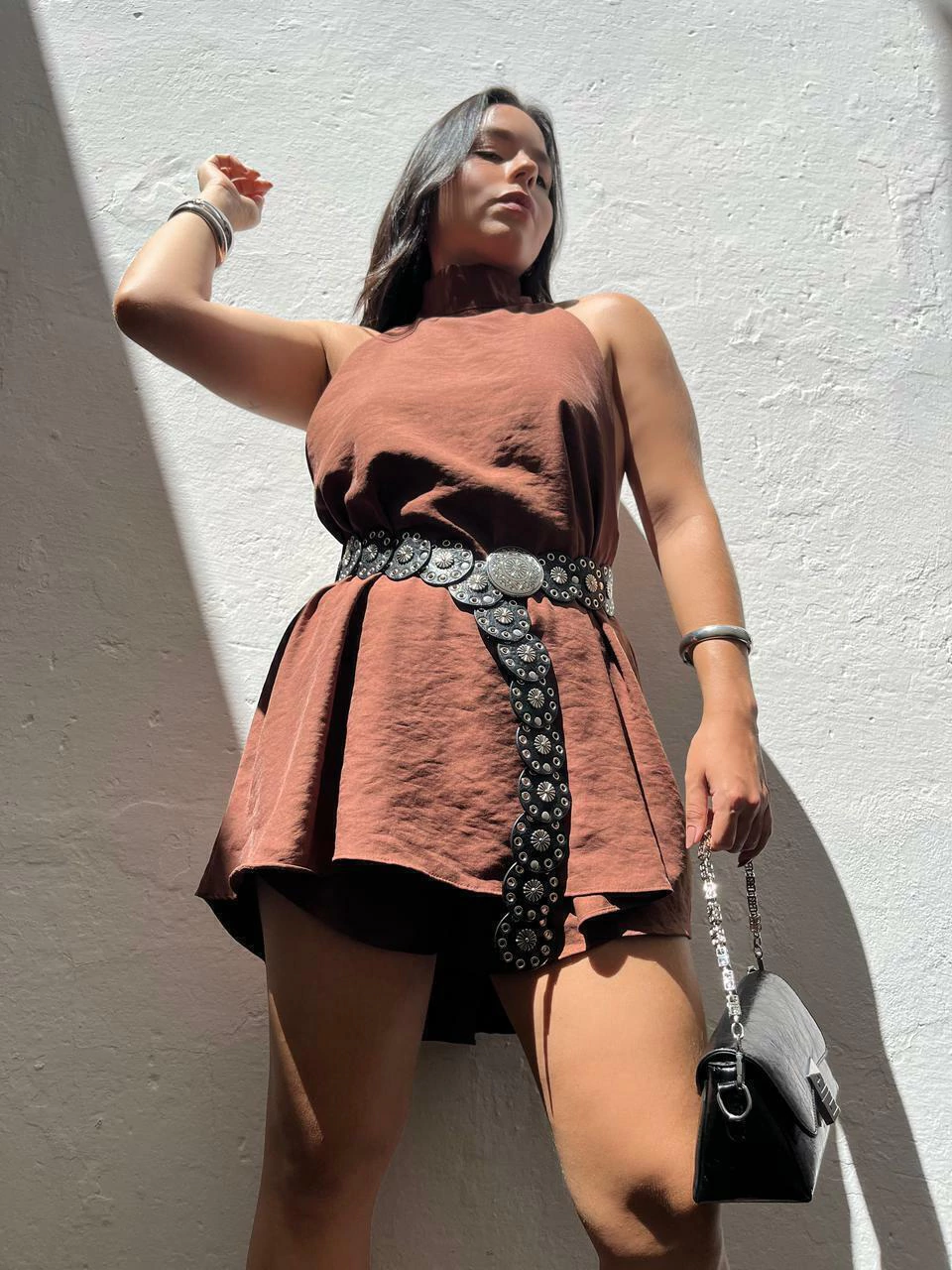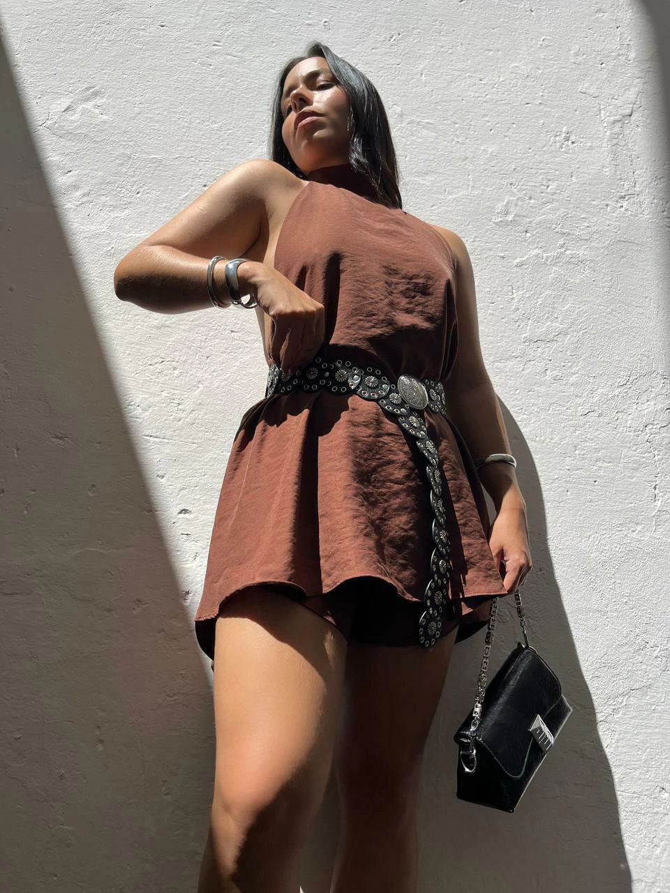 Conjunto em viscose. Possui blusa modelo bata alongada com gola alta e amarração no pescoço. Possui costas abertas e comprimento assimétrico (atrás mais longa). O shorts possui cós com elástico e laterais mais curtas. Não marca e não fica transparente.