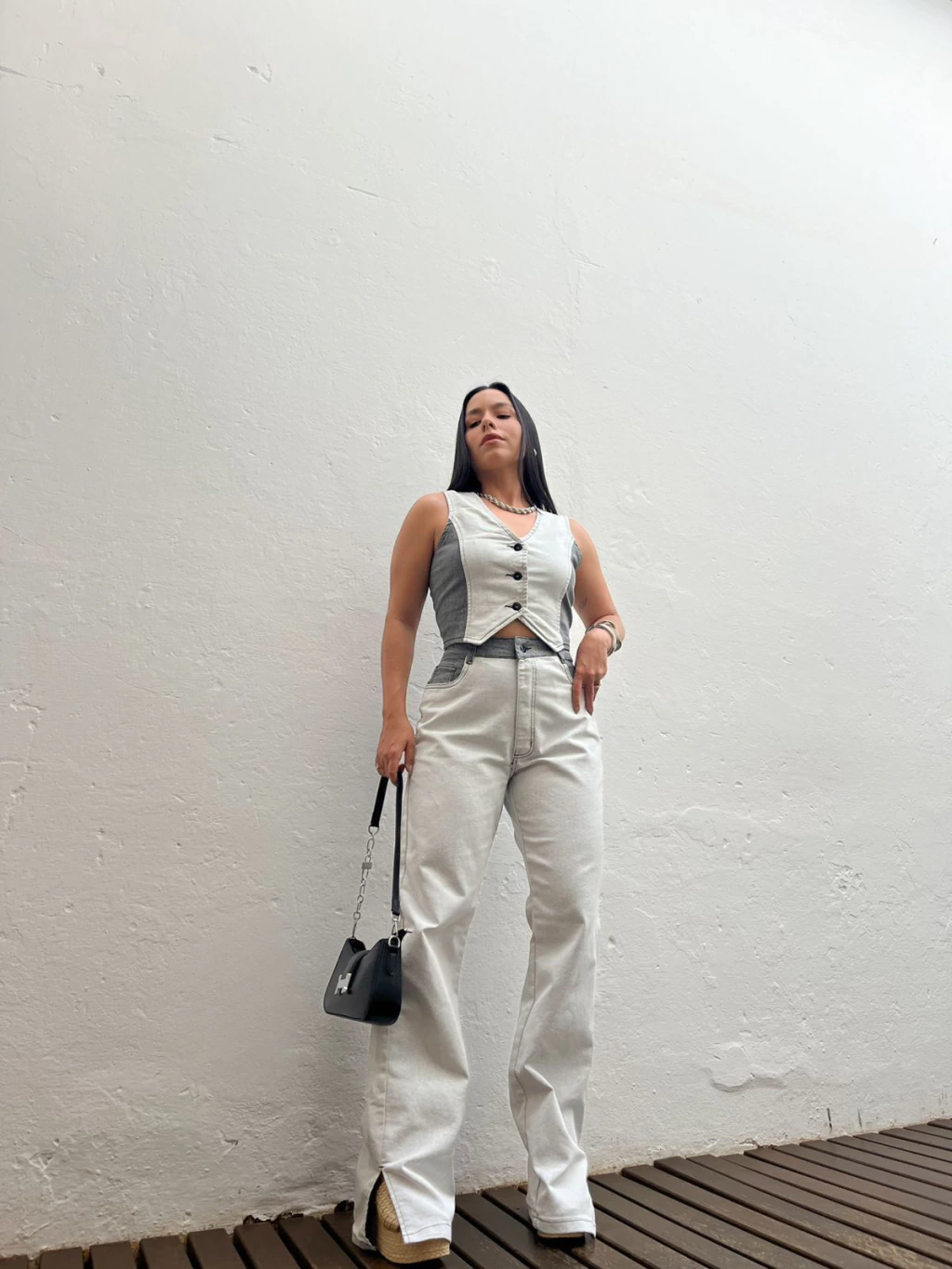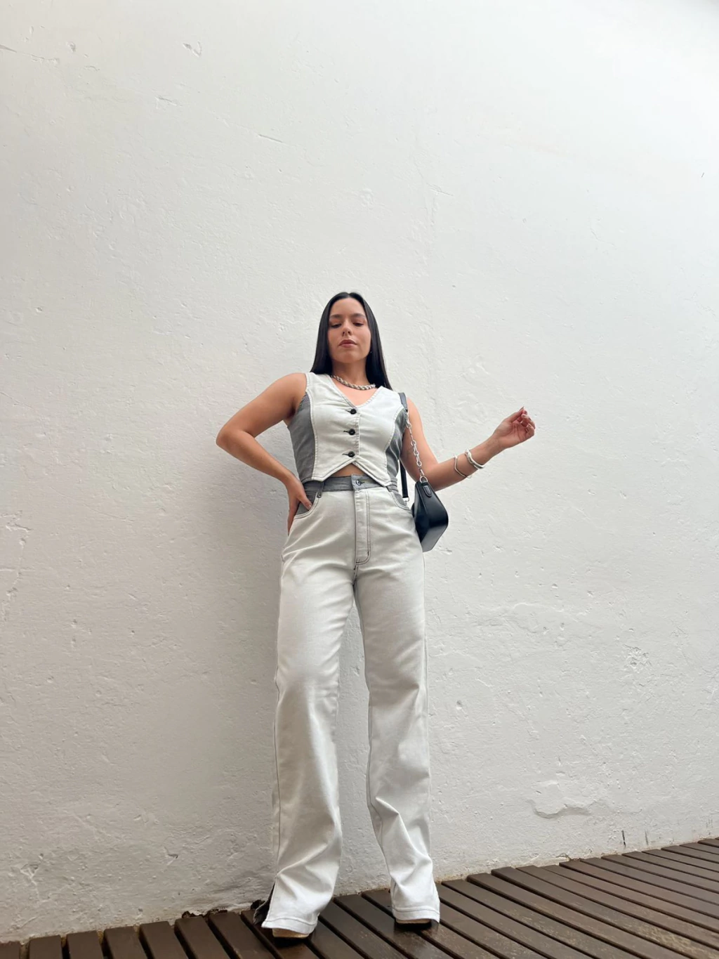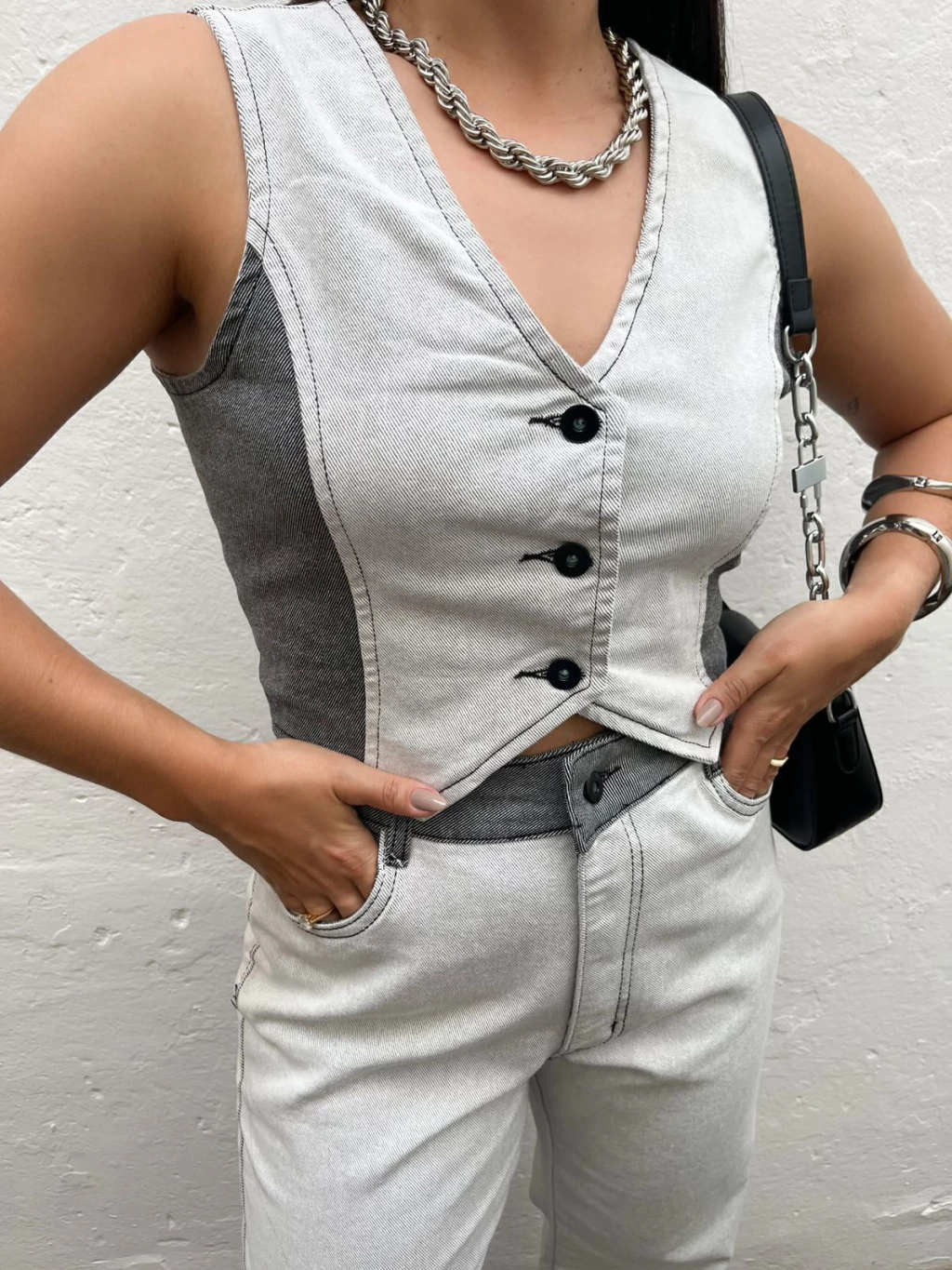 Conjunto em jeans de coletinho + calça jeans. O colete possui comprimento mais curtinho, fechamento fontal por botões e ajustado ao corpo. A calça possui modelo wide leg, cintura alta e fenda nas laterais da barra. Ele possui lavagem bicolor de cinza claro, com laterais cinza escuro. Super estiloso e confortável. Não marca e não fica transparente. Jeans sem elastano.