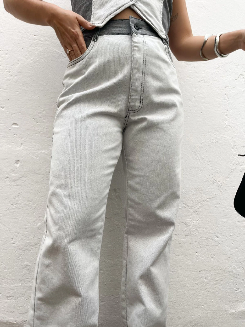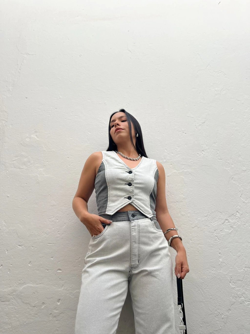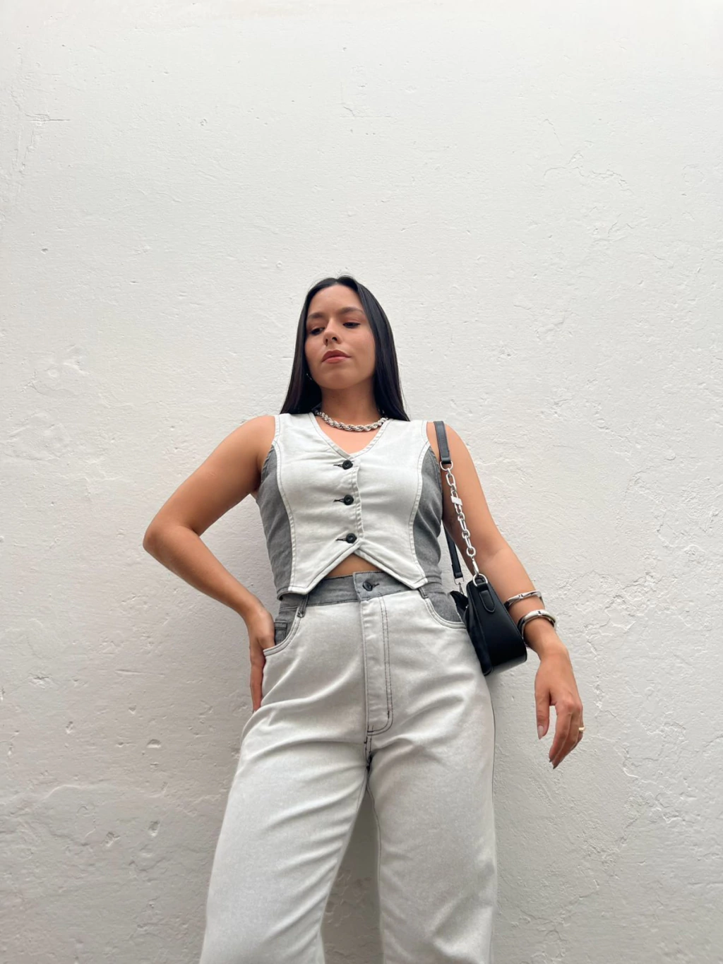 Conjunto em jeans de coletinho + calça jeans. O colete possui comprimento mais curtinho, fechamento fontal por botões e ajustado ao corpo. A calça possui modelo wide leg, cintura alta e fenda nas laterais da barra. Ele possui lavagem bicolor de cinza claro, com laterais cinza escuro. Super estiloso e confortável. Não marca e não fica transparente. Jeans sem elastano.