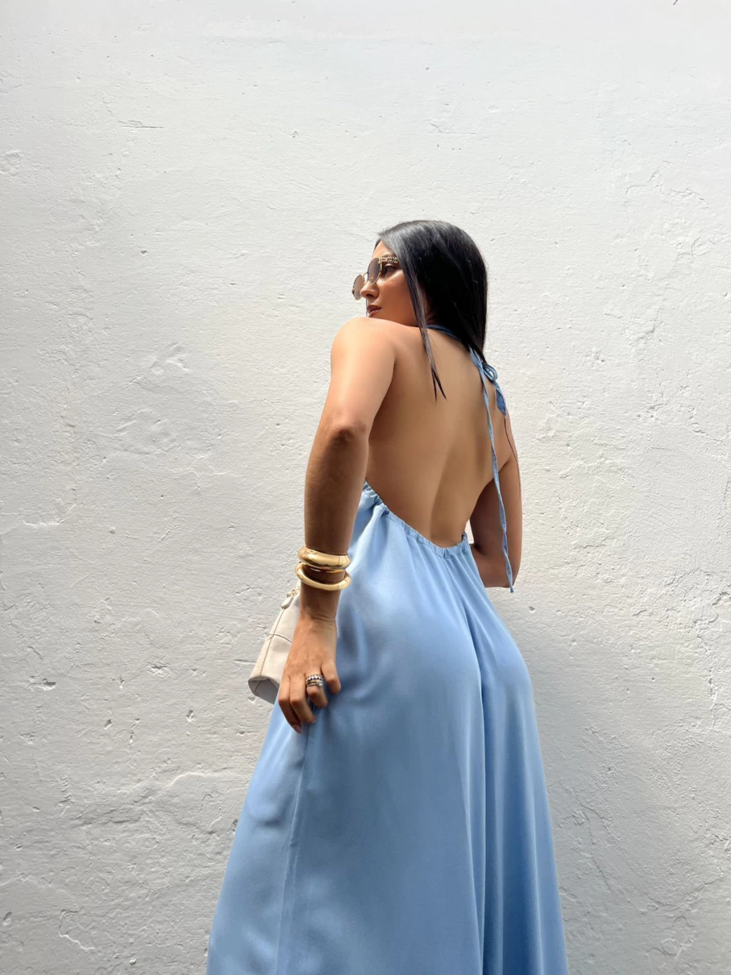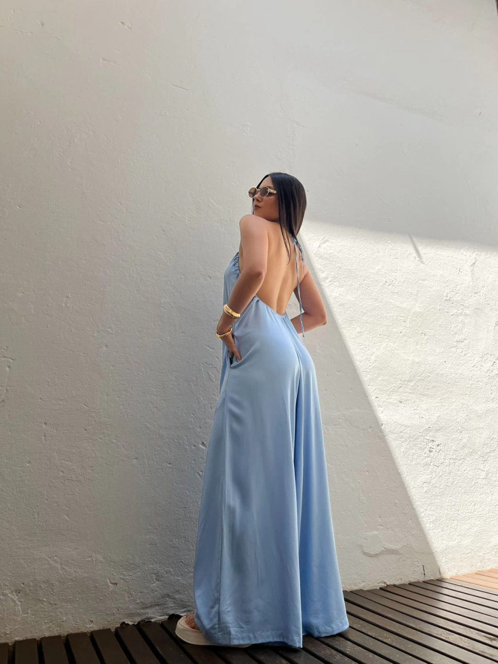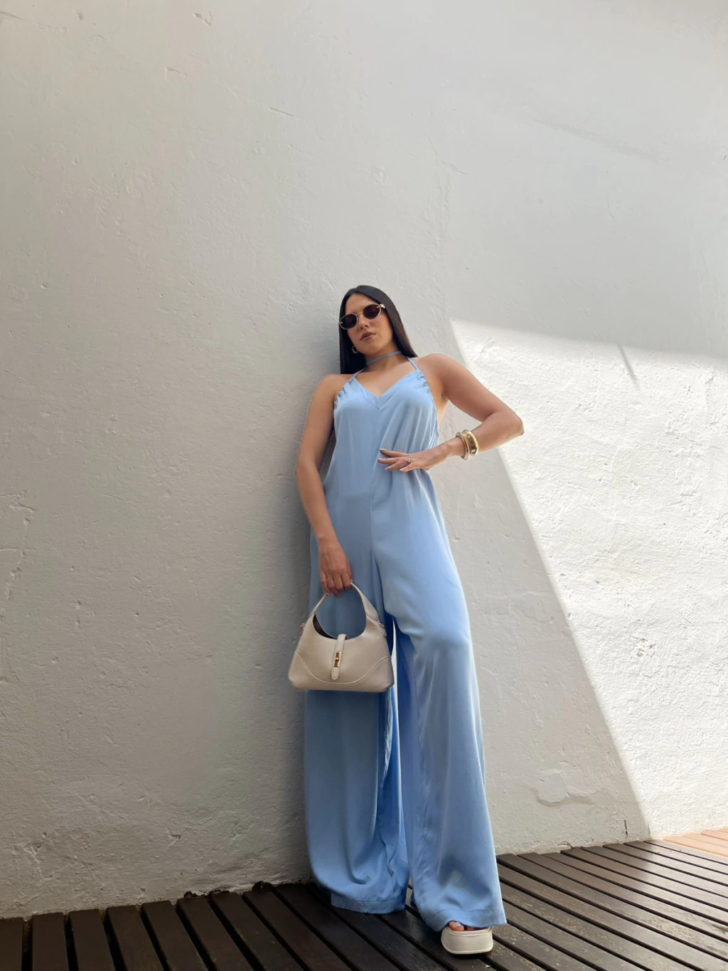 Macacão em viscose. Possui decote frente única com amarração no pescoço. Possui decote V e regulagem do busto nas laterai. Possui costas toda aberta. Modelagem solta no corpo com bolso faca.