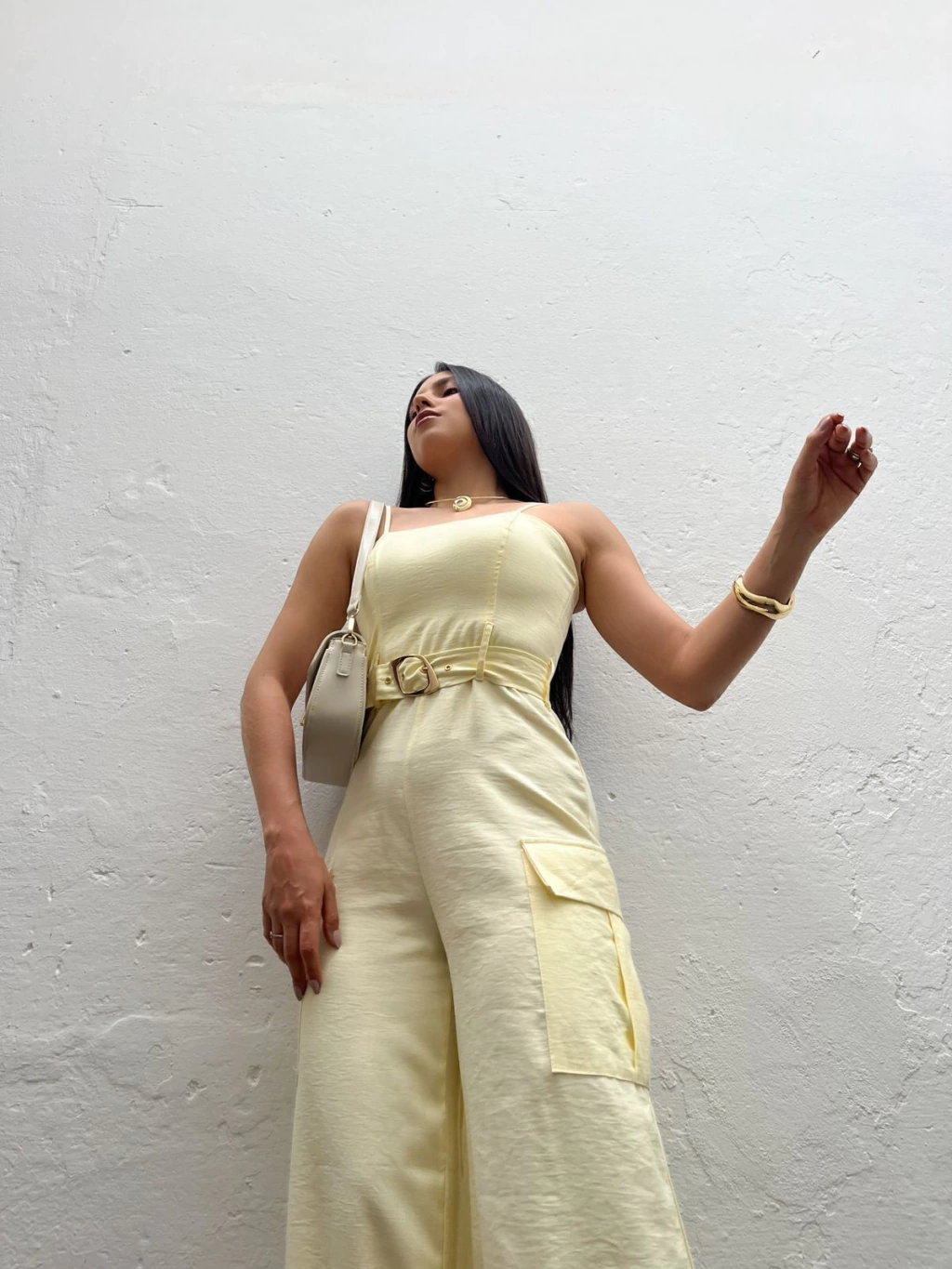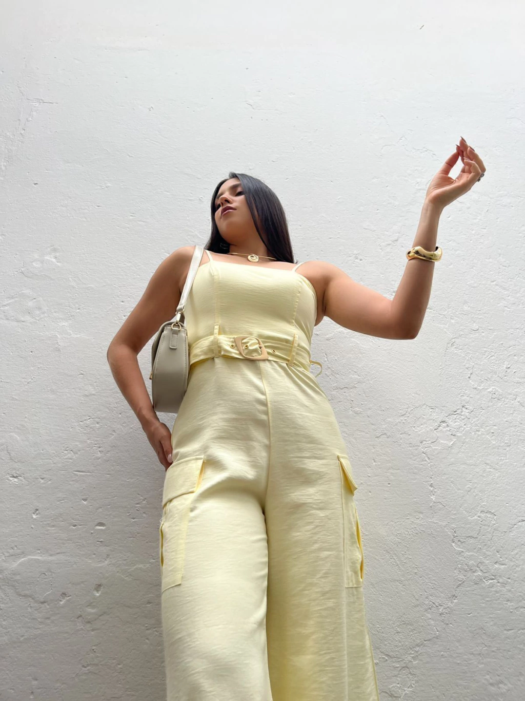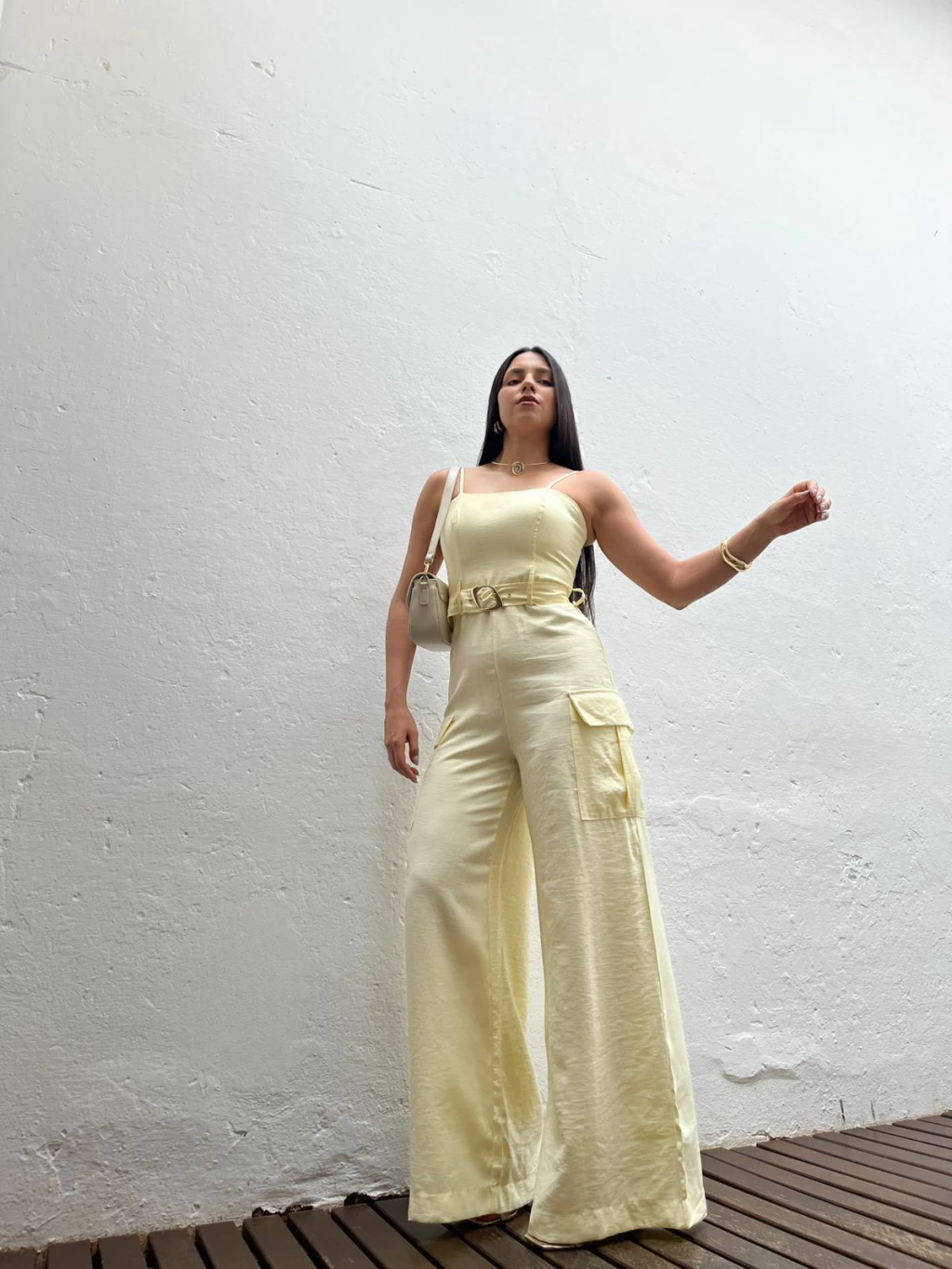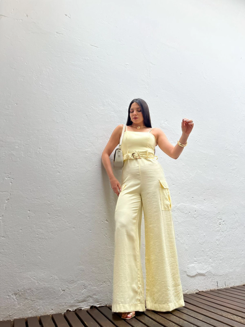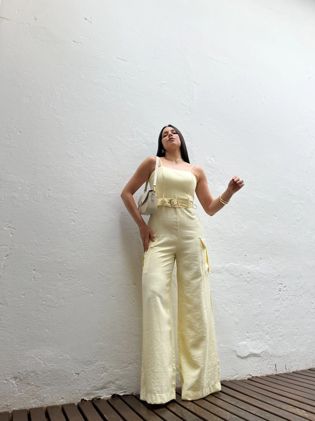 Macacão em tecido marrant. Possui decote reto e alças finas com regulagem. Possui passantes na cintura e acompanha cinto no mesmo tom. Possui calça com bolso nas laterais estilo cargo. Modealgem mais solta ao corpo. Sofisticado e elegante. Não marca e não fica transparente.