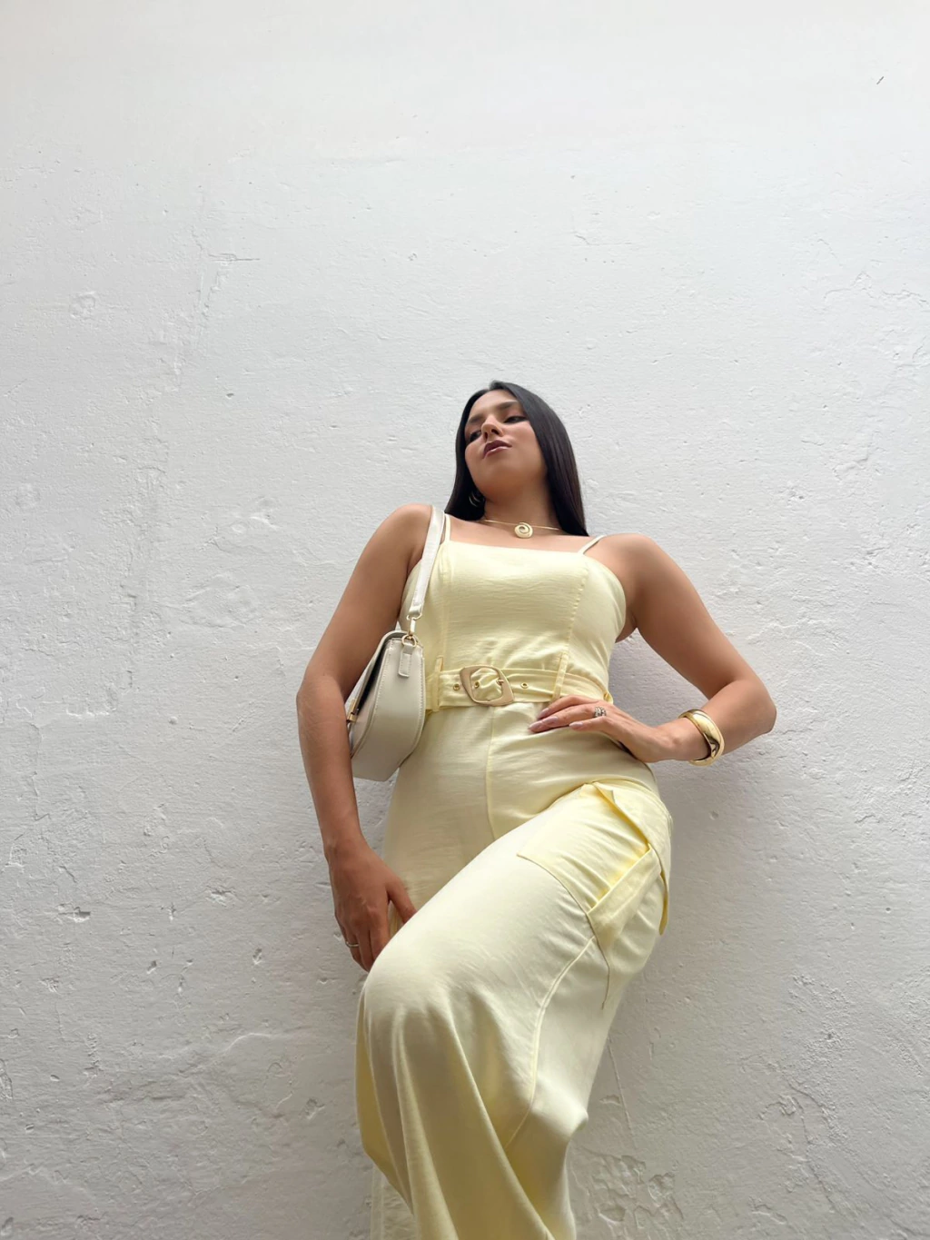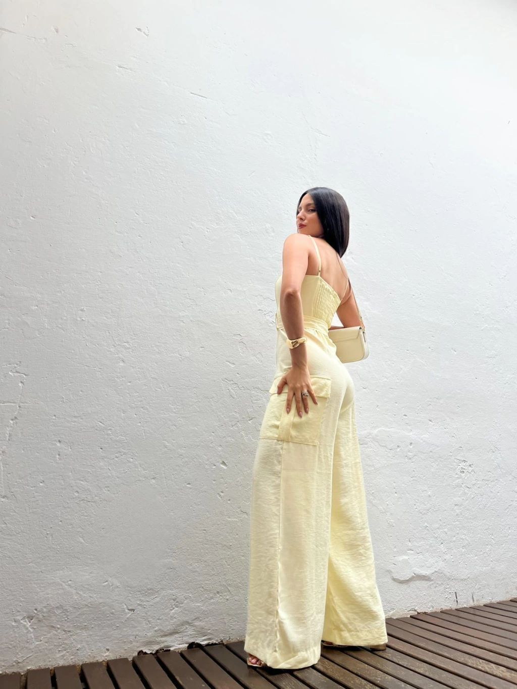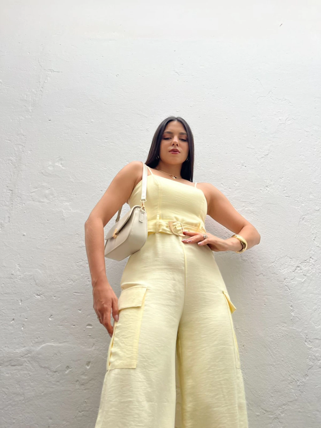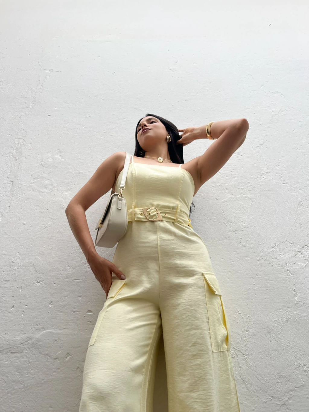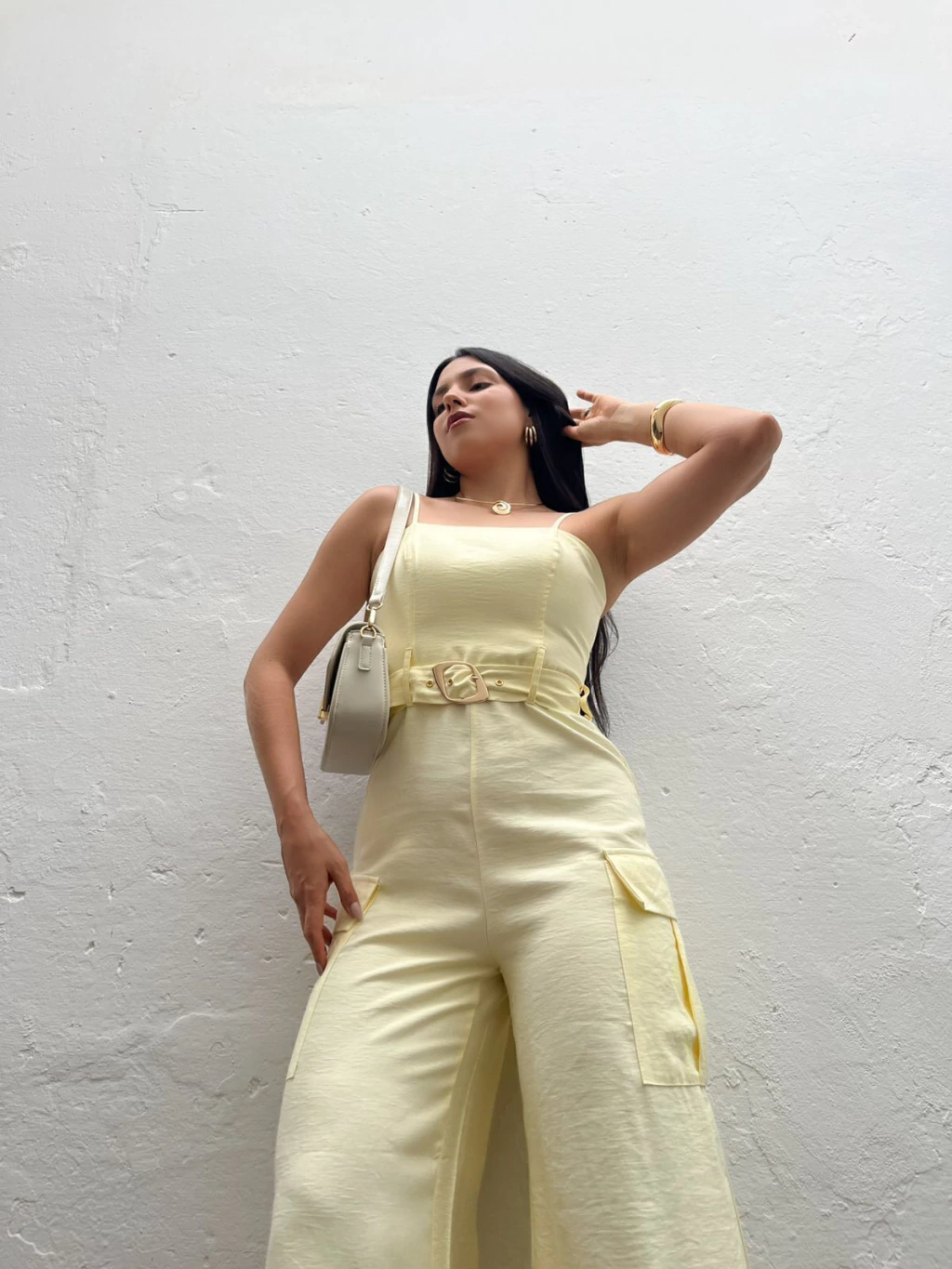 Macacão em tecido marrant. Possui decote reto e alças finas com regulagem. Possui passantes na cintura e acompanha cinto no mesmo tom. Possui calça com bolso nas laterais estilo cargo. Modealgem mais solta ao corpo. Sofisticado e elegante. Não marca e não fica transparente.