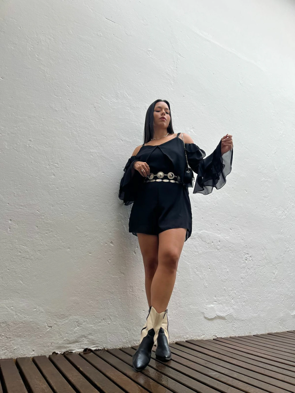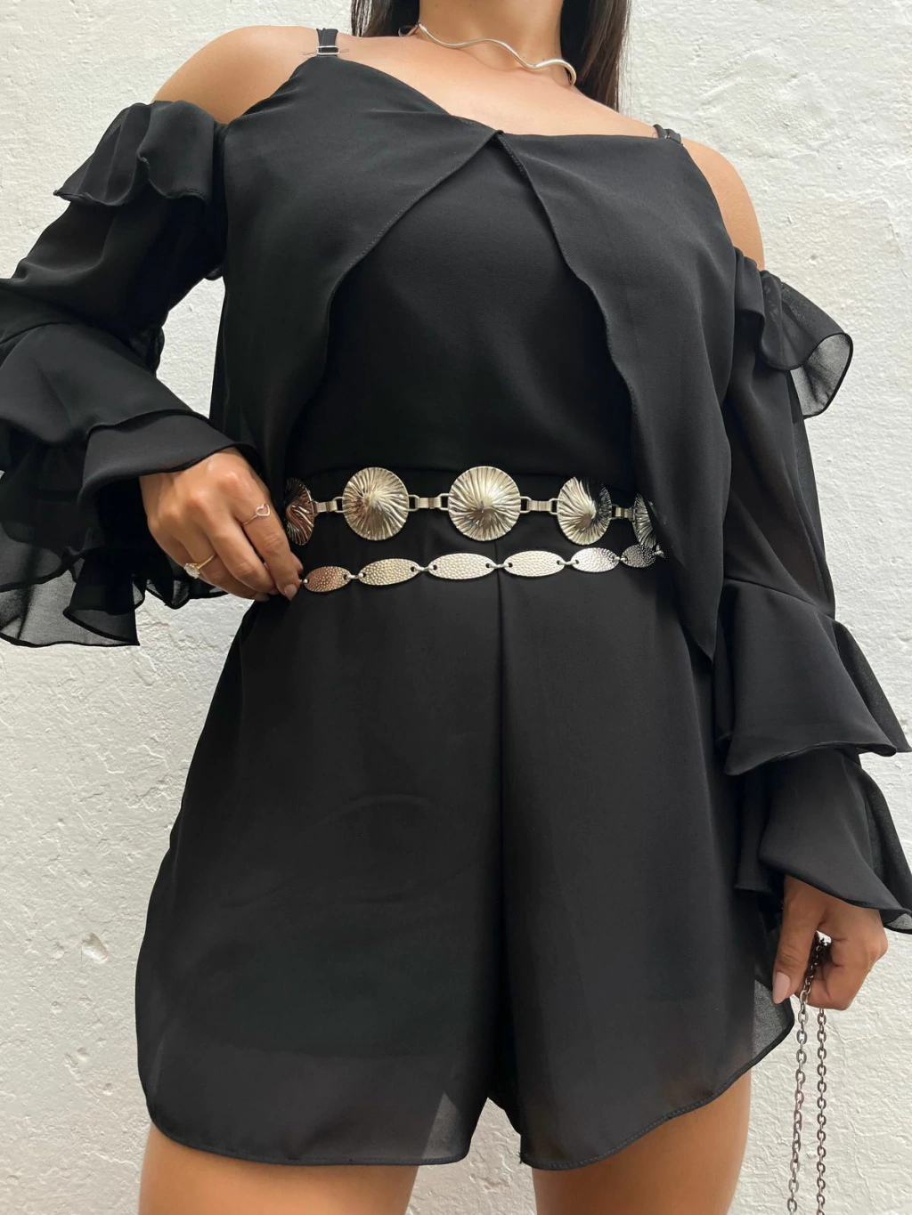 Macaquinho em chiffon. Possui decote V com babados. Possui alças finas com regulagem. Possui mangas longas que ficam pra baixo do ombro. Possui forro. Modelo soltinho no corpo, não marca e não fica transparente.