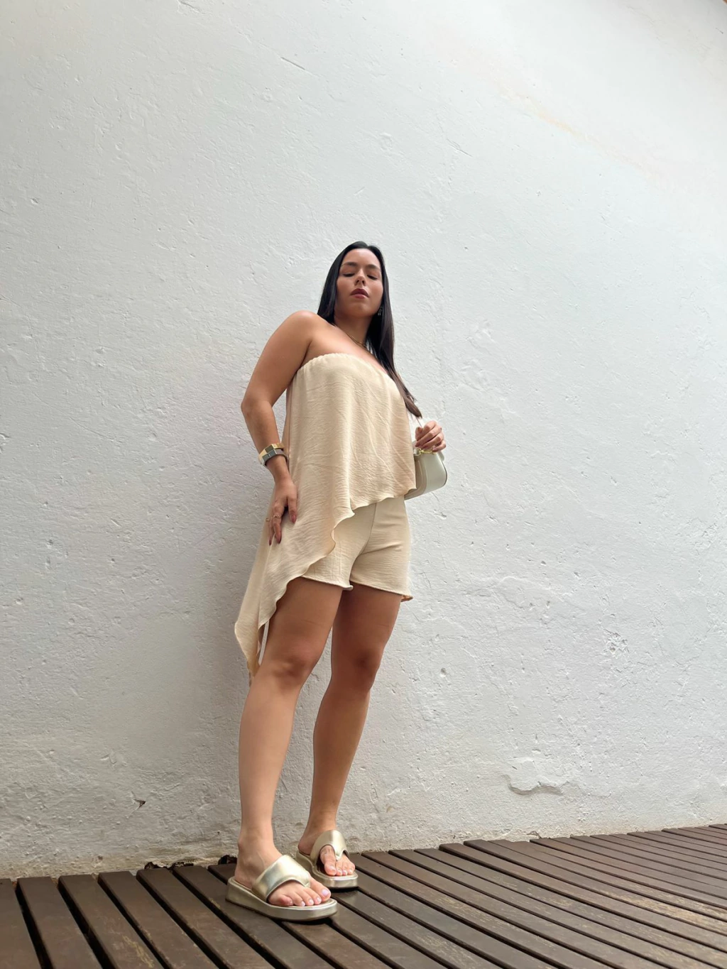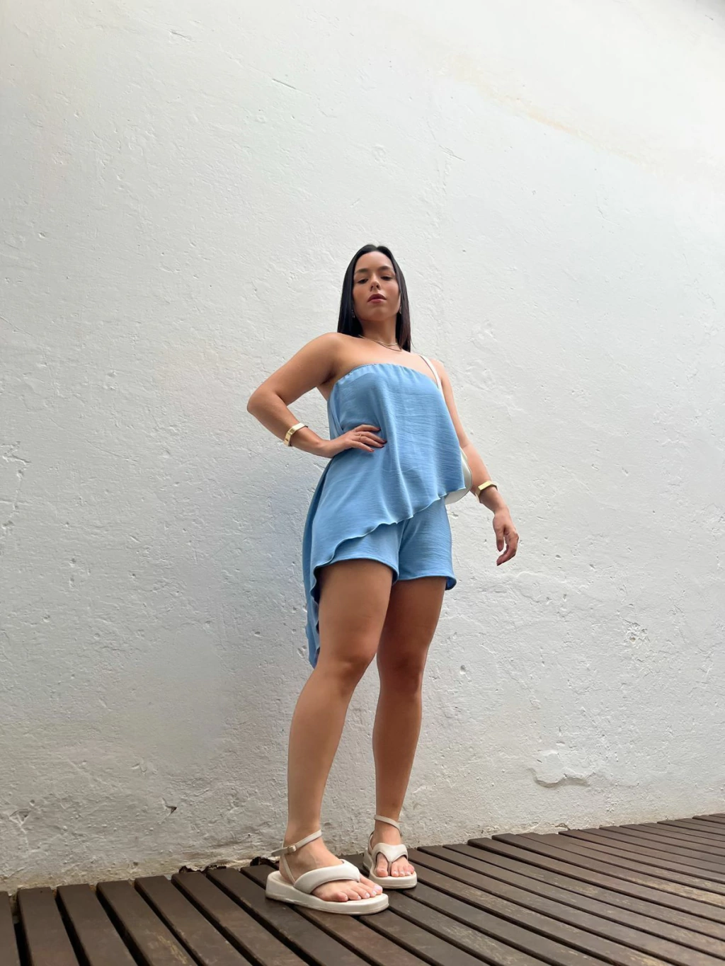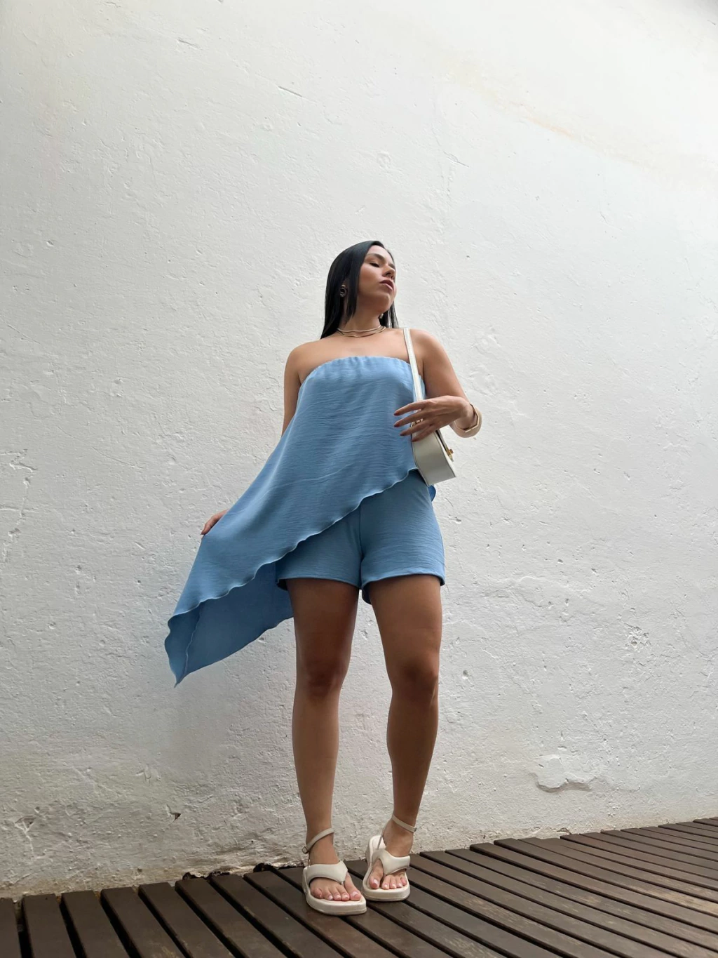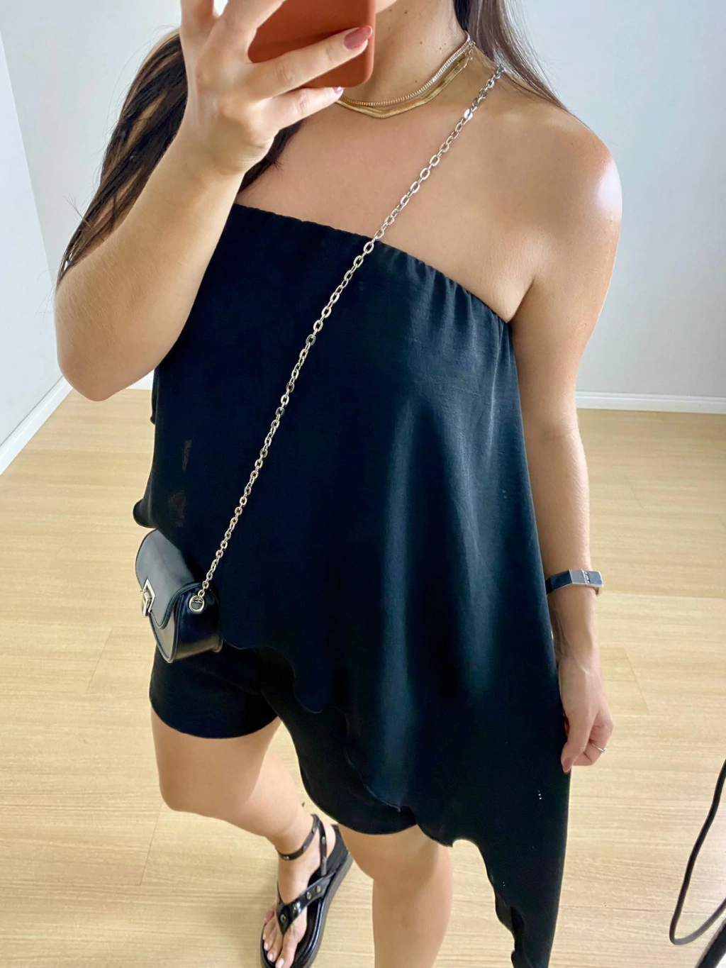 Macaquinho em tecido duna. Possui decote tomara que caia com elástico na parte de cima do busto para meio segurança na peça. Possui uma sobreposição de blusa assimétrica dando um ar mais sofisticado e moderno a peça. Possui fechamento atrás por zíper invisível.Modelo soltinho. Não marca e não fica transparente.