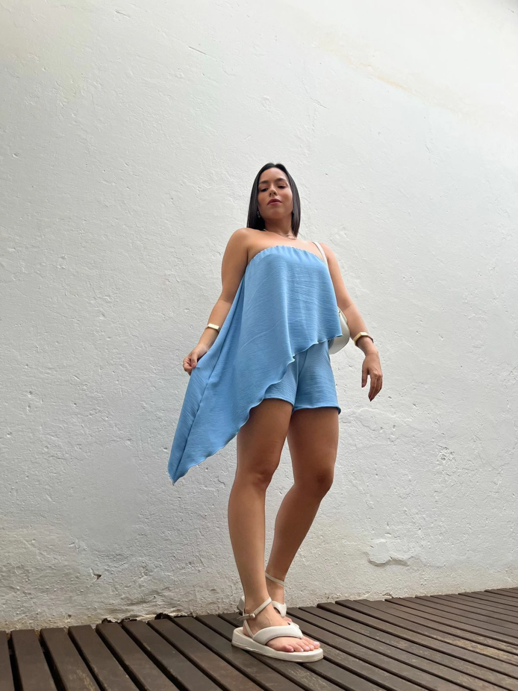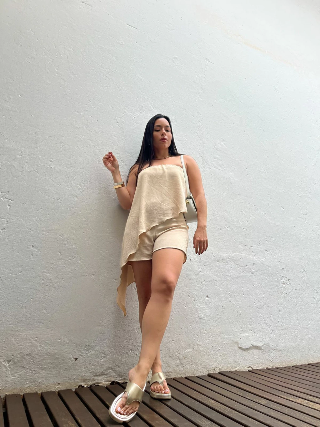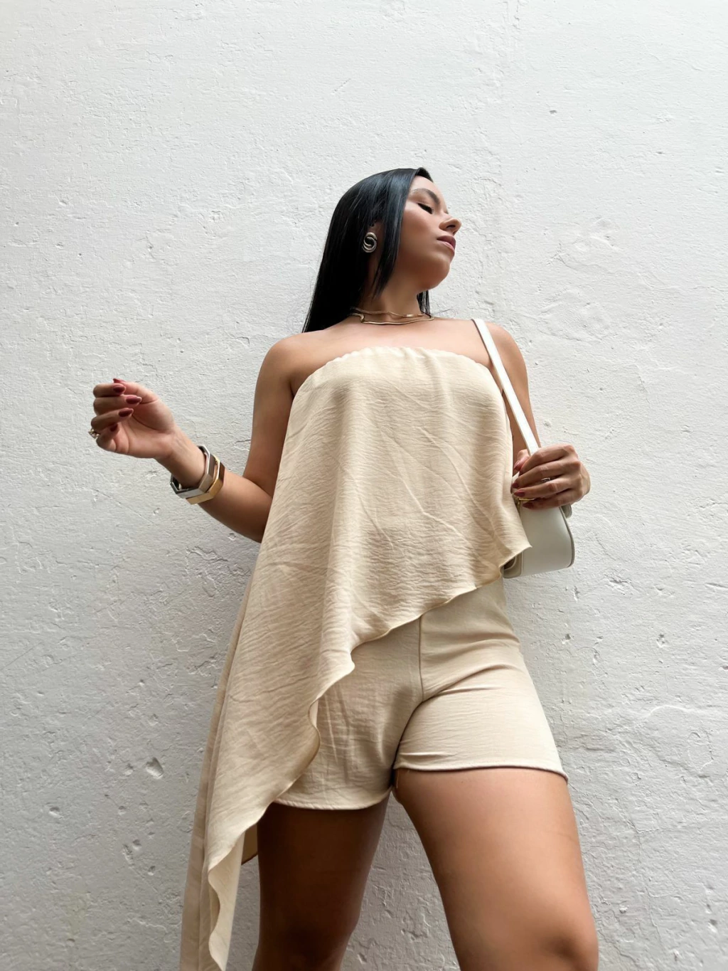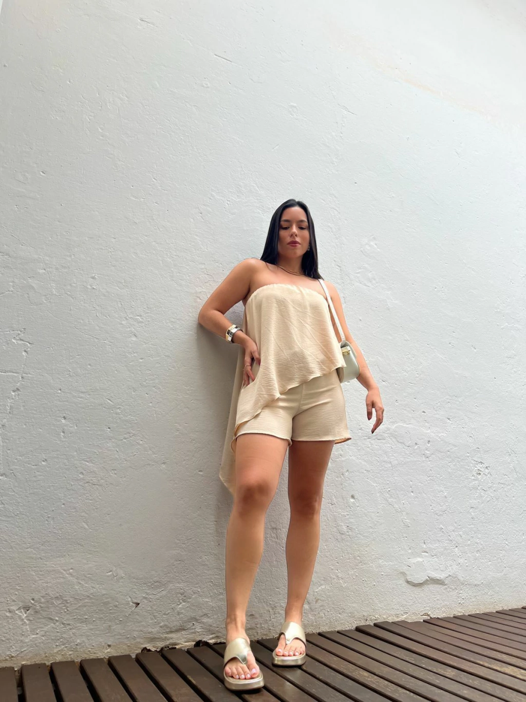Macaquinho em tecido duna. Possui decote tomara que caia com elástico na parte de cima do busto para meio segurança na peça. Possui uma sobreposição de blusa assimétrica dando um ar mais sofisticado e moderno a peça. Possui fechamento atrás por zíper invisível.Modelo soltinho. Não marca e não fica transparente.