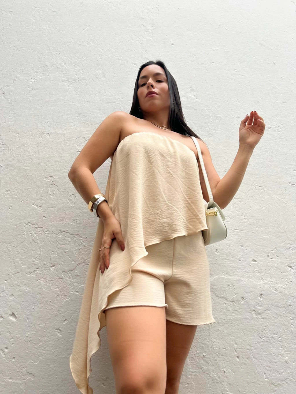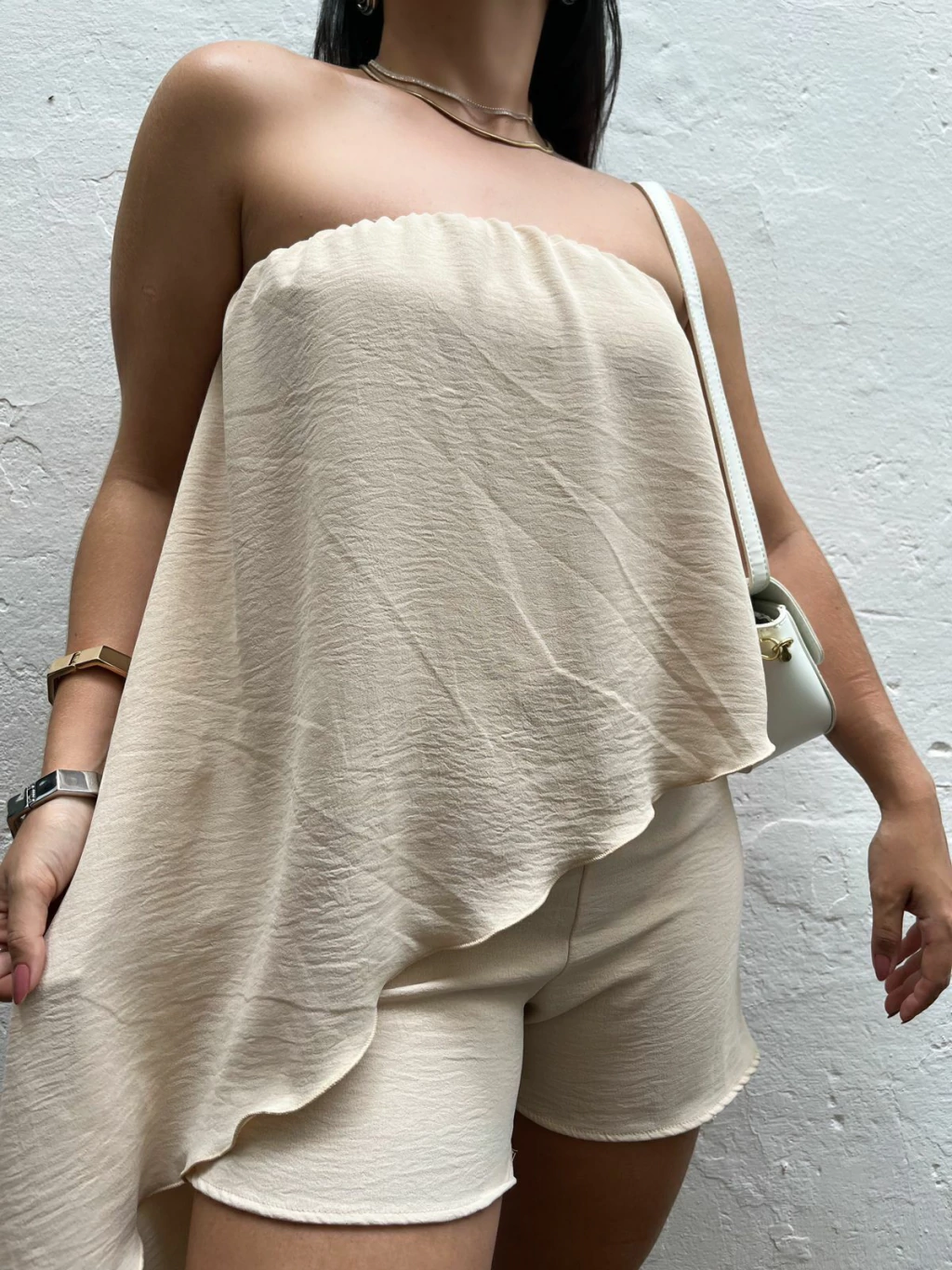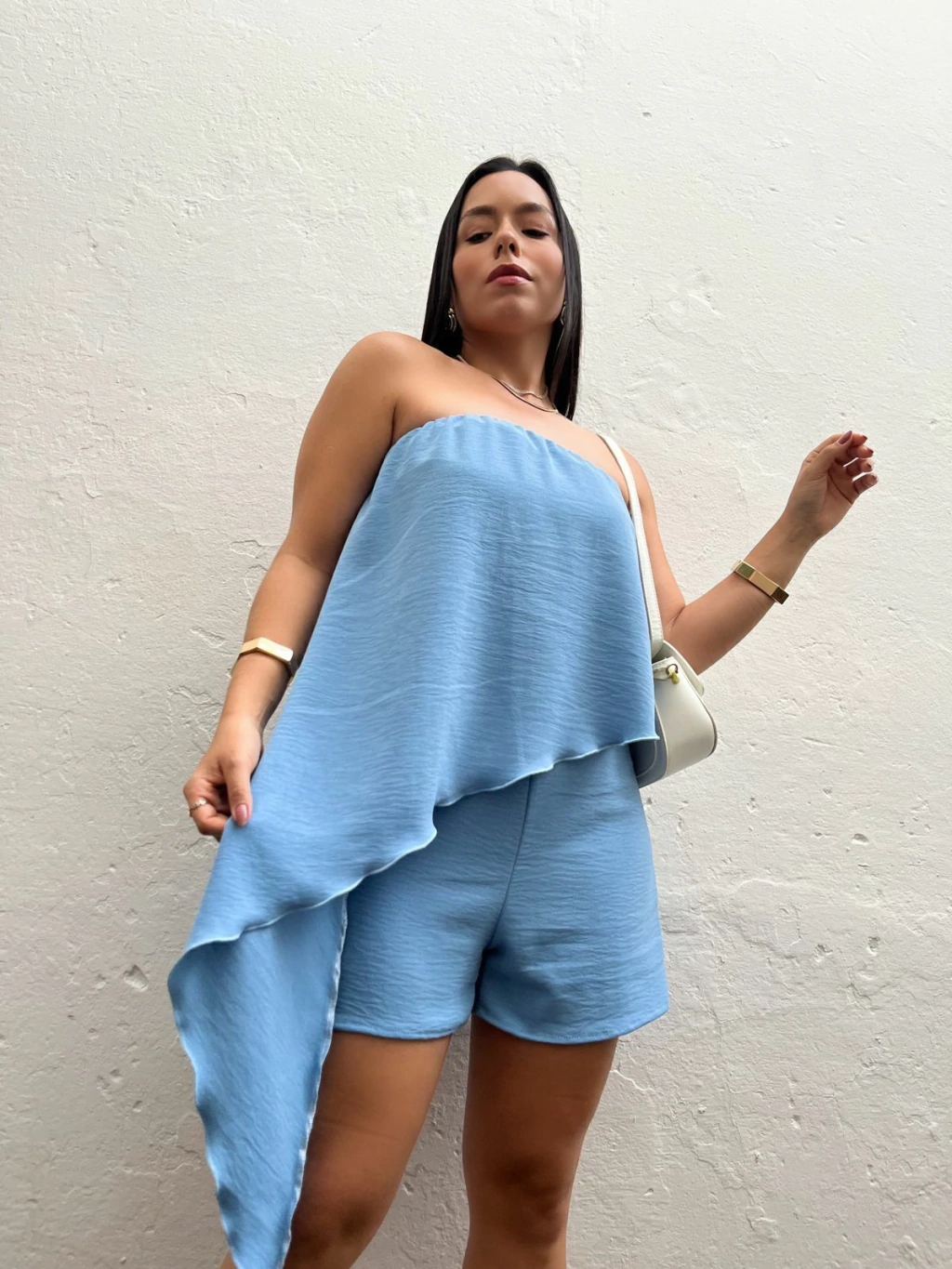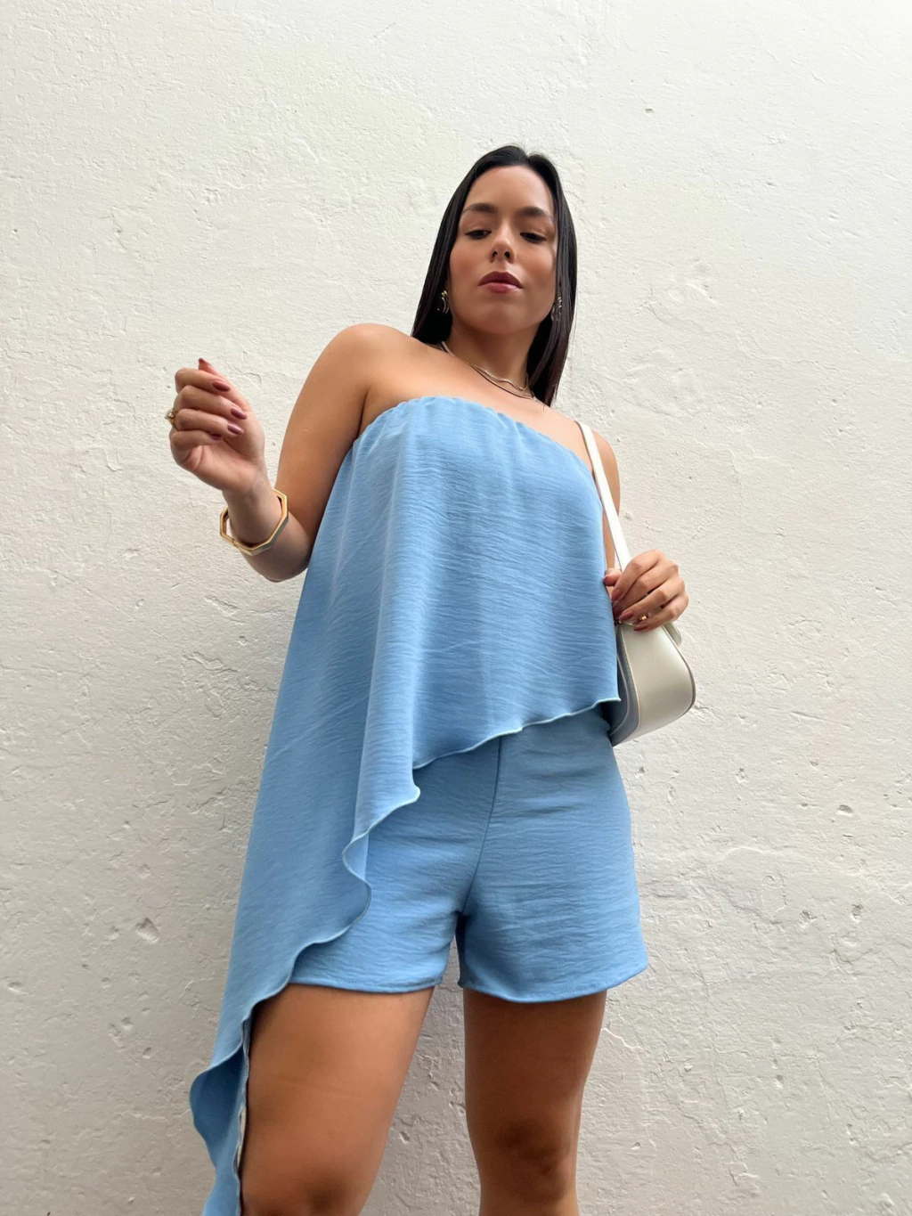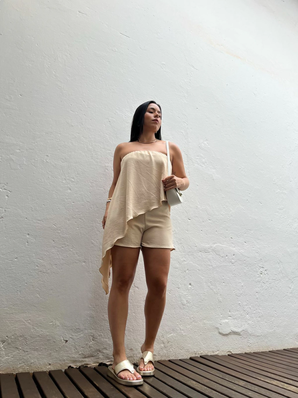 Macaquinho em tecido duna. Possui decote tomara que caia com elástico na parte de cima do busto para meio segurança na peça. Possui uma sobreposição de blusa assimétrica dando um ar mais sofisticado e moderno a peça. Possui fechamento atrás por zíper invisível.Modelo soltinho. Não marca e não fica transparente.