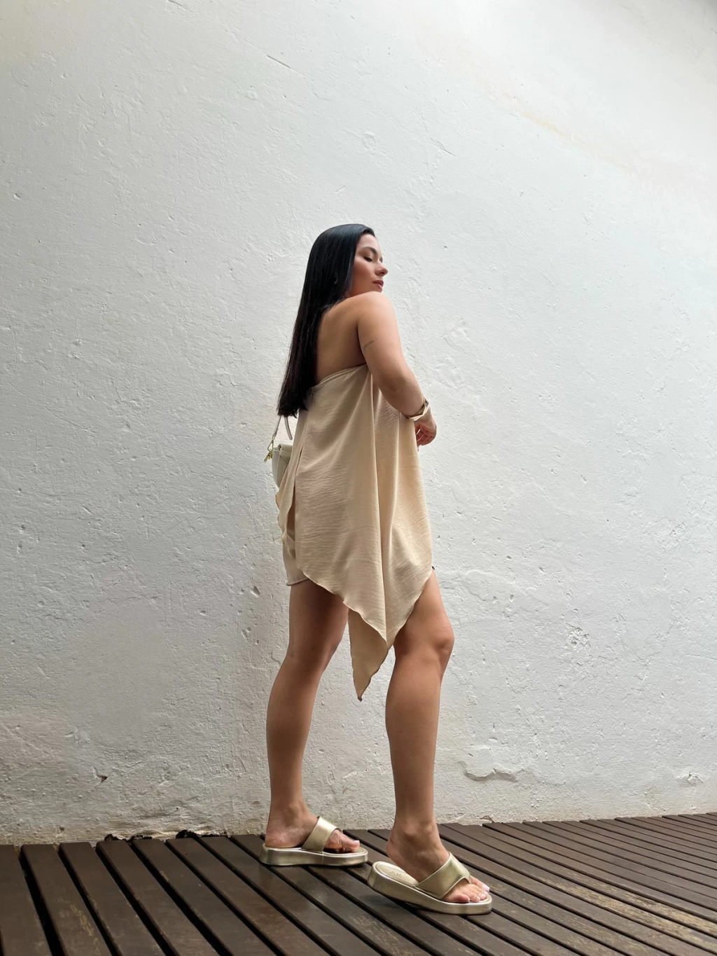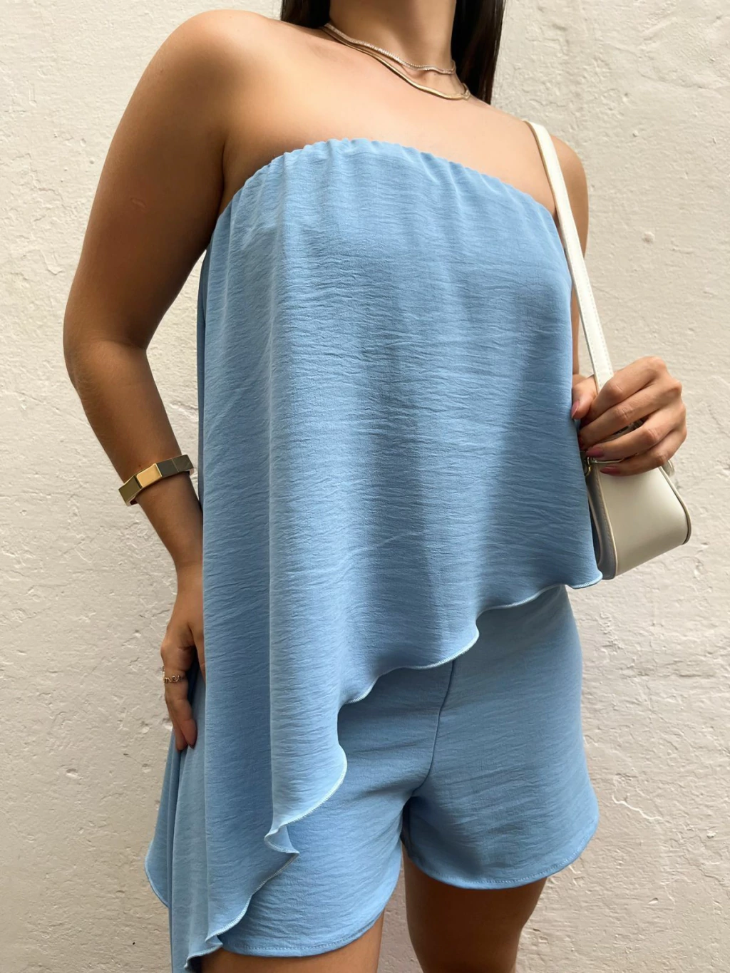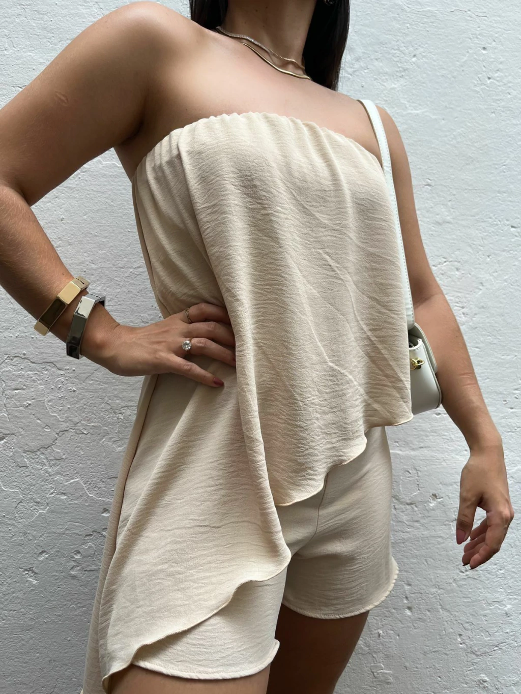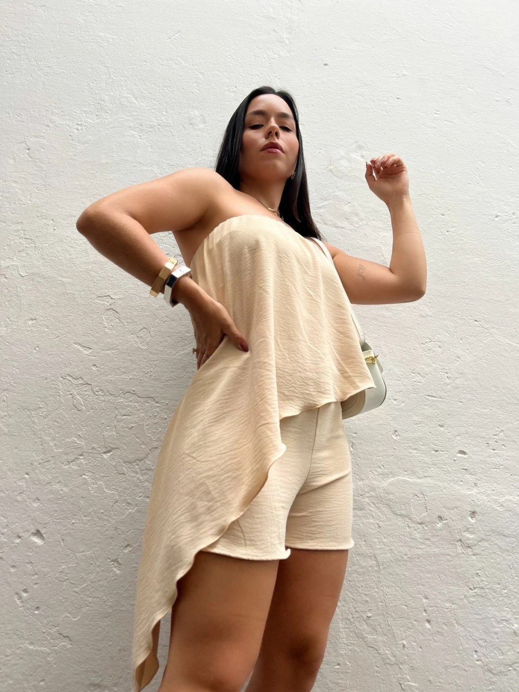 Macaquinho em tecido duna. Possui decote tomara que caia com elástico na parte de cima do busto para meio segurança na peça. Possui uma sobreposição de blusa assimétrica dando um ar mais sofisticado e moderno a peça. Possui fechamento atrás por zíper invisível.Modelo soltinho. Não marca e não fica transparente.