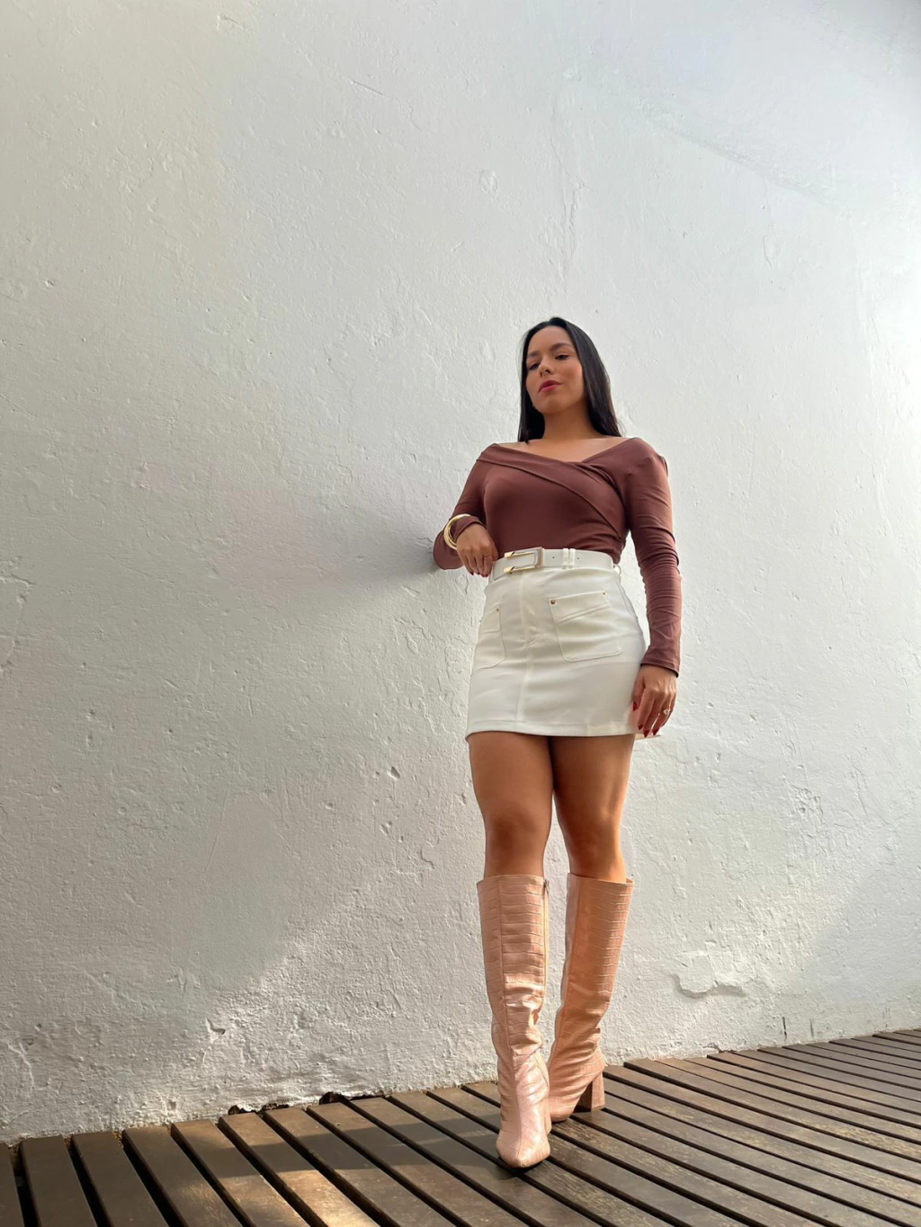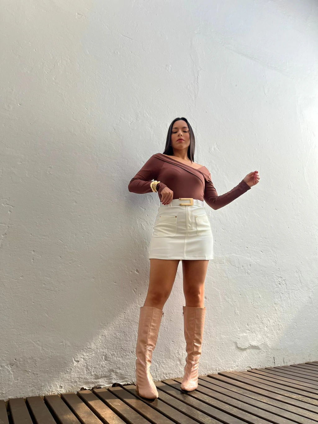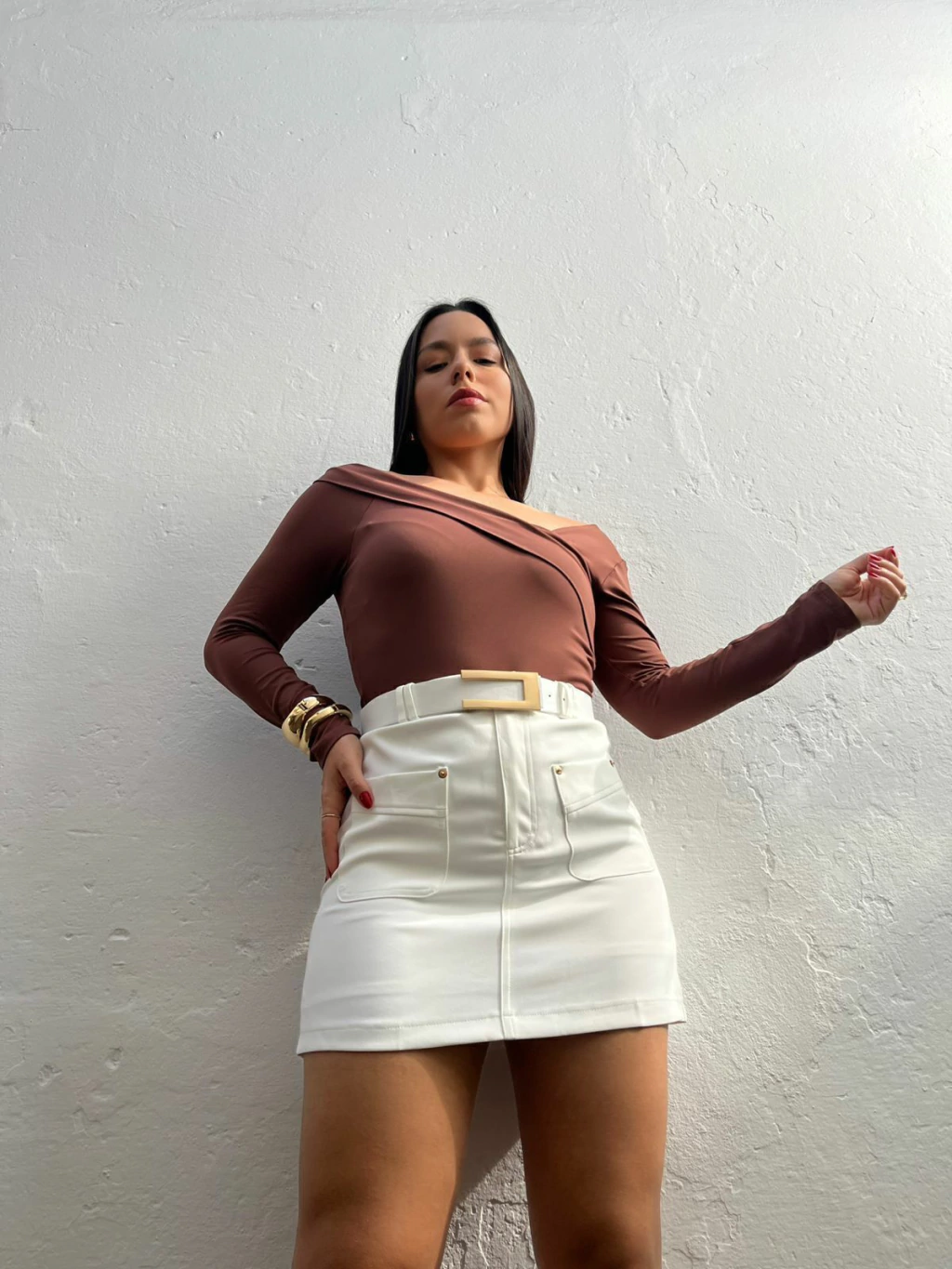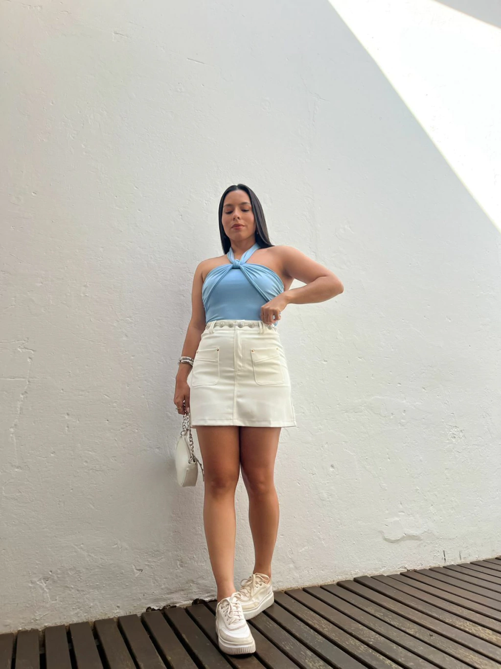 Saia curta em alfaitaria. Possui modelagem cintura alta, com fechamento frontal por um botão e zíper. Acompanha cinto. Possui bolsos frontais. Possui forro de shorts. Modelage mais ajustada ao corpo. Não marca e não fica transparente.