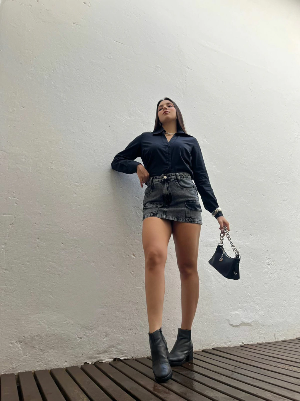 Saia jeans em lavagem de preto estonado. Possui modelagem mini. Pode ser usada baixa ou alta. Possui bolsos frontais, cós com passantes e fechamento por zíper e botão metálico. Jeans sem elastano. Não marca e não fica transparente.