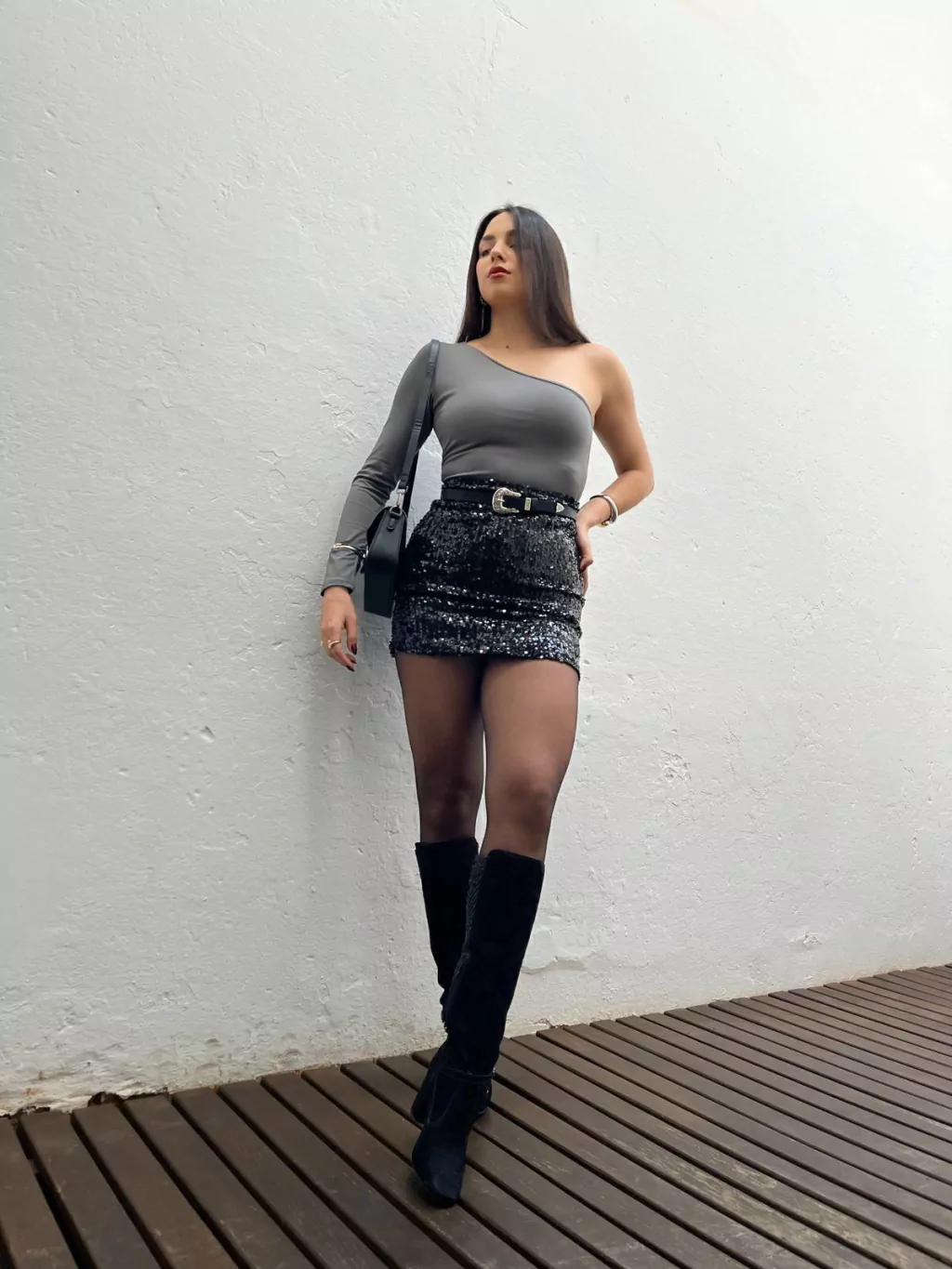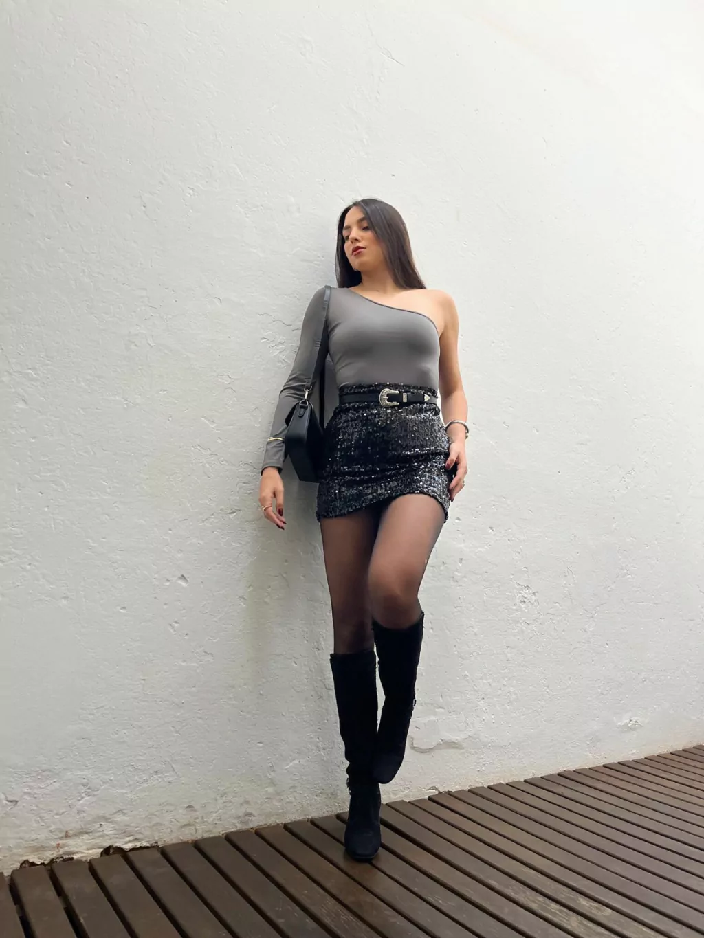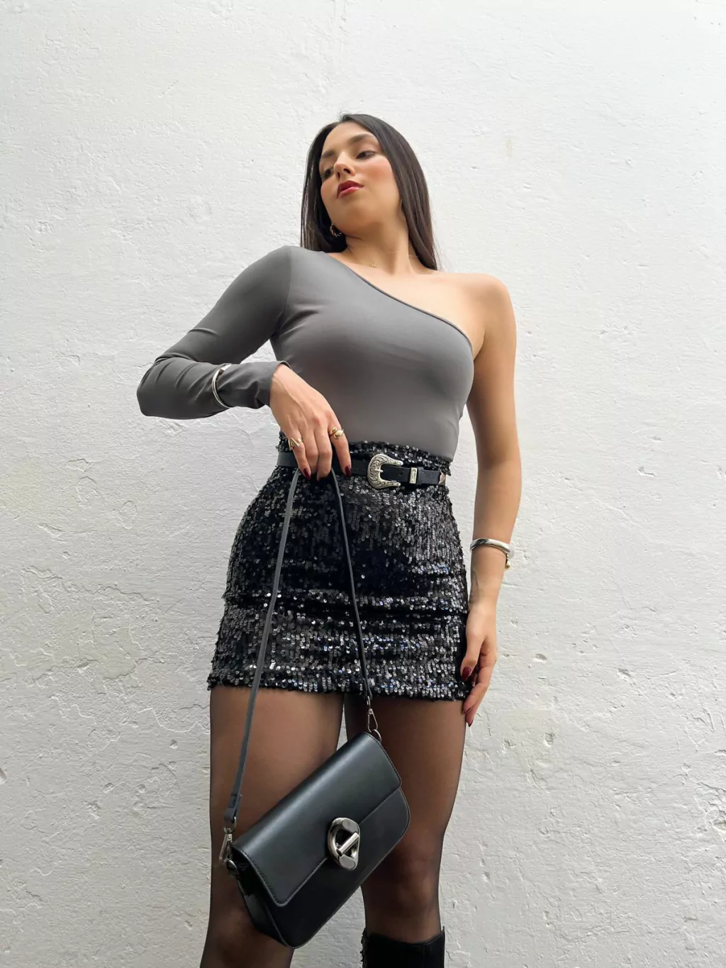 Saia confeccionada em paetê, modelo cintura alta, possui elástico na cintura. Tecido possui forro. Possui caimento ajustado ao corpo e mais curtinho. Não marca e não fica transparente.
