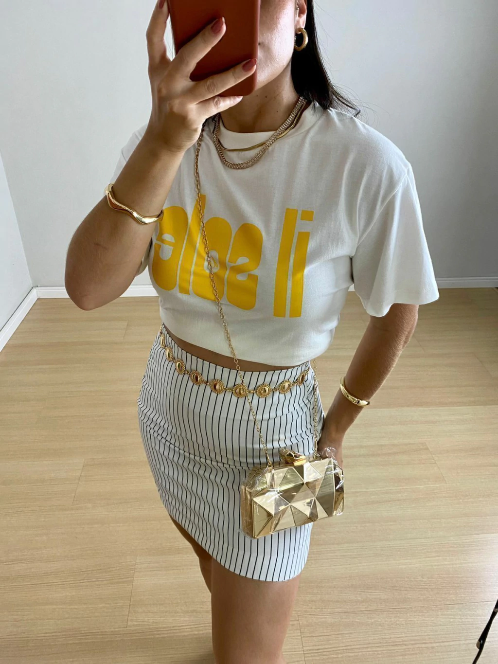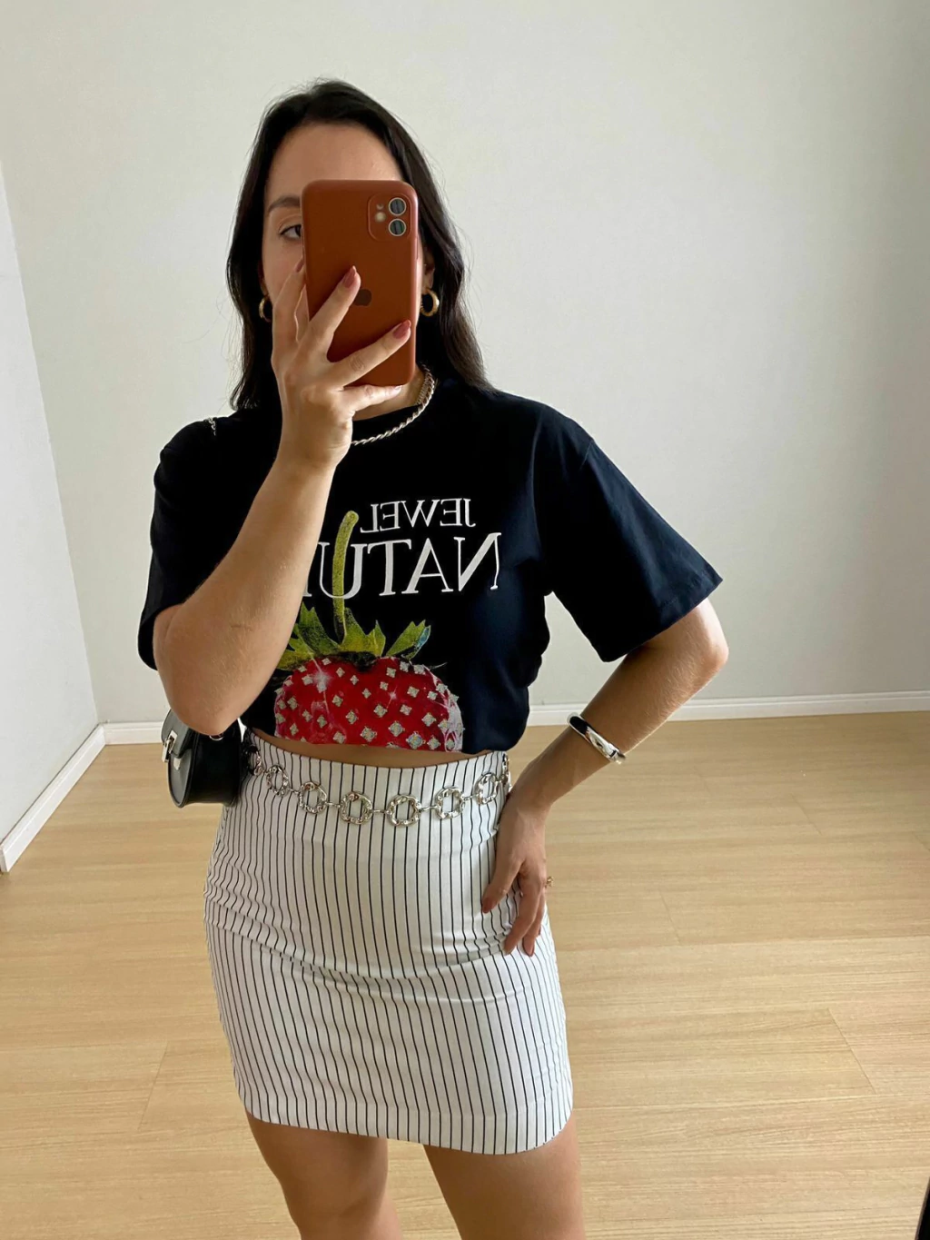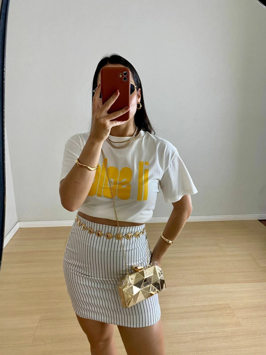 Saia em alfaitaria listrada. Possui cós liso com fechamento atrás por zíper invisível. Possui modelagem mais ajustada ao corpo e barra arredondada. Possui tecido encorpado, não marca e não fica transparente.