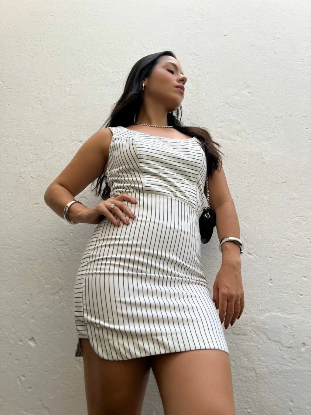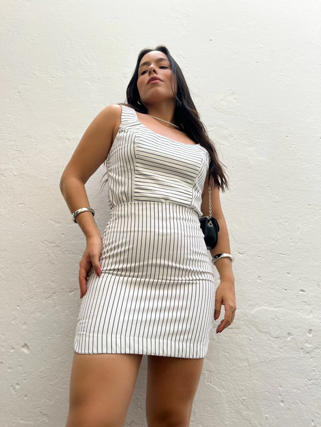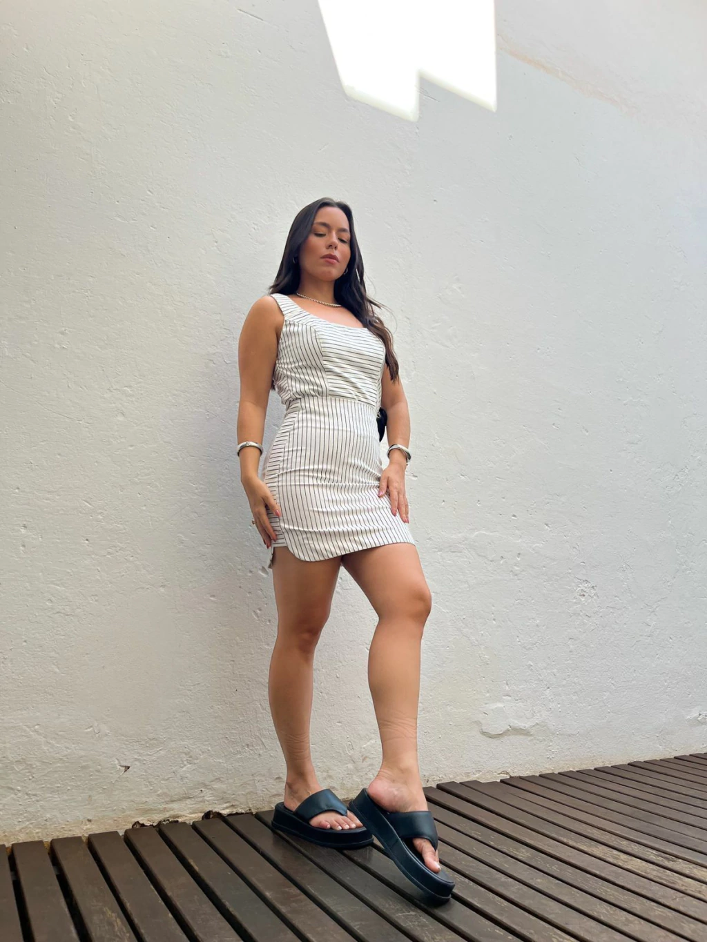 Saia em alfaitaria listrada. Possui cós liso com fechamento atrás por zíper invisível. Possui modelagem mais ajustada ao corpo e barra arredondada. Possui tecido encorpado, não marca e não fica transparente.