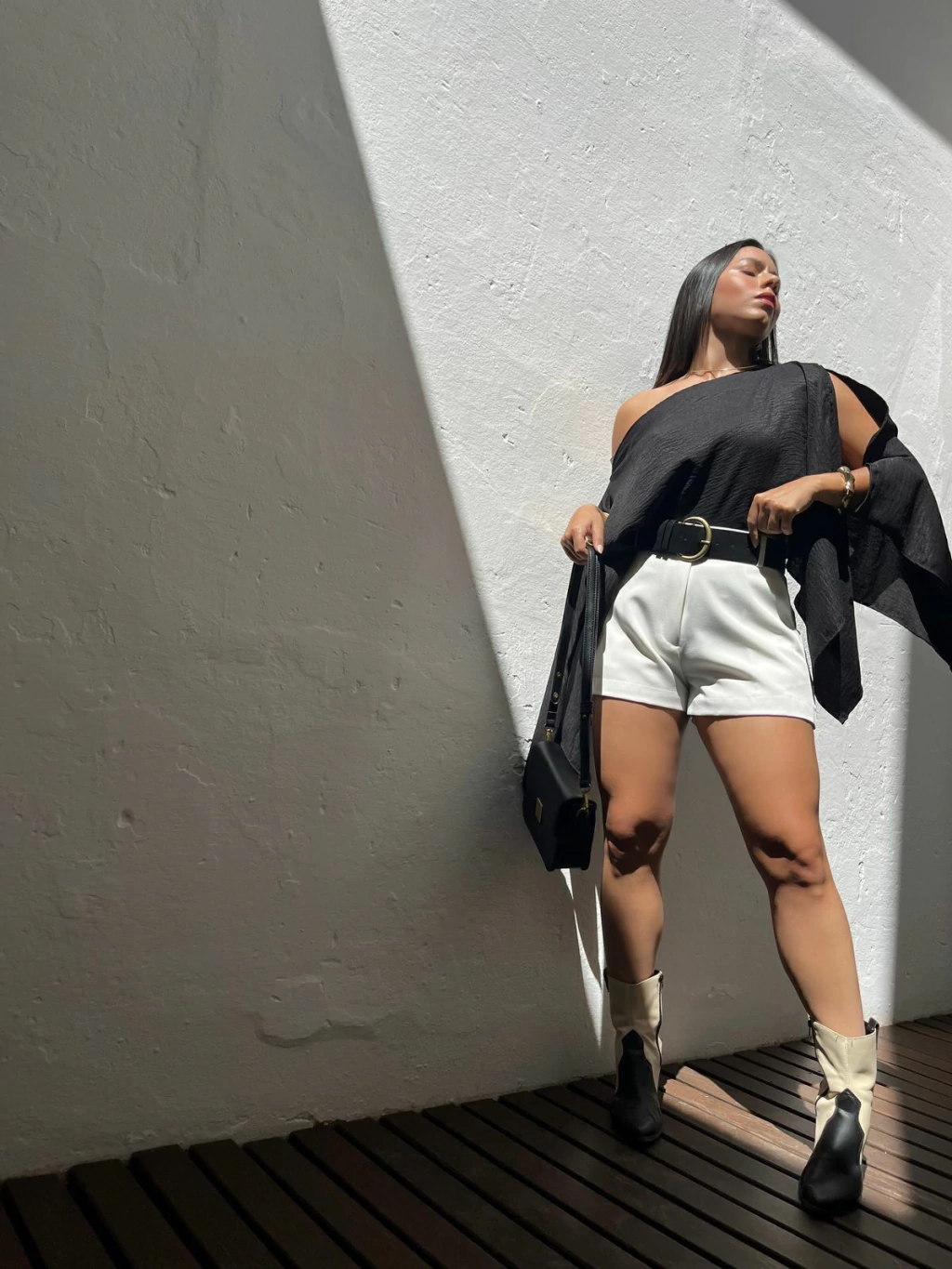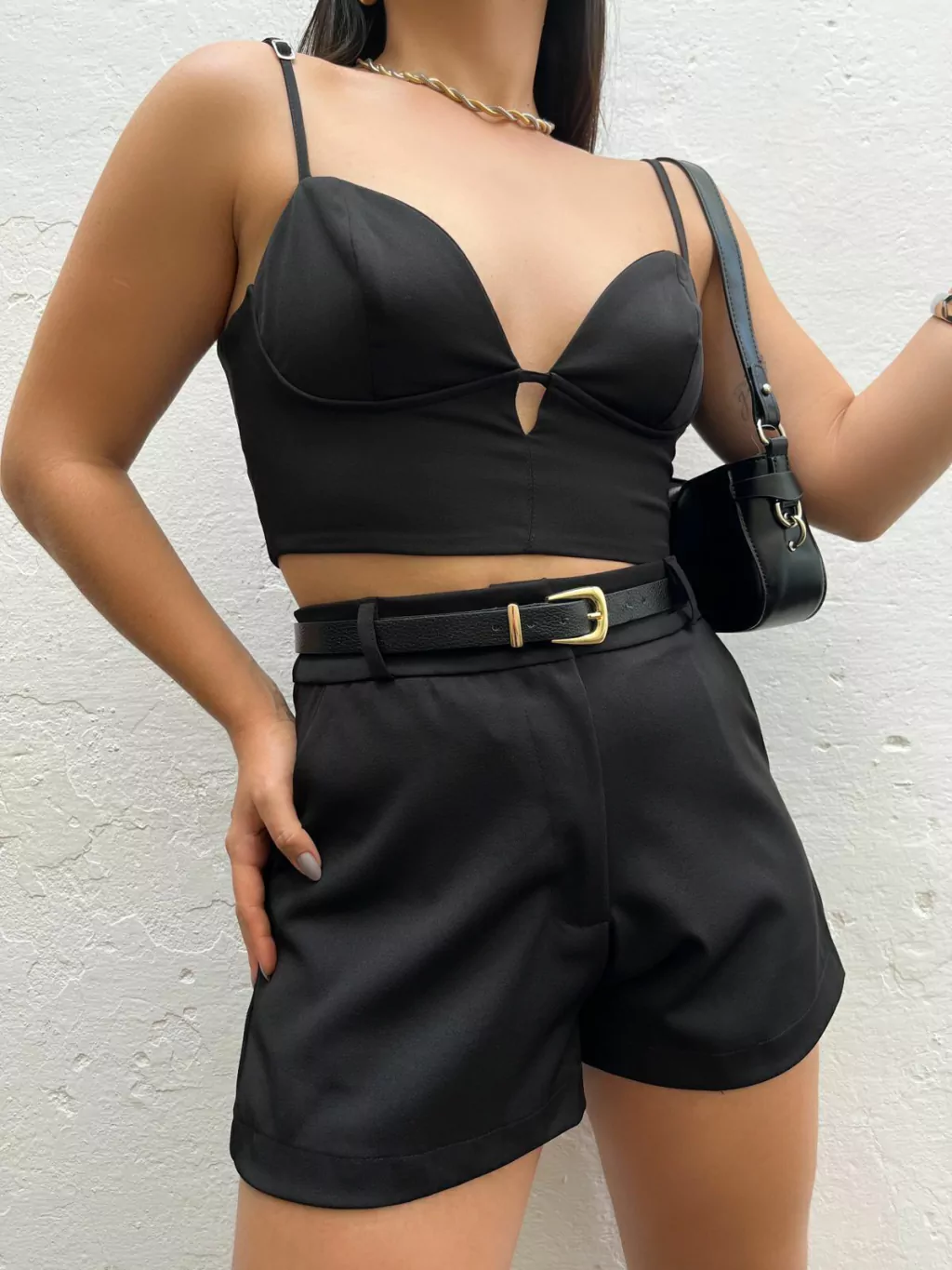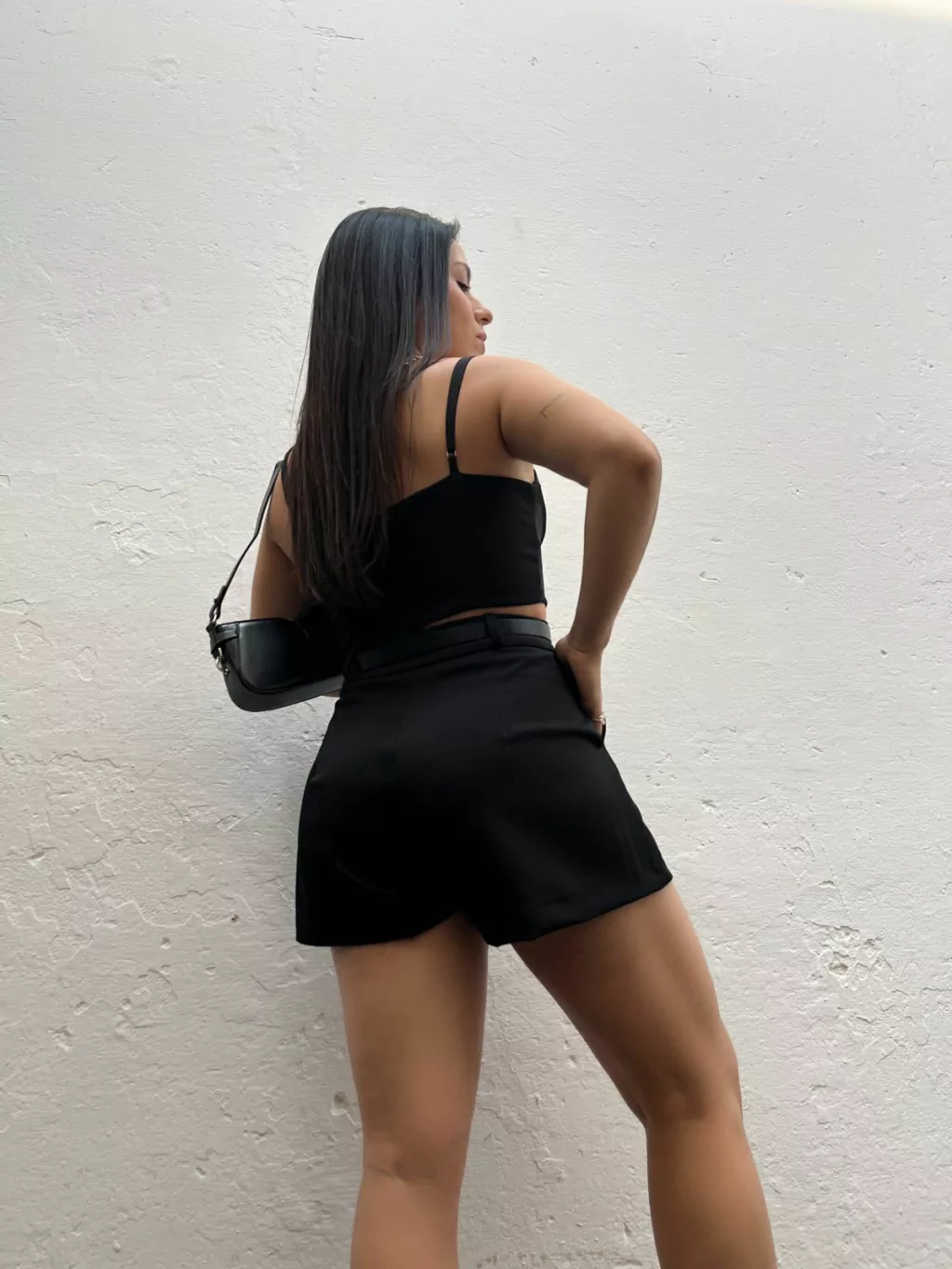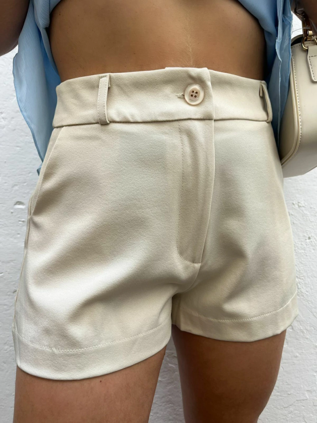 Shorts em crepe de alfaiataria.Possui modelagem cintura alta com fechamento frontal por um botão e zíper. Possui cós com passantes e bolso faca. Possui forro. Não marca e não fica transparente.