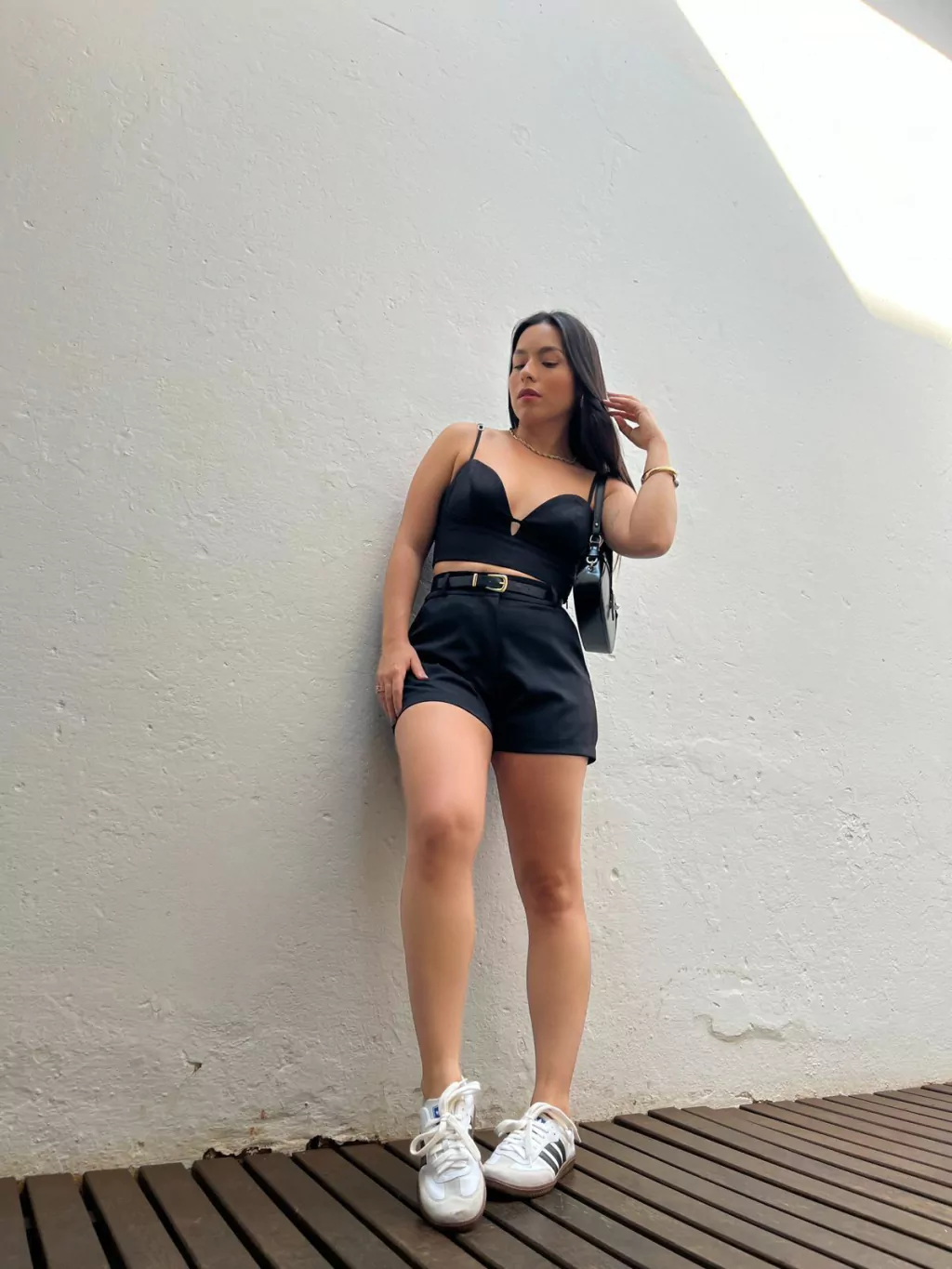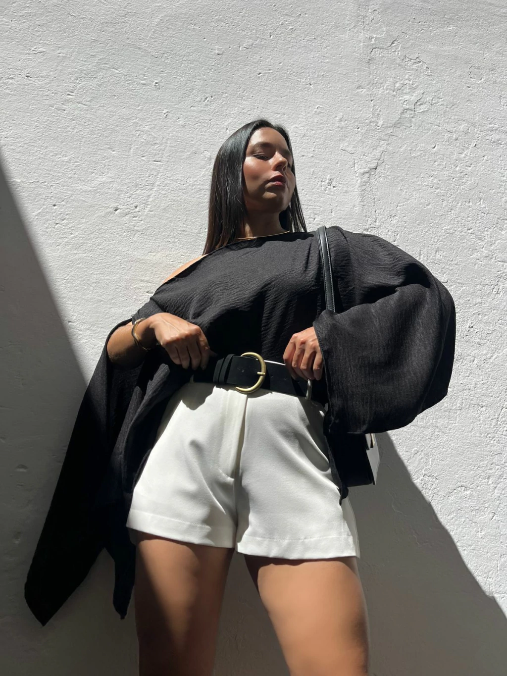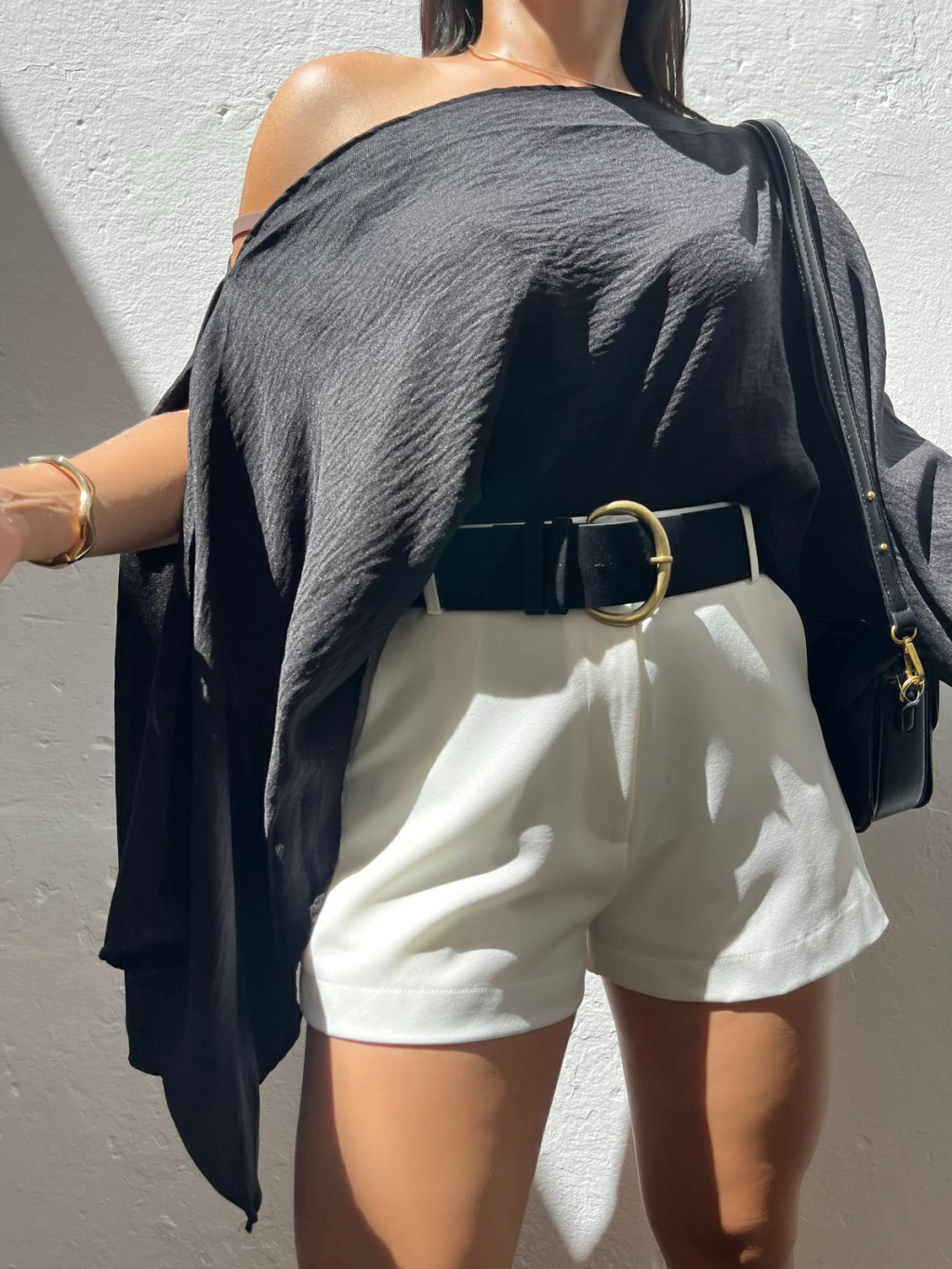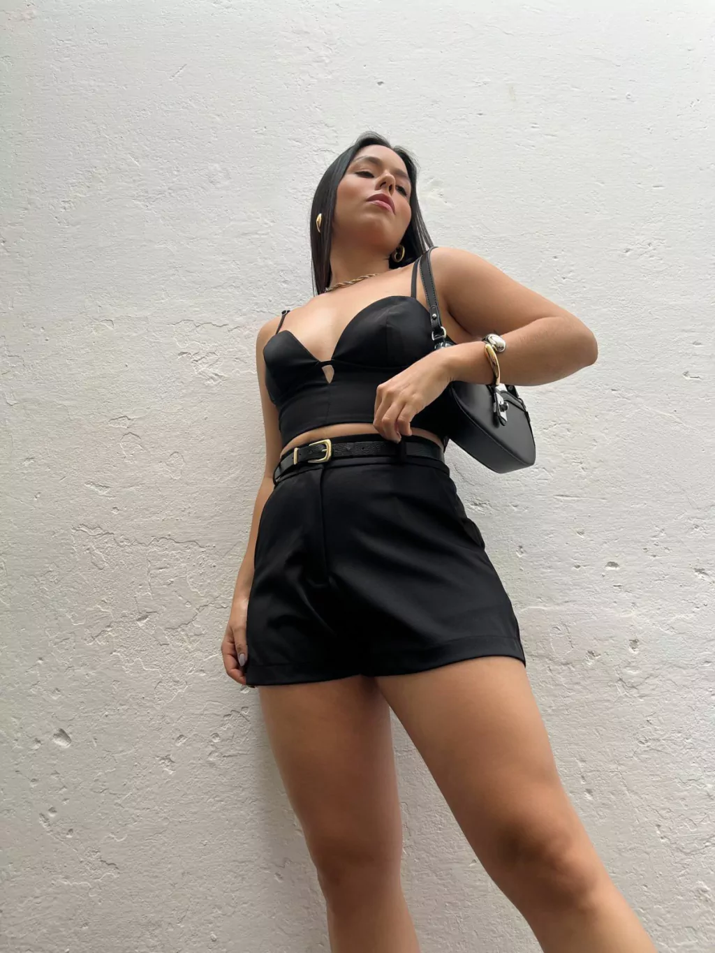 Shorts em crepe de alfaiataria.Possui modelagem cintura alta com fechamento frontal por um botão e zíper. Possui cós com passantes e bolso faca. Possui forro. Não marca e não fica transparente.