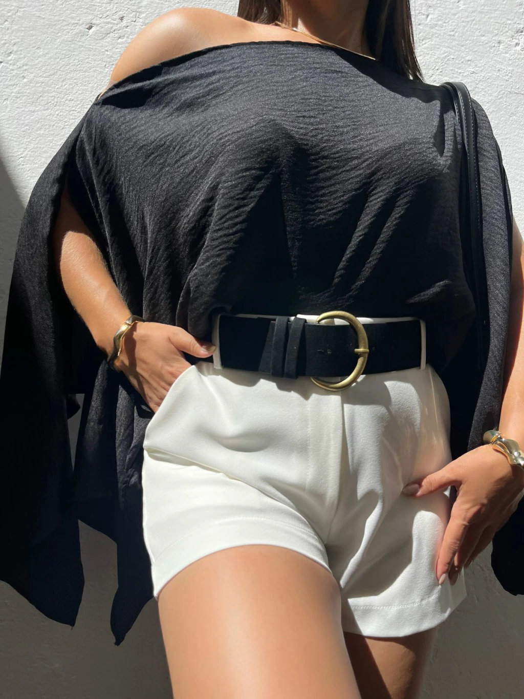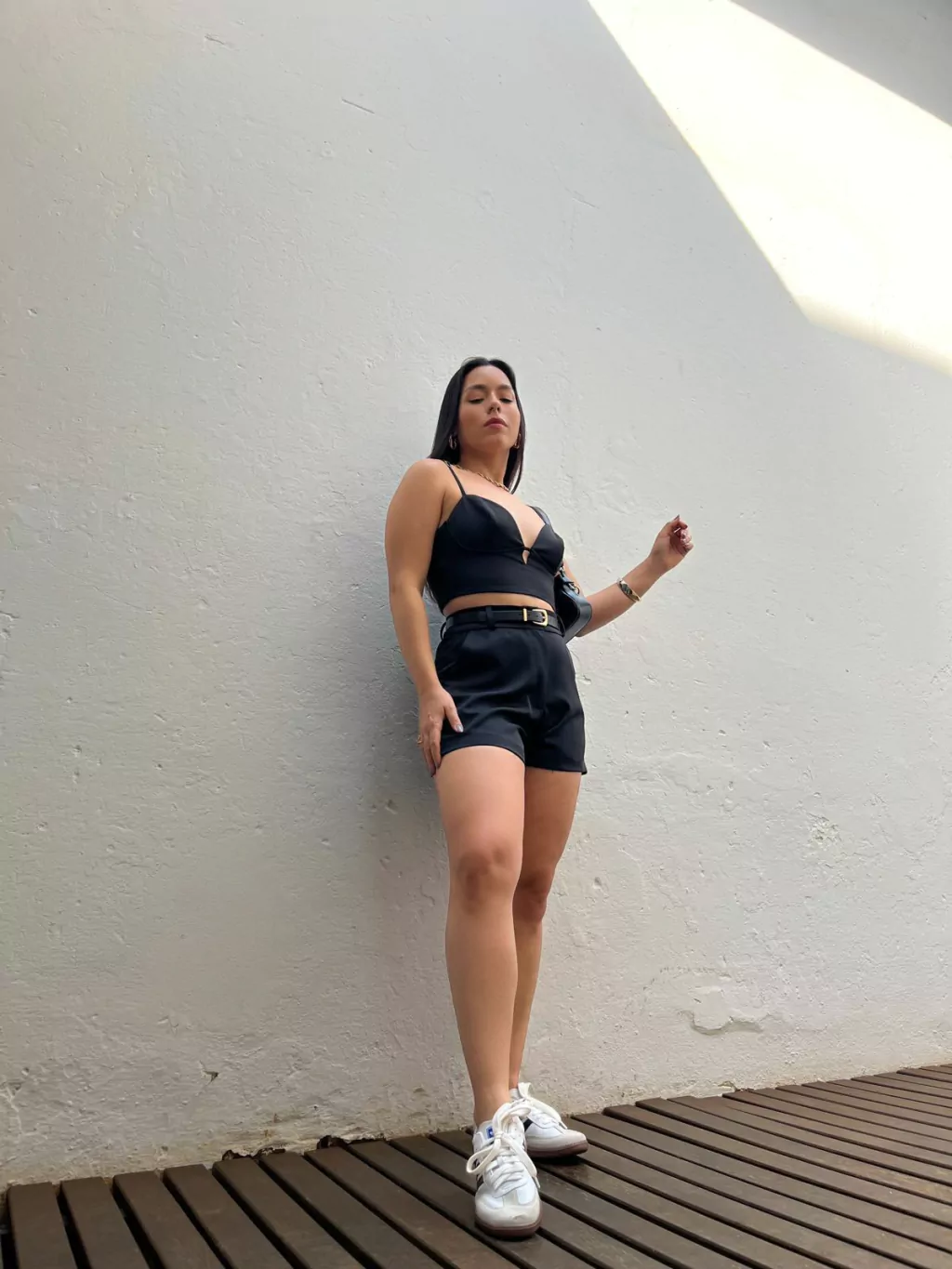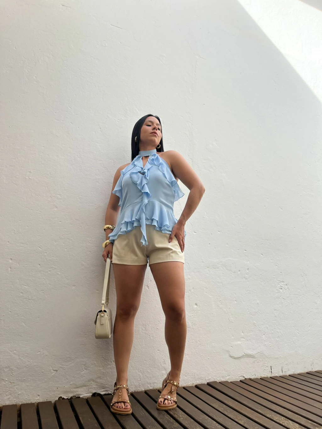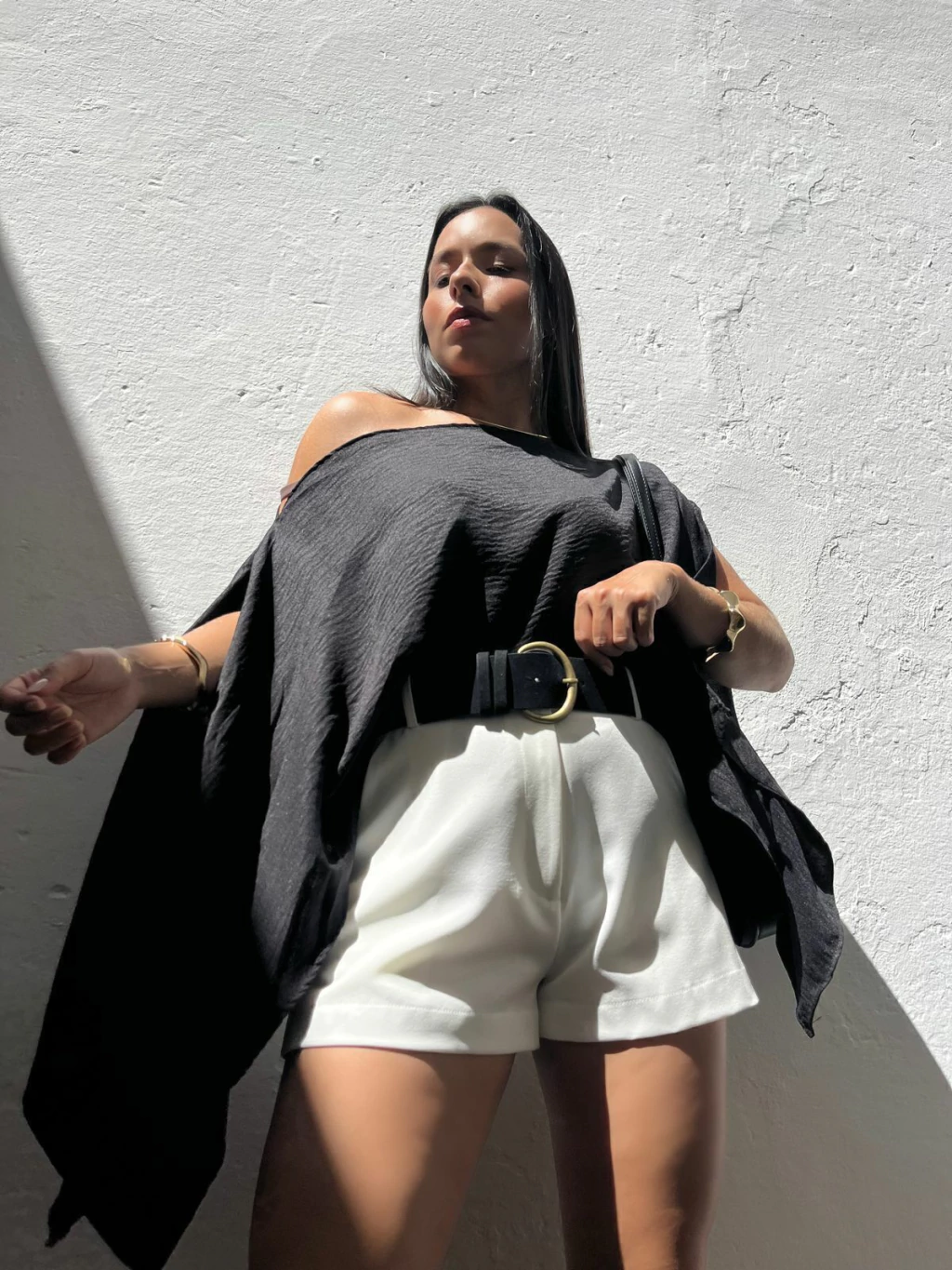 Shorts em crepe de alfaiataria.Possui modelagem cintura alta com fechamento frontal por um botão e zíper. Possui cós com passantes e bolso faca. Possui forro. Não marca e não fica transparente.