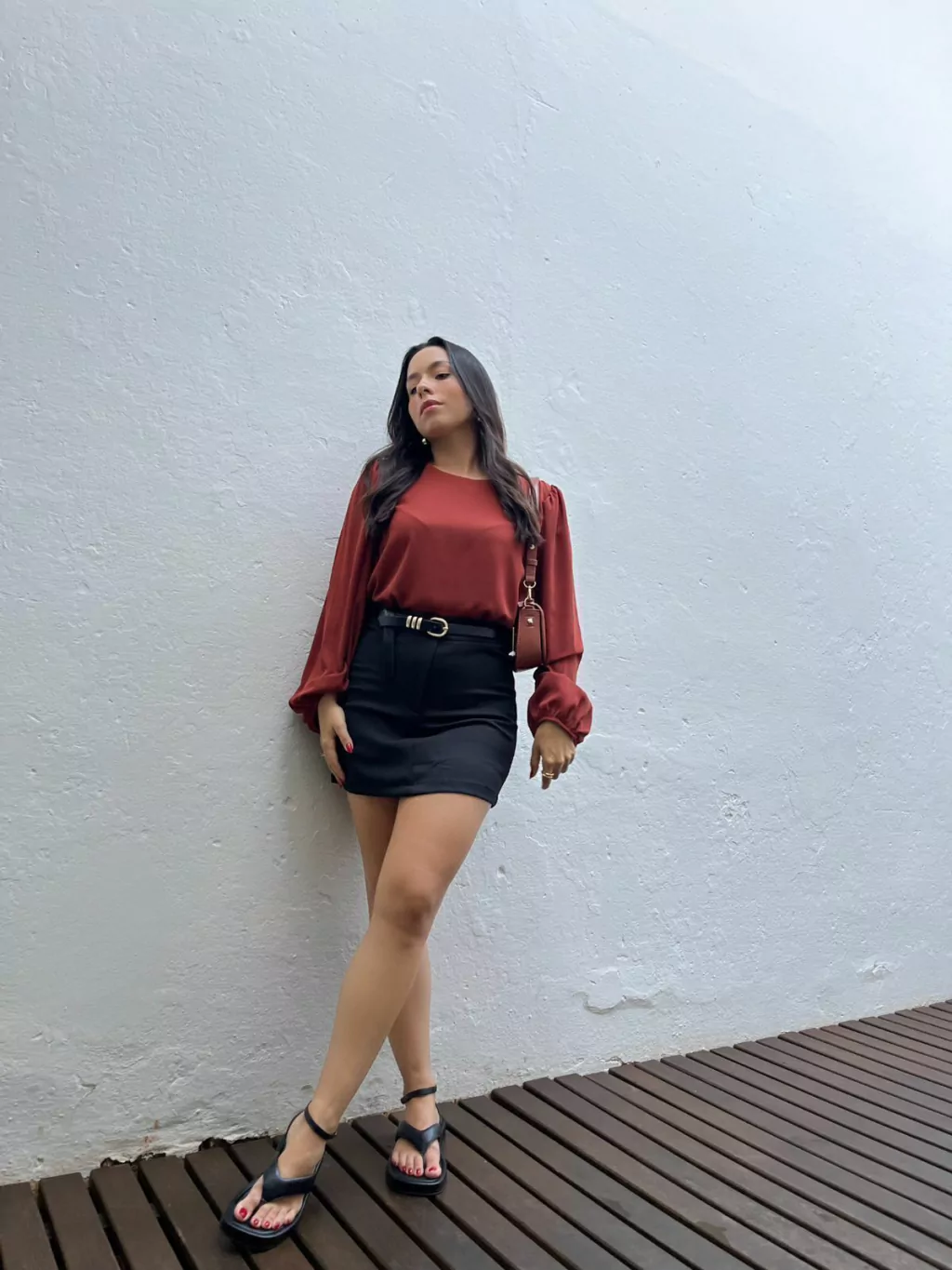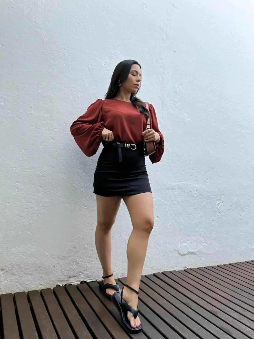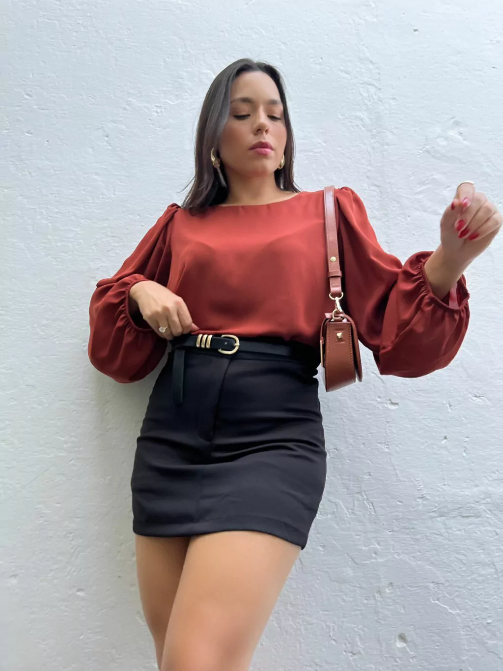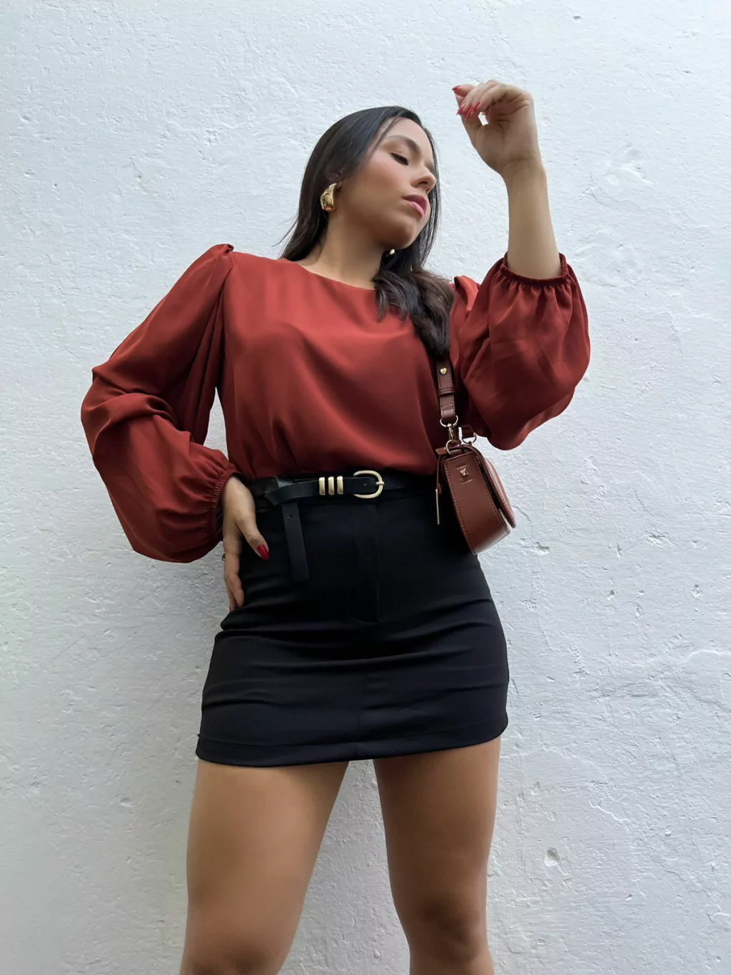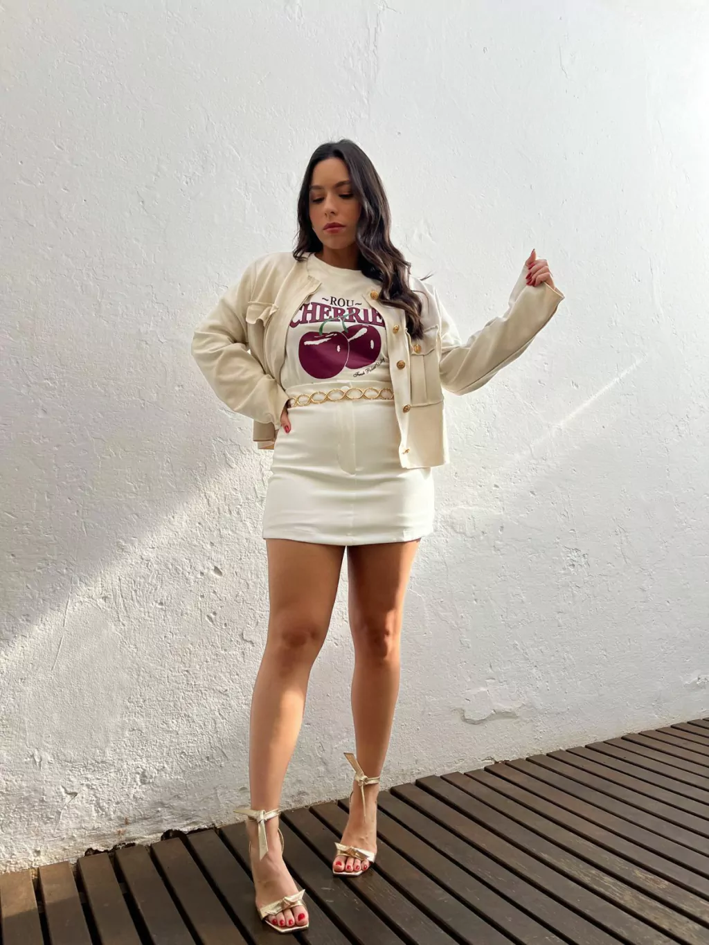 Shorts/saia confeccionado em crepe. Possui fechamento com um botão encapado e zíper. Possui shorts por baixa e saia por cima. Possui bolso faca e passantes. Não marca e não fica transparente.