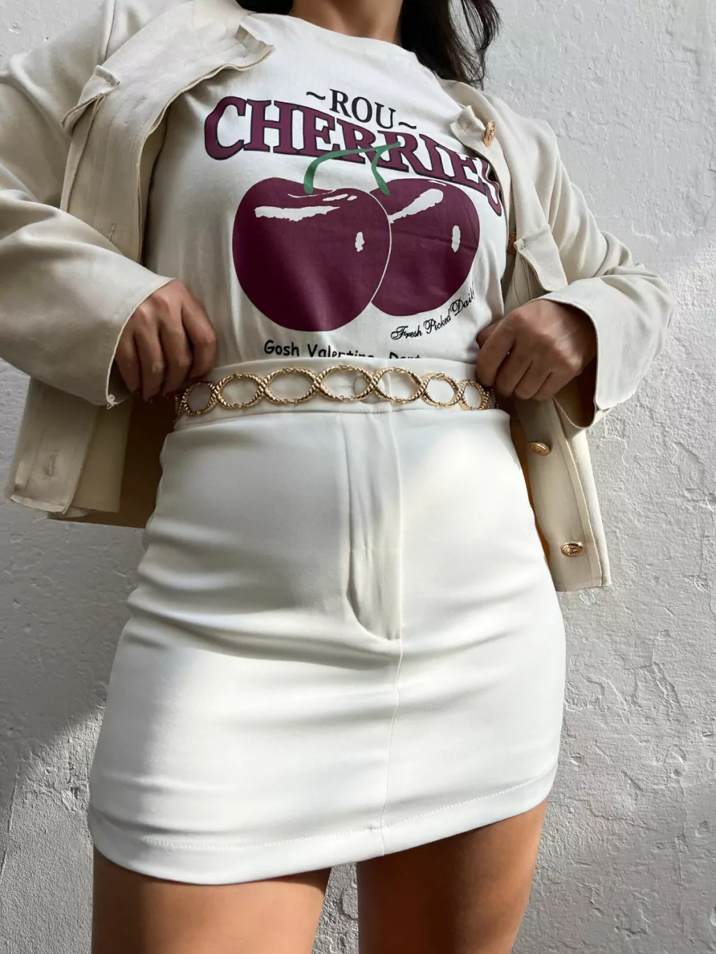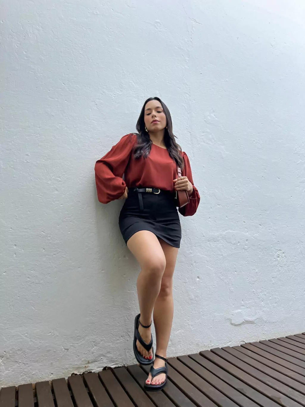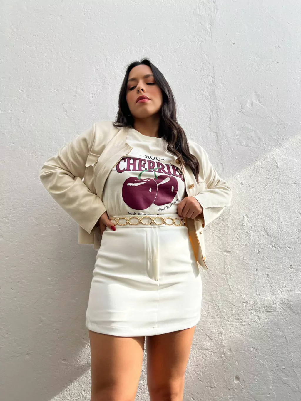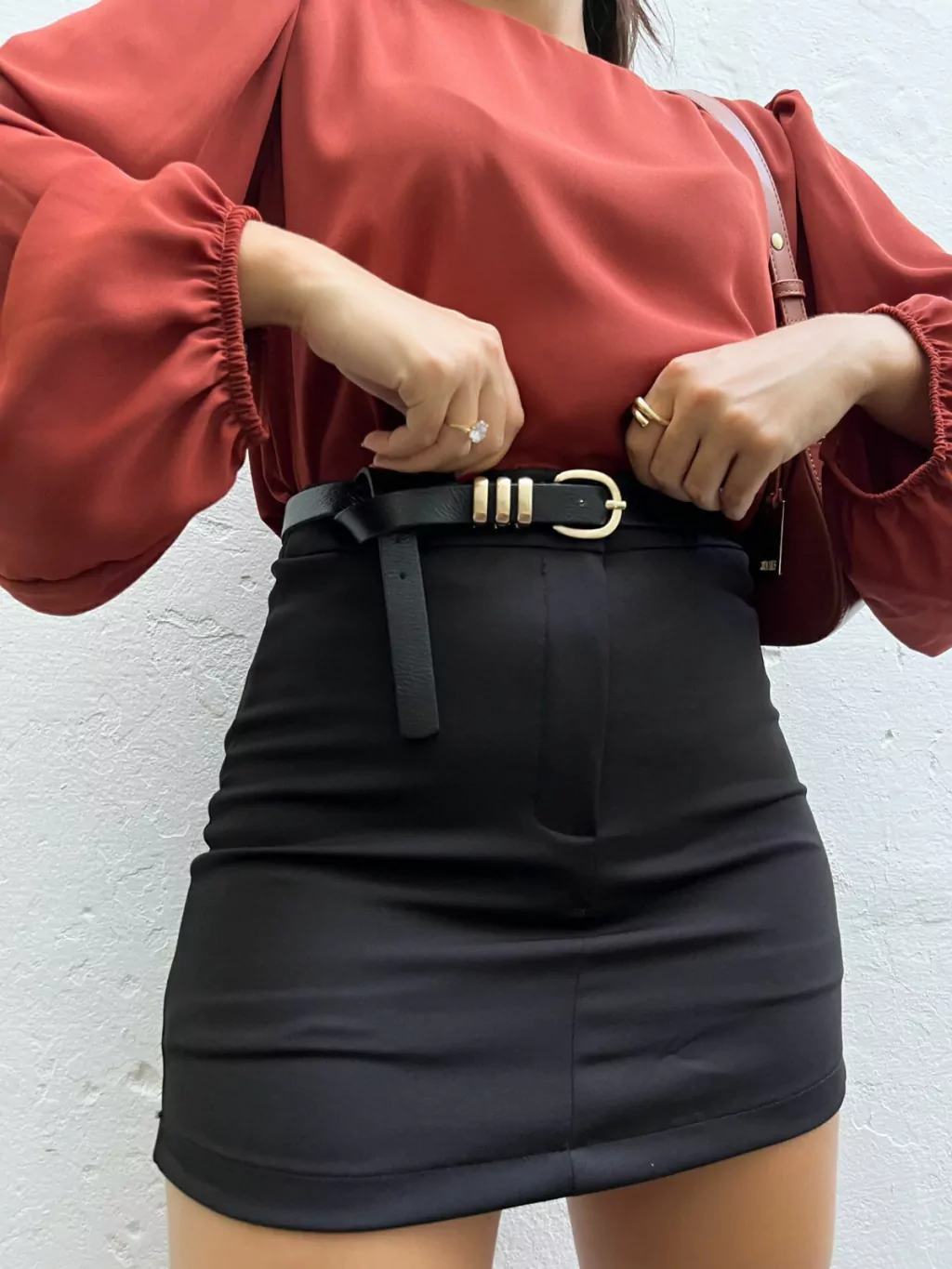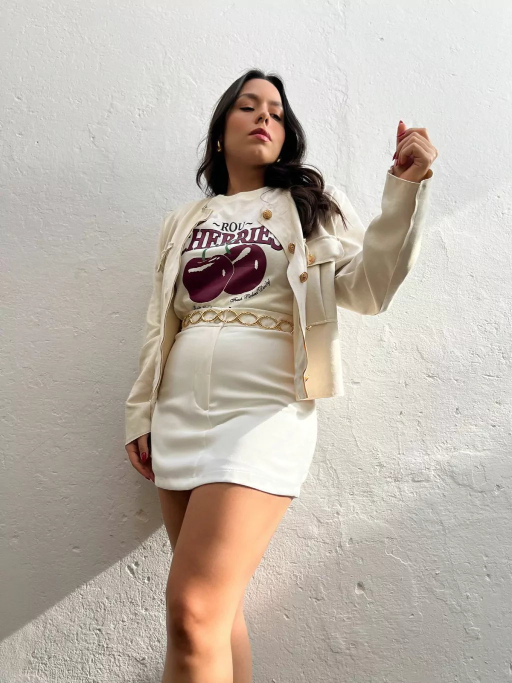 Shorts/saia confeccionado em crepe. Possui fechamento com um botão encapado e zíper. Possui shorts por baixa e saia por cima. Possui bolso faca e passantes. Não marca e não fica transparente.