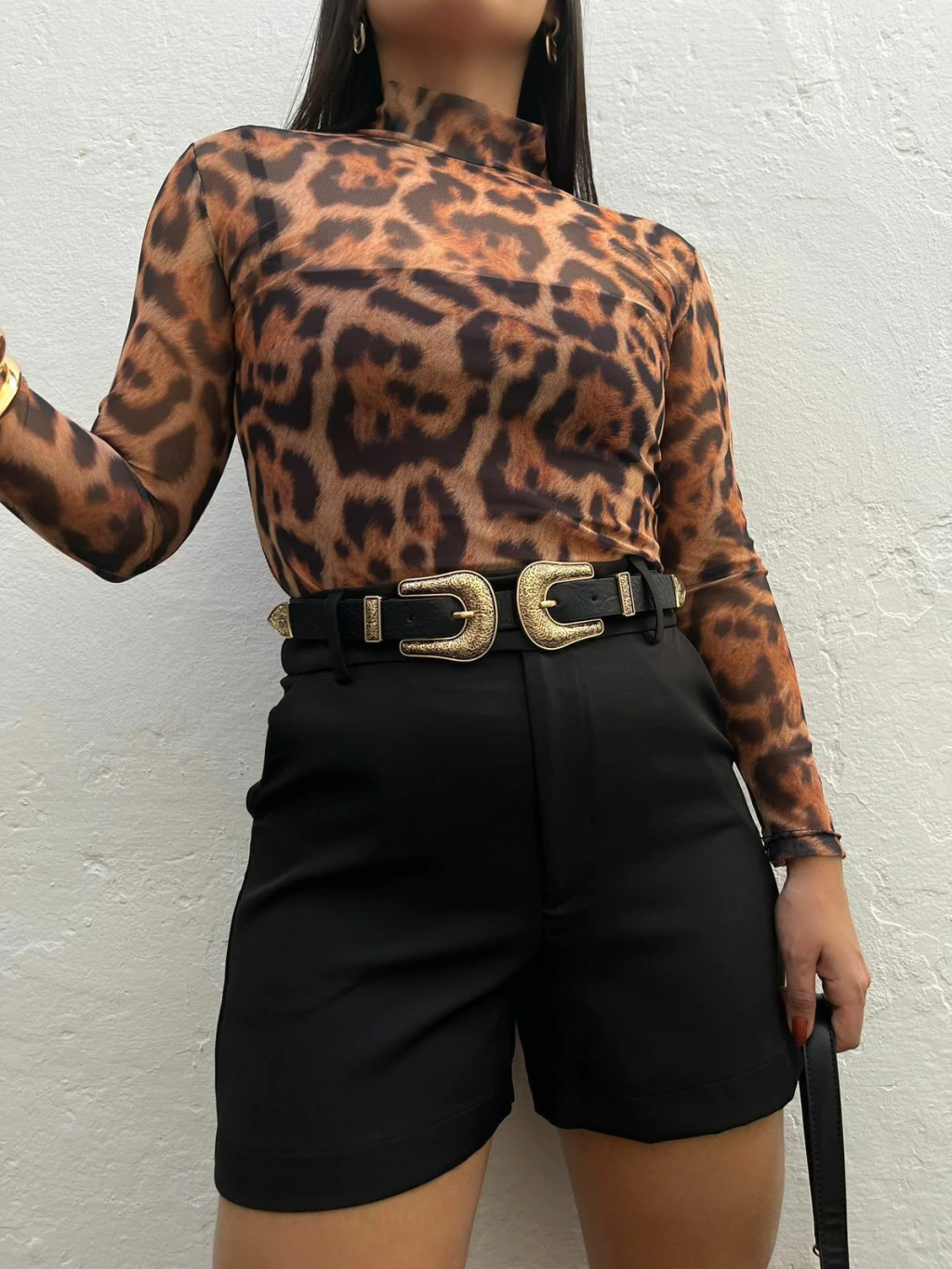 Shorts em crepe de alfaiataria. Possui modelagem cintura alta com fechamento deslocado para a lateral por um gancho interno e zíper. Possui cós com passantes e bolso faca. Não marca e não fica transparente.