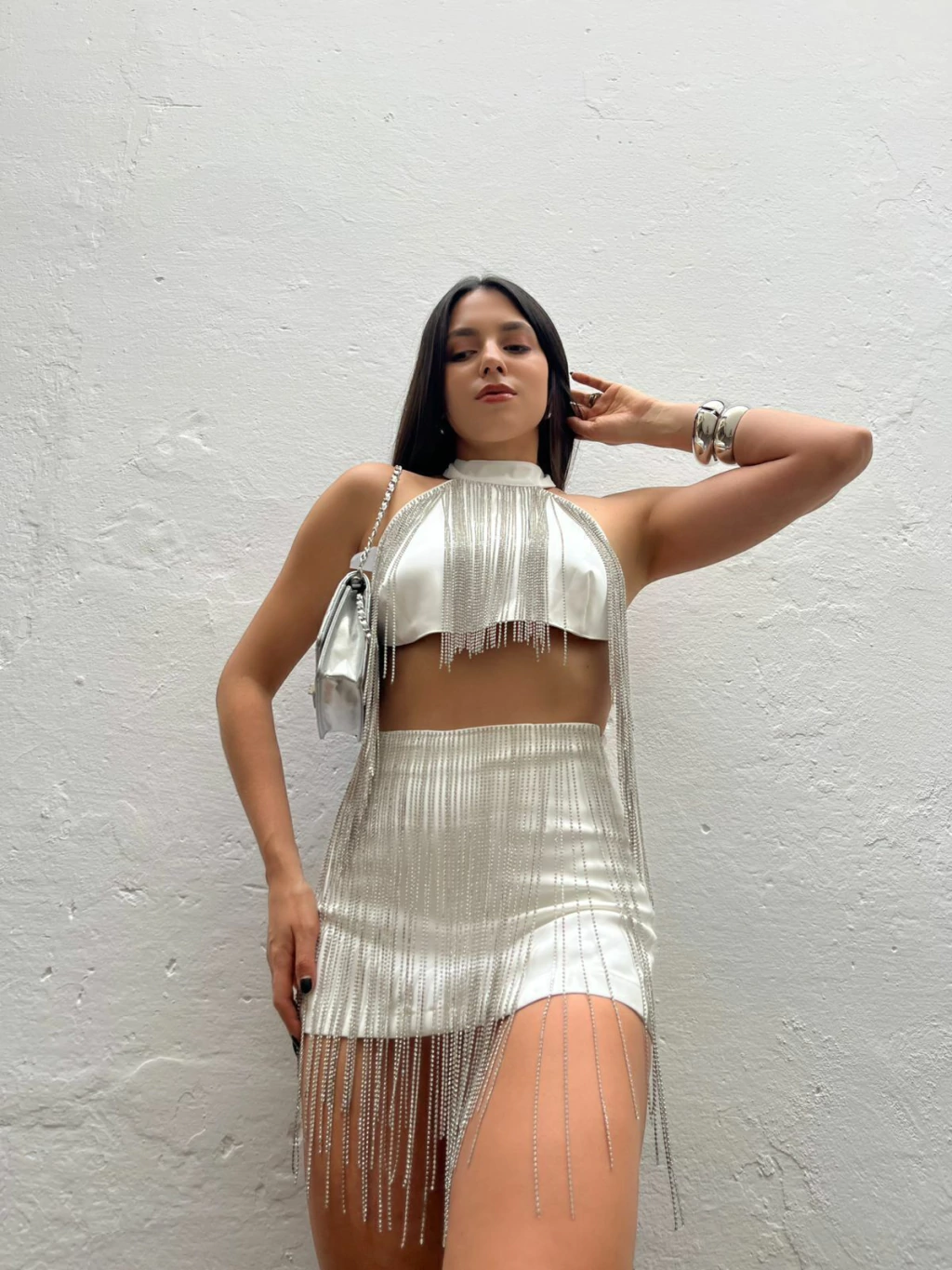 Shorts em crepe de alfaiataria. Possui modelagem cintura alta, fechamento lateral com zíper invisível. Possui aplicação de brilhos (strass) a partir do cós em formato de franjas. Não marca e não fica transparente.