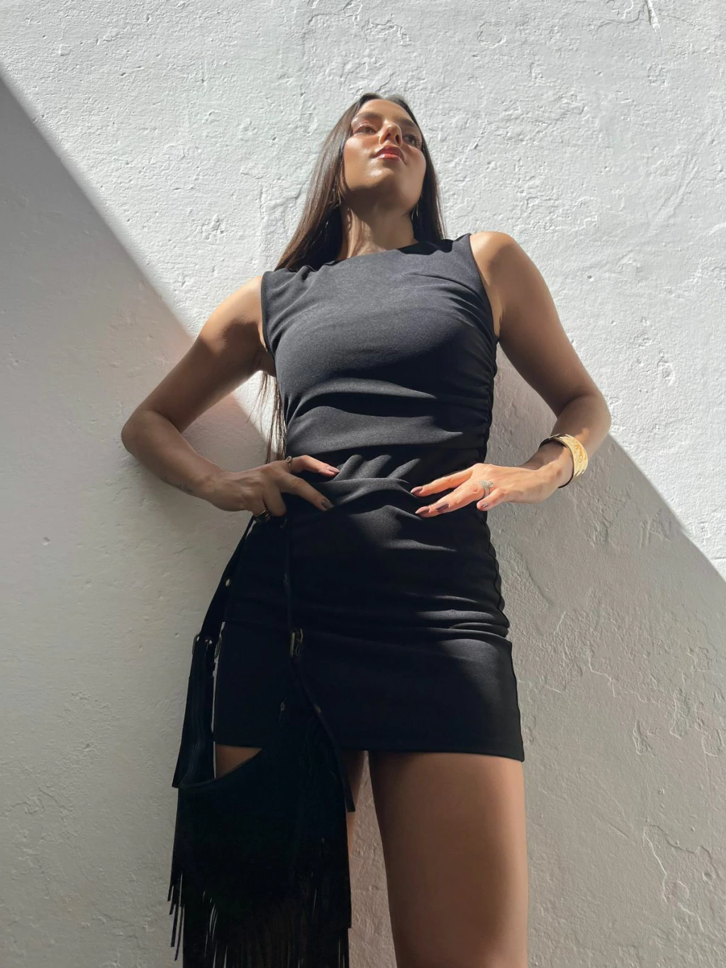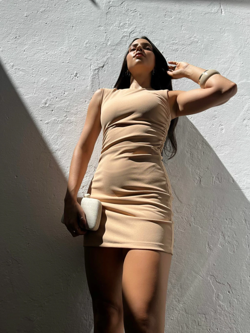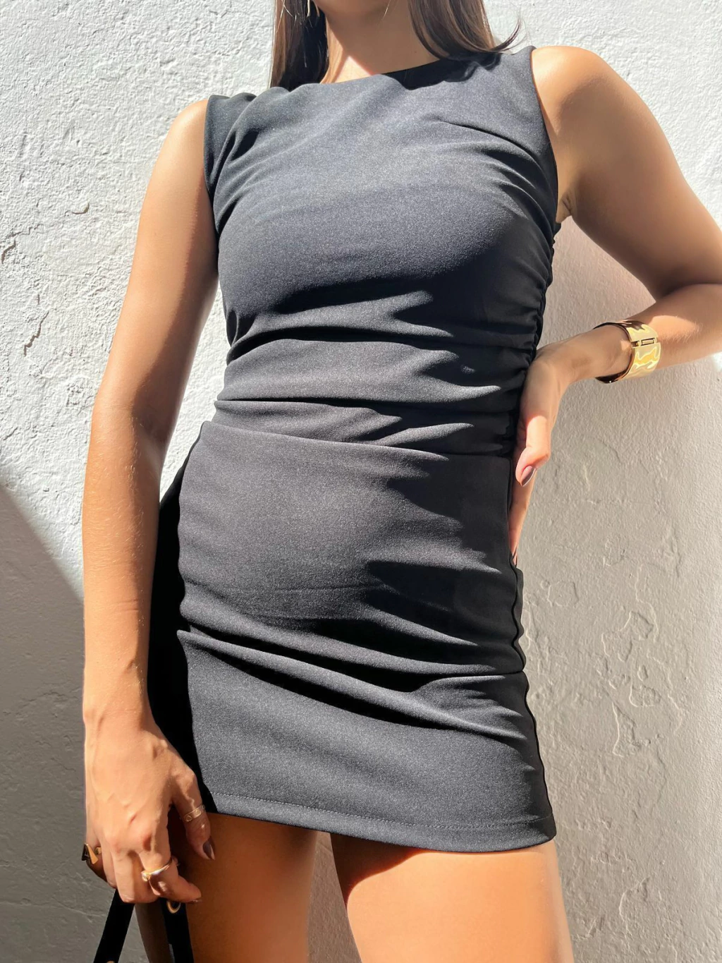 Vestido curto em crepe. Possui alças grossas, caimento ajustado ao corpo e drapeado na lateral da cintura. Possui tecido encorpado, todo forrado. Não marca e não fica transparente.