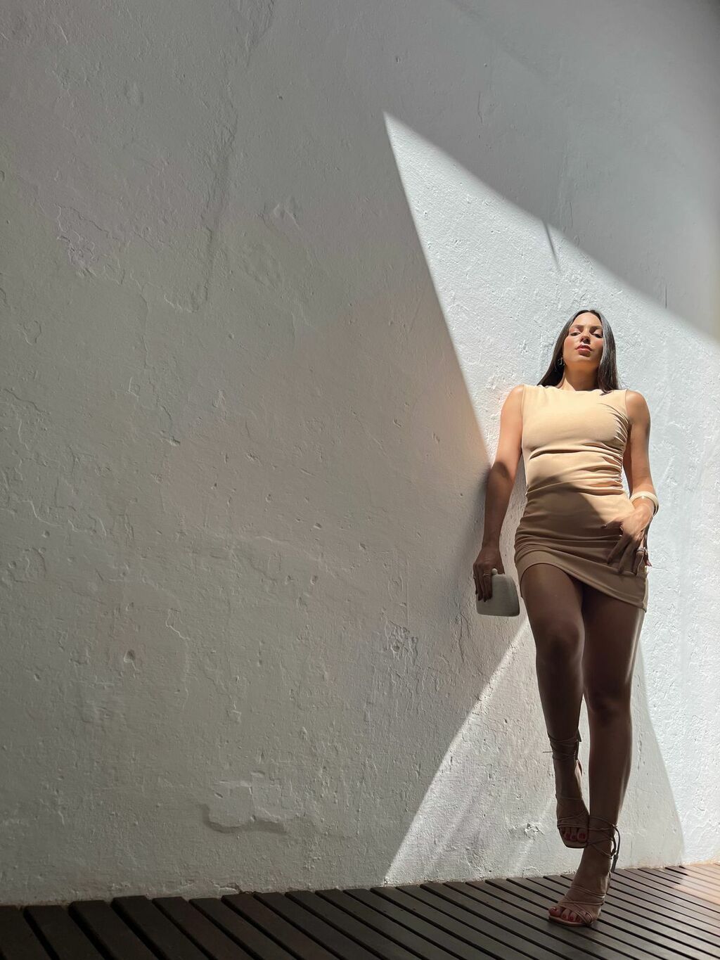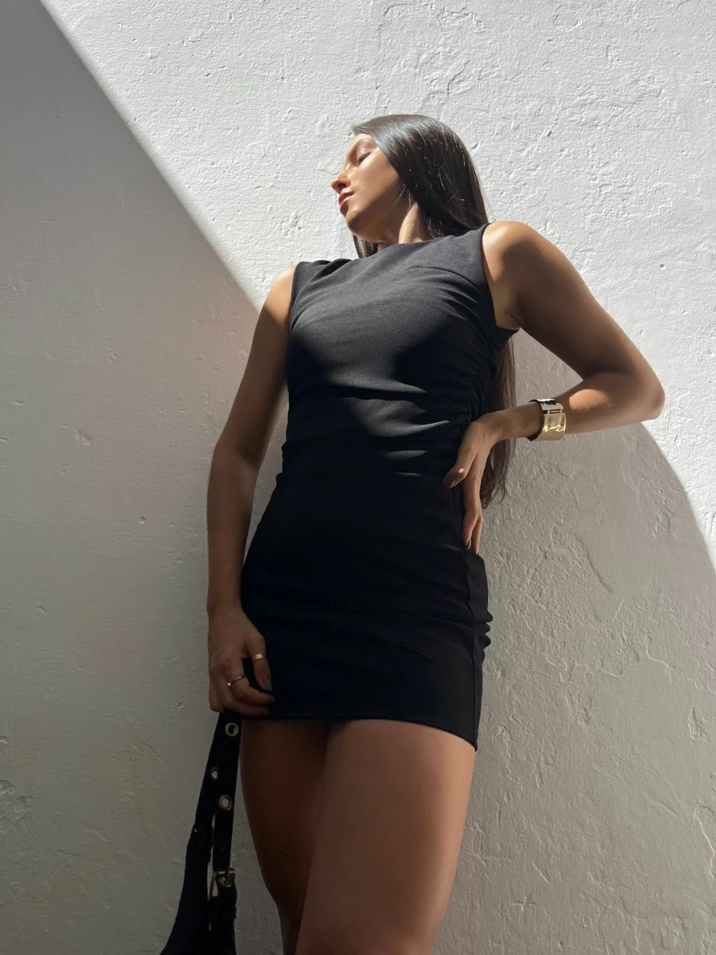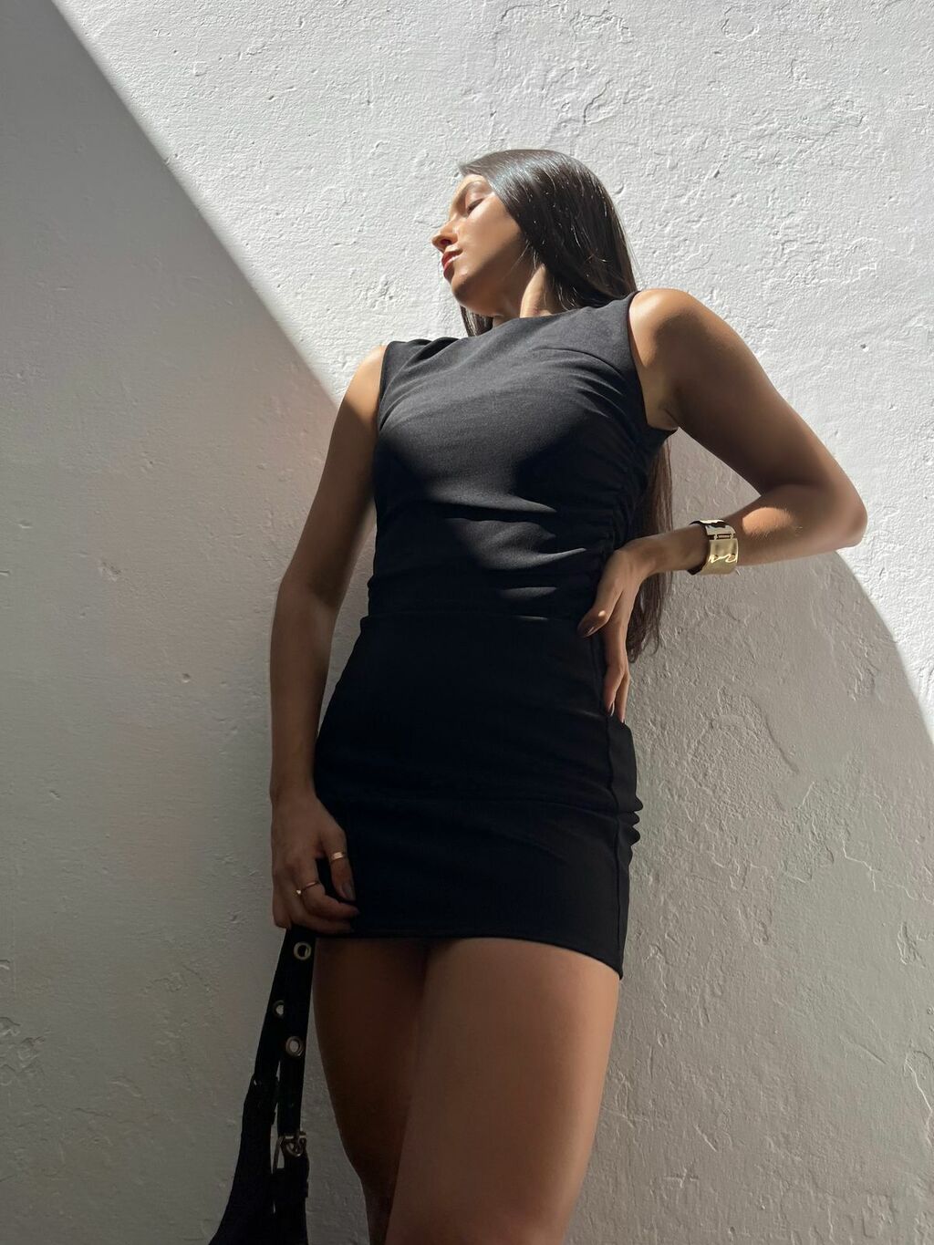 Vestido curto em crepe. Possui alças grossas, caimento ajustado ao corpo e drapeado na lateral da cintura. Possui tecido encorpado, todo forrado. Não marca e não fica transparente.