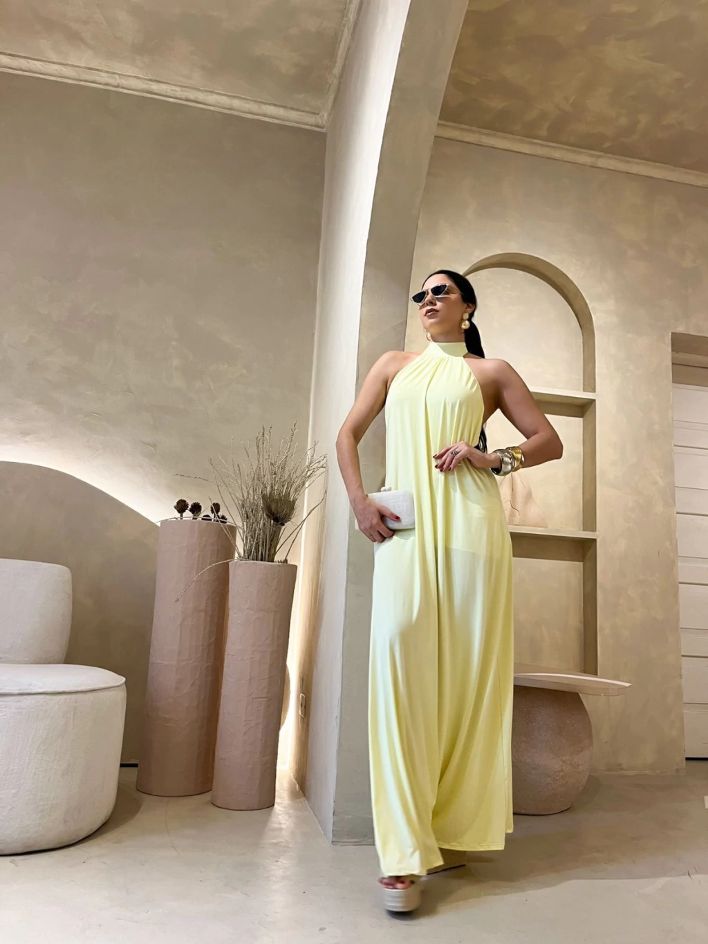 Vestido longo em tecido de poliamida. Possui modelagem solta ao corpo. Possui decote frente única com amarração no pescoço. Possui costas abertas. Possui leve assimetria na barra. Não marca e não fica transparente.