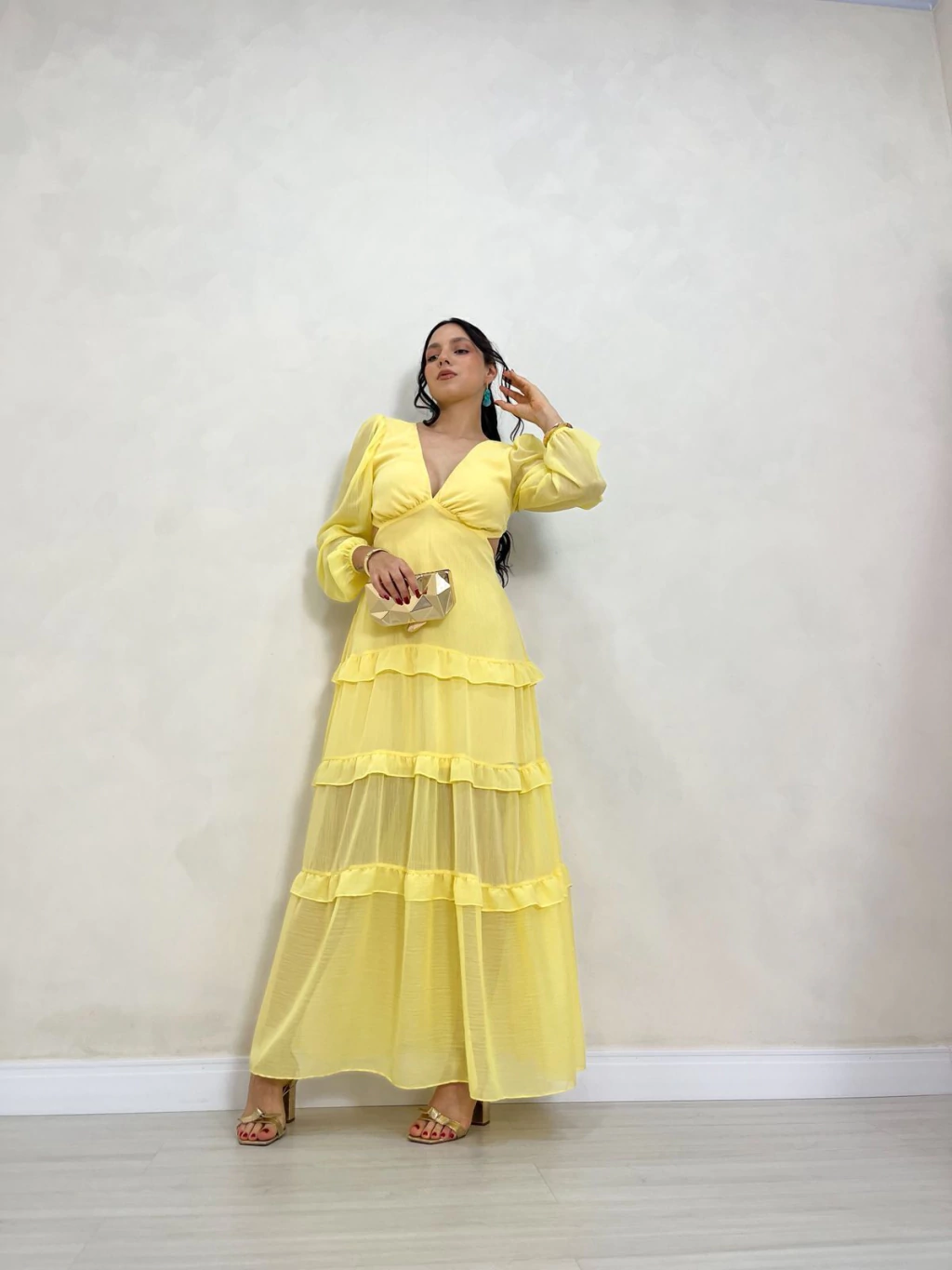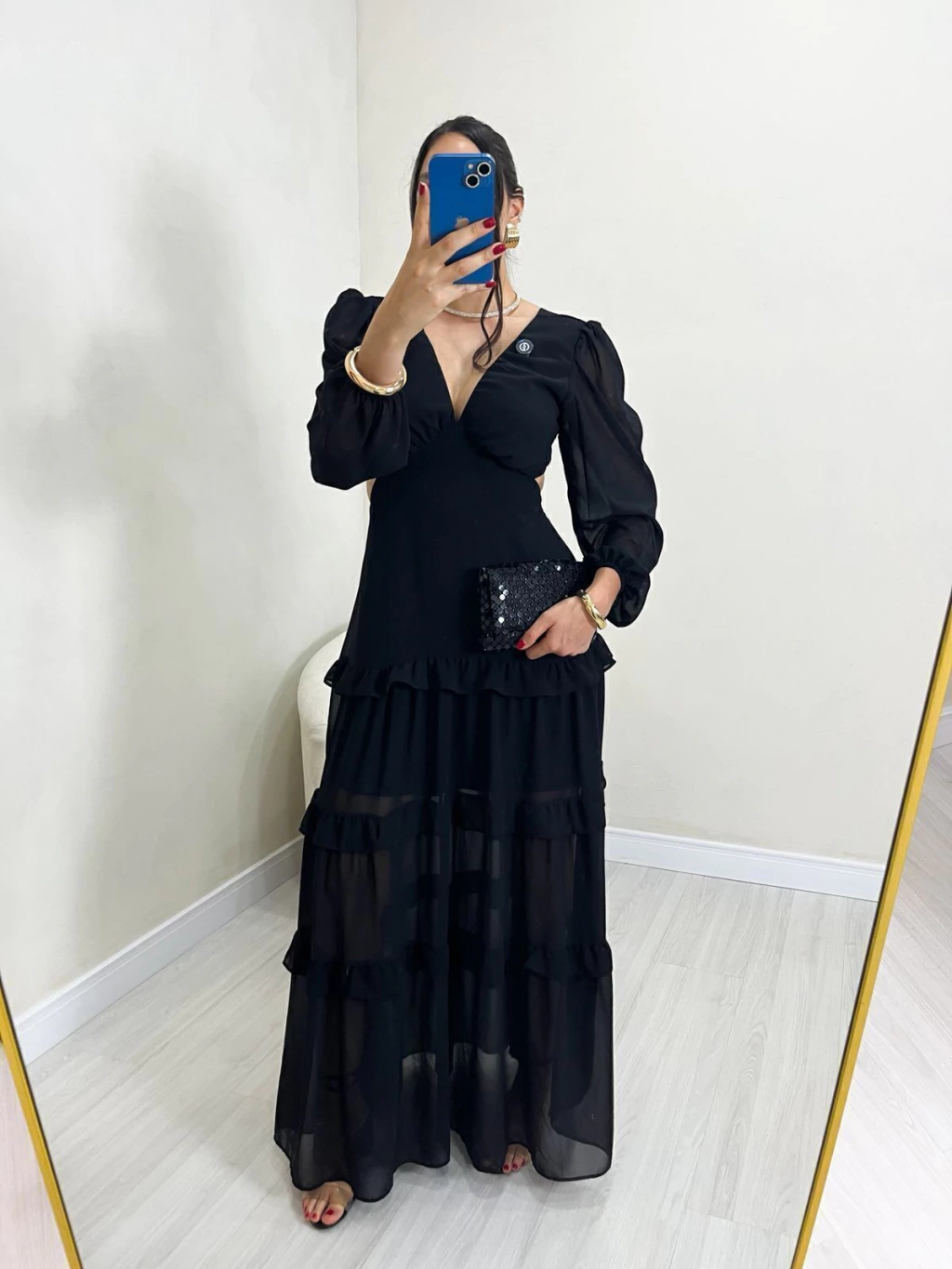 Vestido longo em chiffon. Possui mangas longas, levemente transparente com elástico no punho. Possui decote V e amarração nas costas. Possui costas abertas. Modelo com babados na saia, fluido e possui forro. Não marca e não fica transparente.