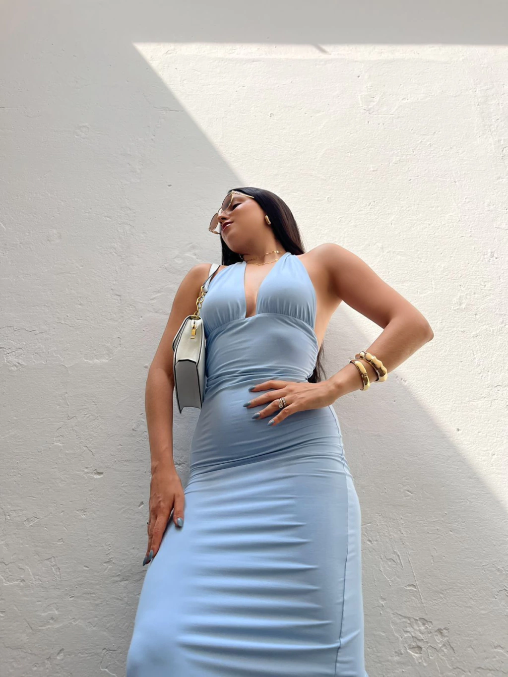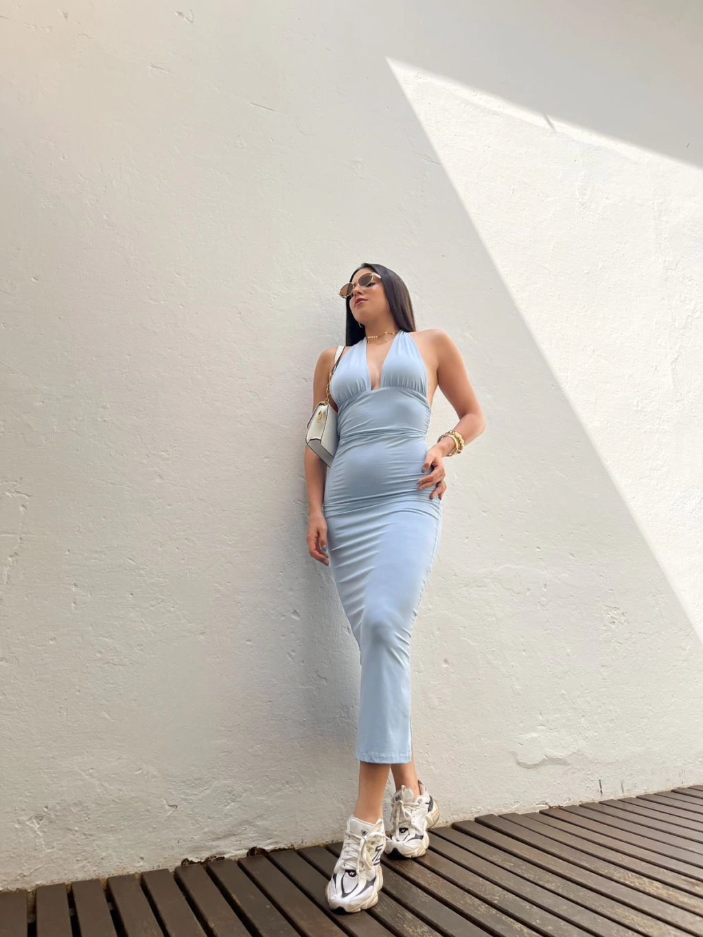 Vestido em poliamida. Possui comprimento midi/longo, decote frete única e as costas aberta. Possui amarração no pescoço para ajuste do decote e amarração atrás. Possui fenda atrás. Modelagem ajustada ao corpo, não marca e não fica transparente.