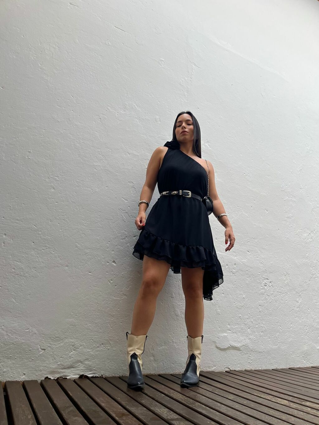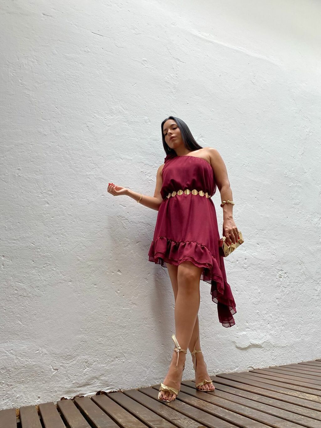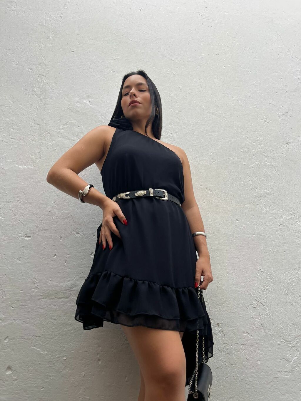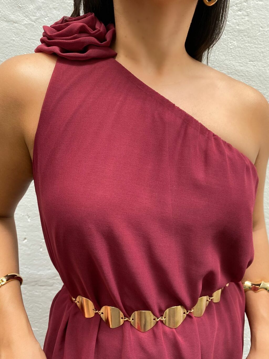 Vestido em chiffon. Possui decote de um ombro. Possui caimento solto ao corpo, com barra assimétrica. Possui detalhe de aplicação de flor na alça. Tecido fluido, com forro. Não marca e não fica transparente.
