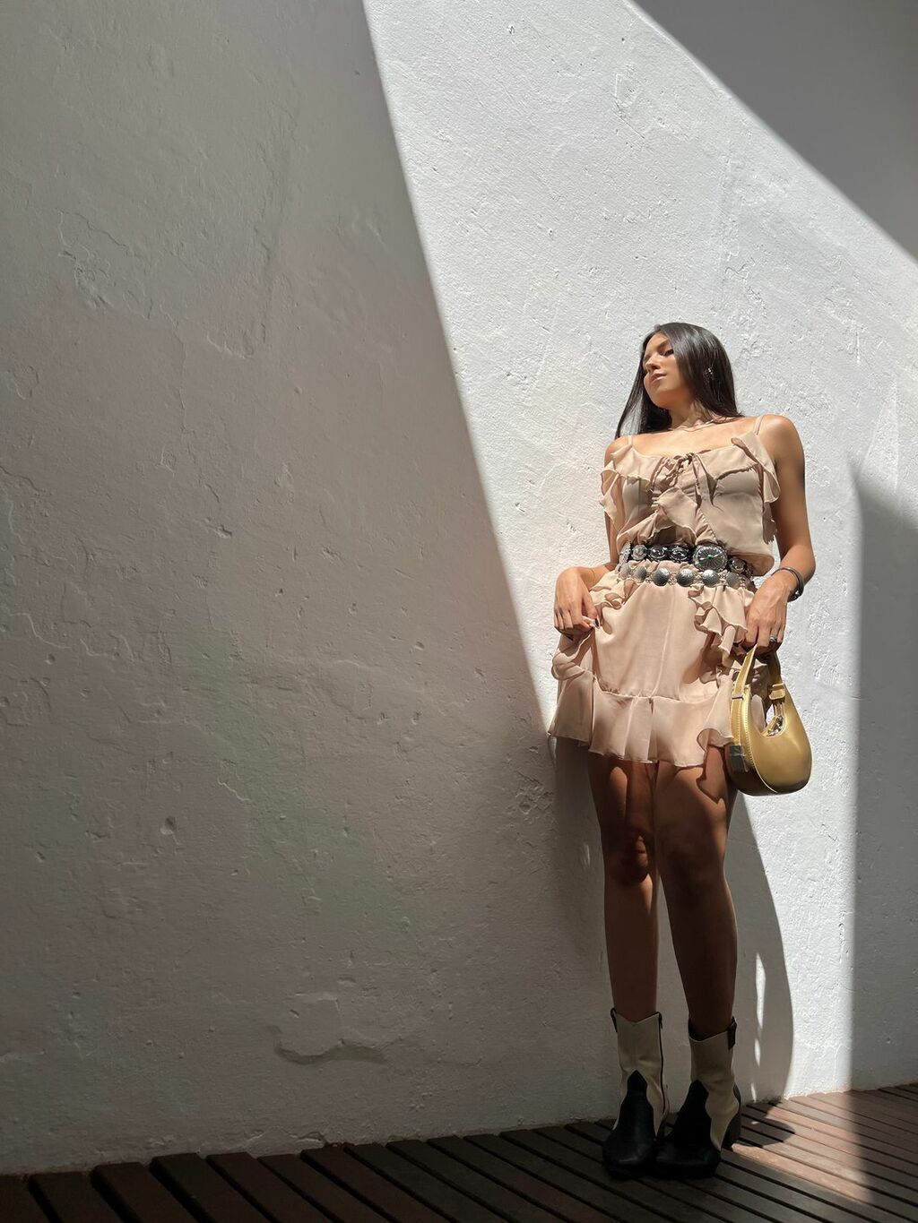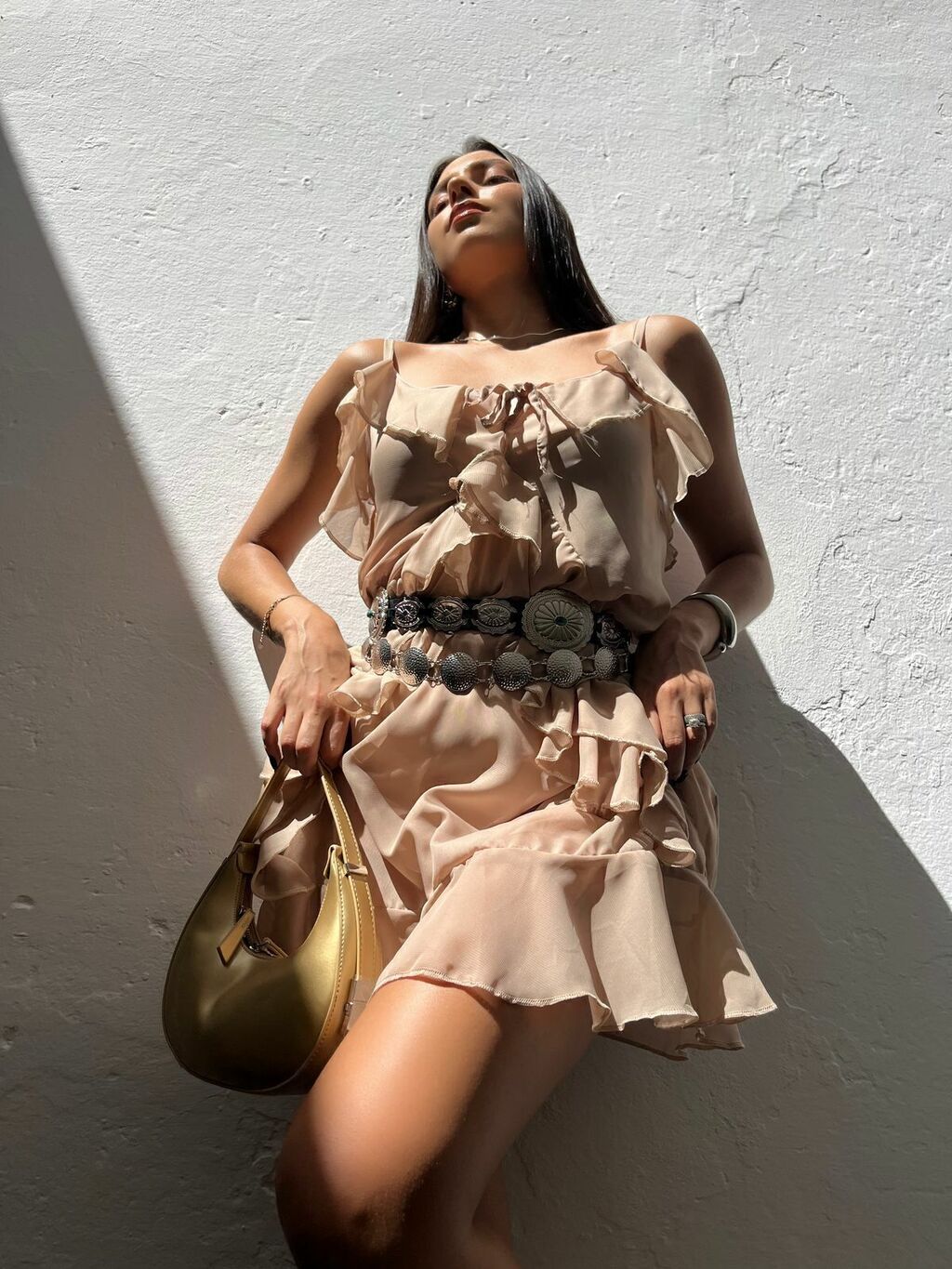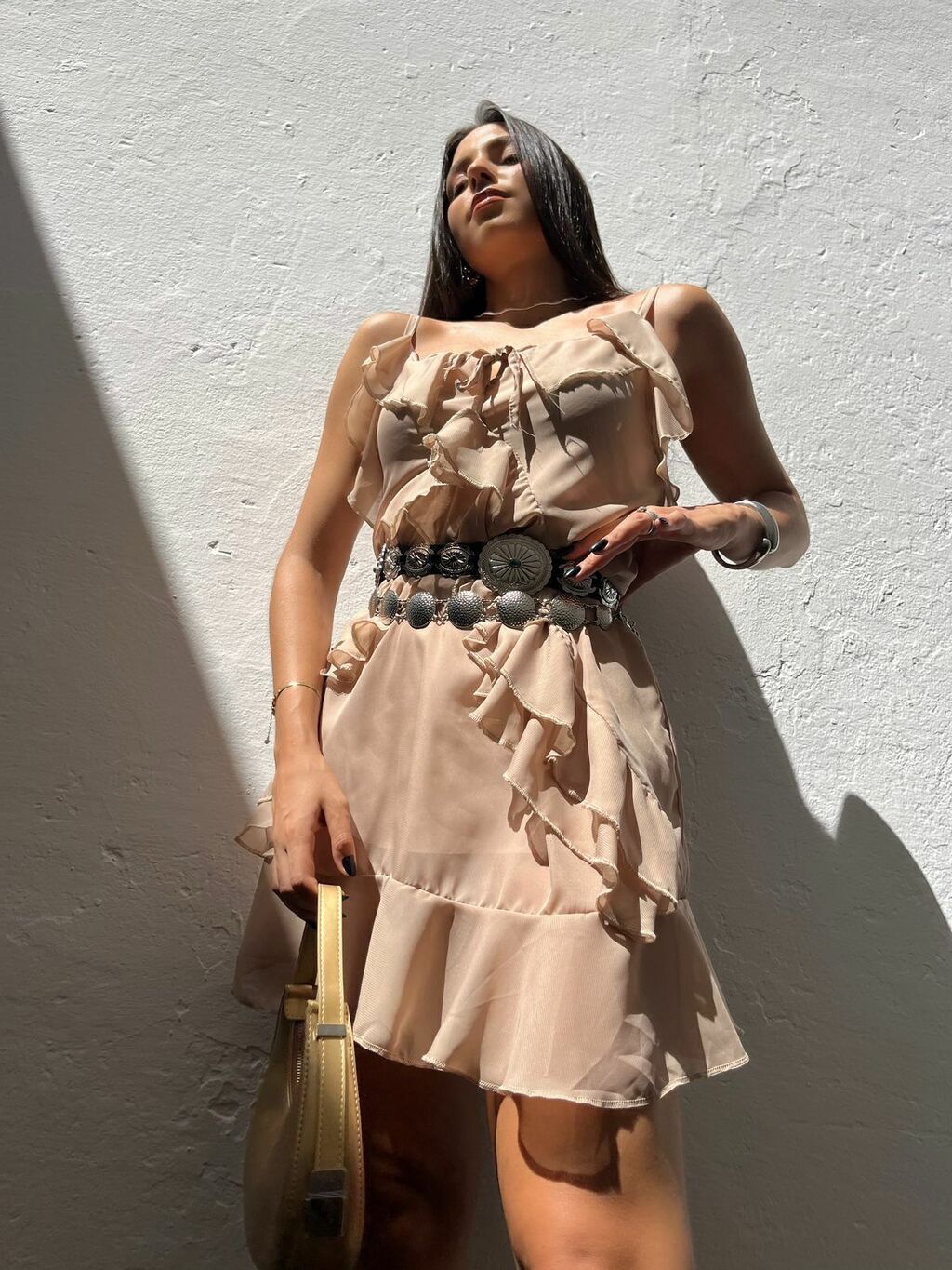 Vestido curto em chiffon. Possui alças finas com regulagem. Possui decote V com babados. Possui modelagem solta ao corpo. Tecido fluído, podendo ser usado com cinto para aquele estilo mais boho. Possui fechamento atrás por zíper normal. Modelagem estilosa e solta ao corpo. Não marca e não fica transparente.